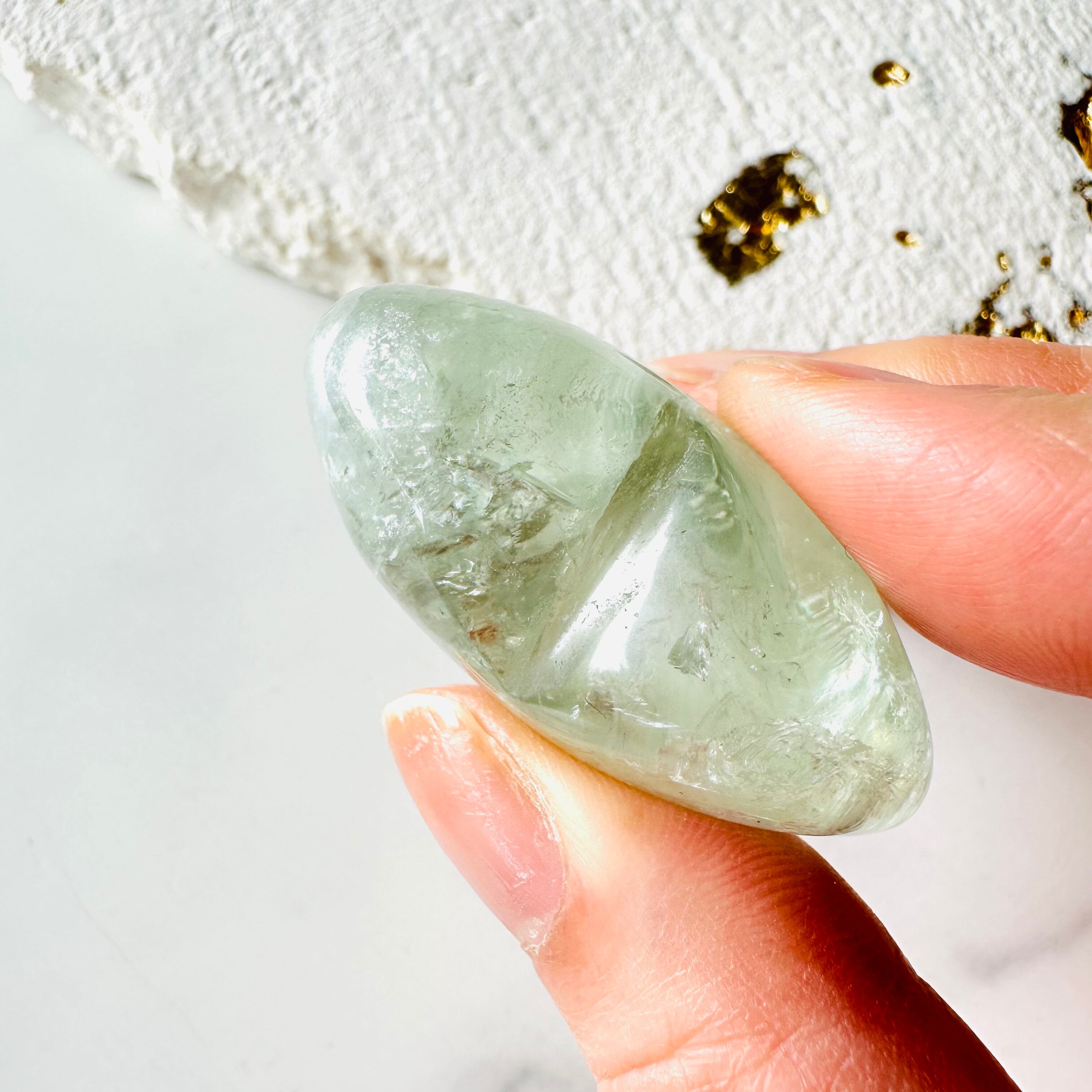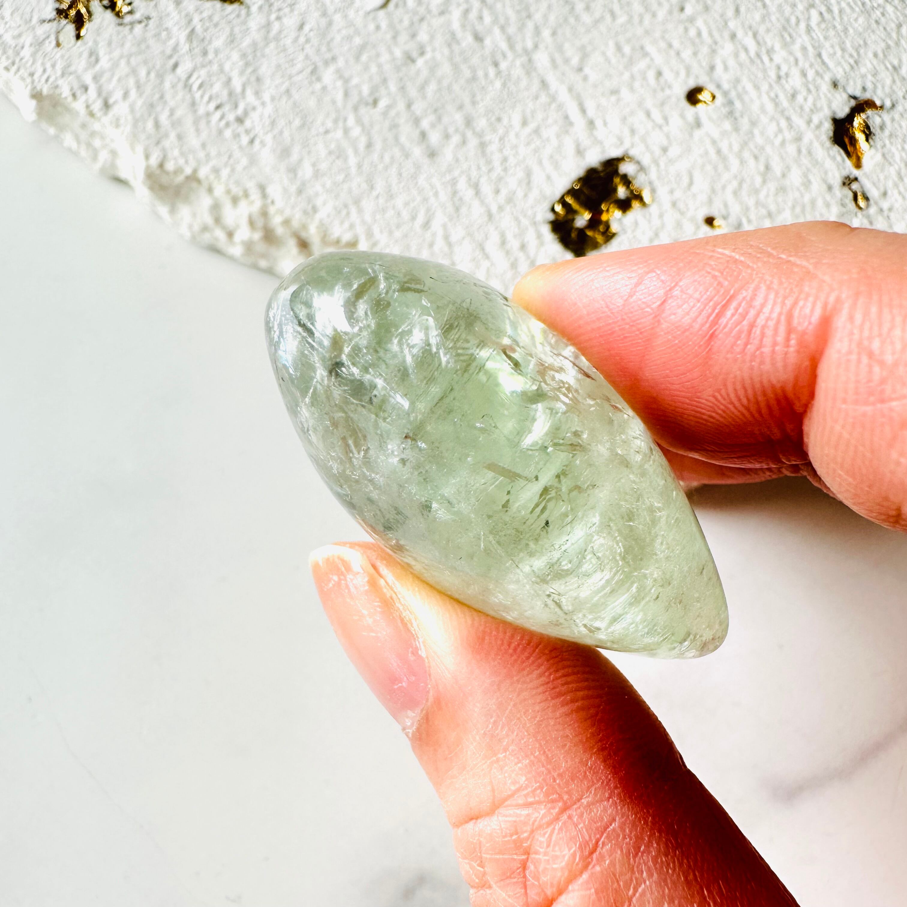 ごく淡い透明感のあるグリーンの瑞々しさが魅力的です。高貴な美しさを持つプラシオライトは、持ち主の存在感を高め、成熟した女性の美しいオーラを最大限に引き出します。高価な石なのでルースで見かけることが多く、このサイズのパームやハートはあまり流通していないように思います。