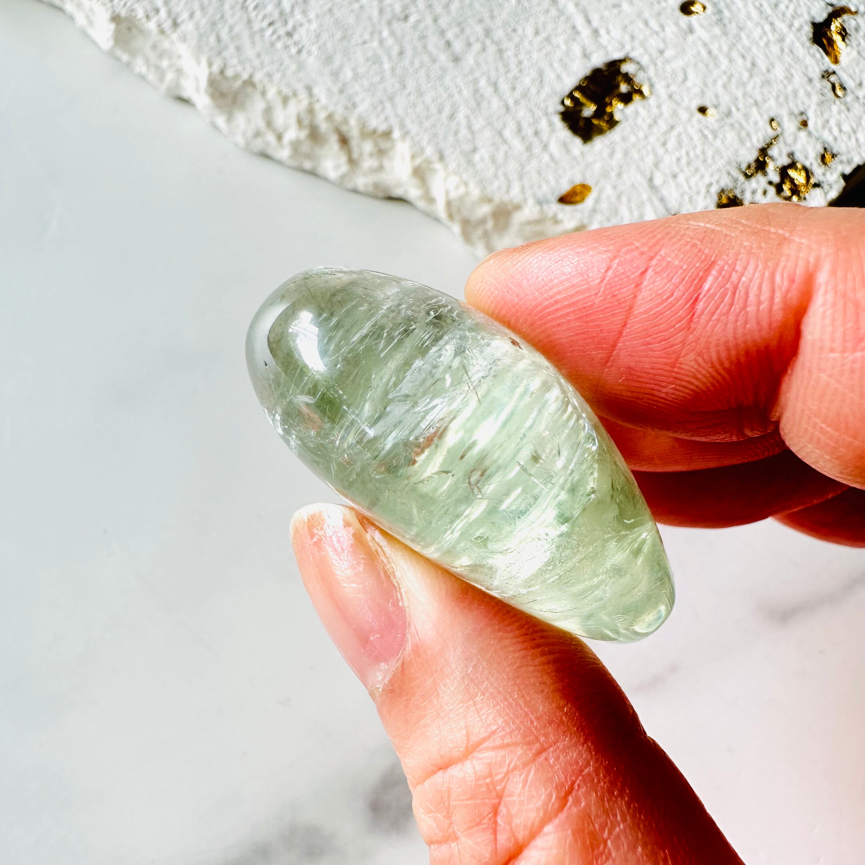 ごく淡い透明感のあるグリーンの瑞々しさが魅力的です。高貴な美しさを持つプラシオライトは、持ち主の存在感を高め、成熟した女性の美しいオーラを最大限に引き出します。高価な石なのでルースで見かけることが多く、このサイズのパームやハートはあまり流通していないように思います。