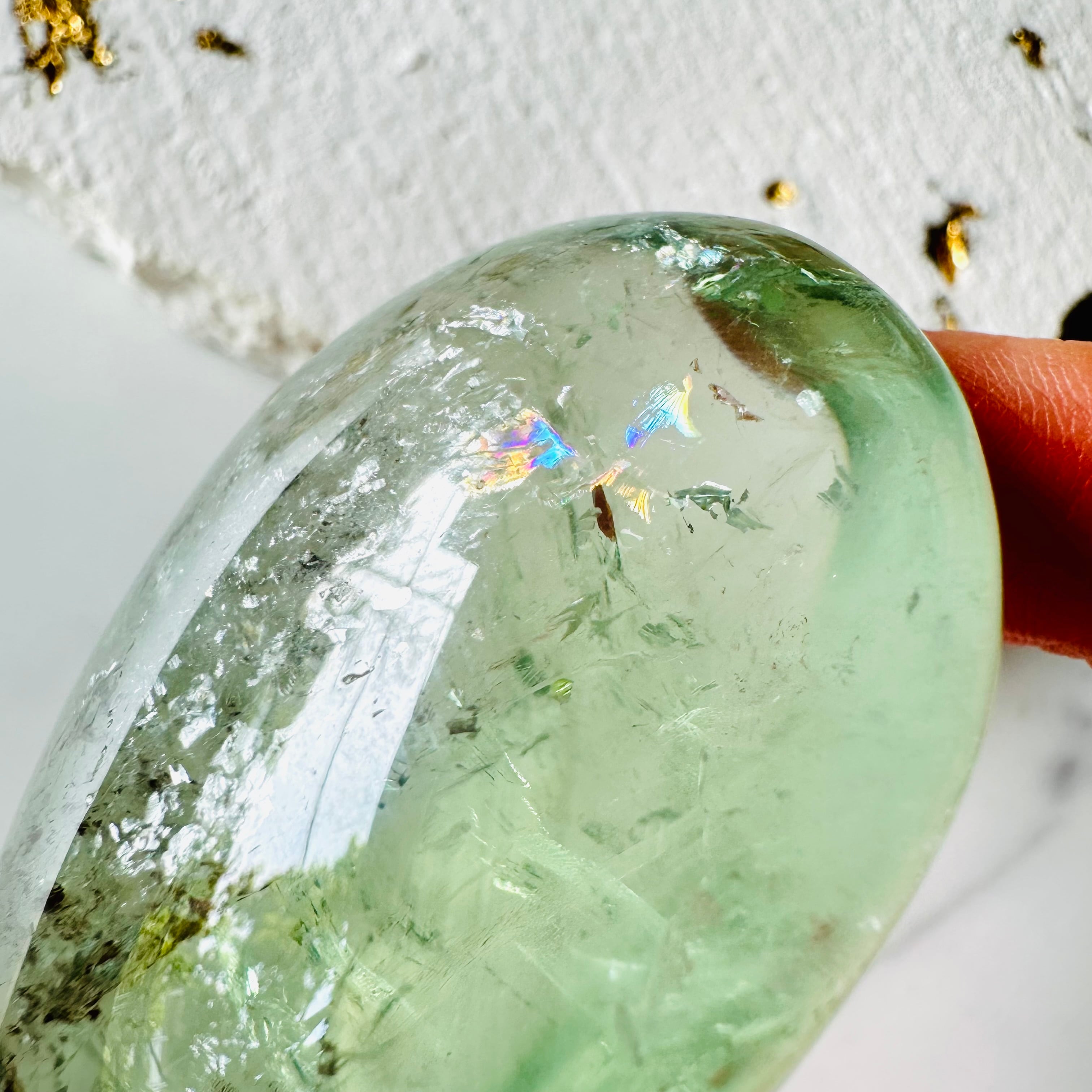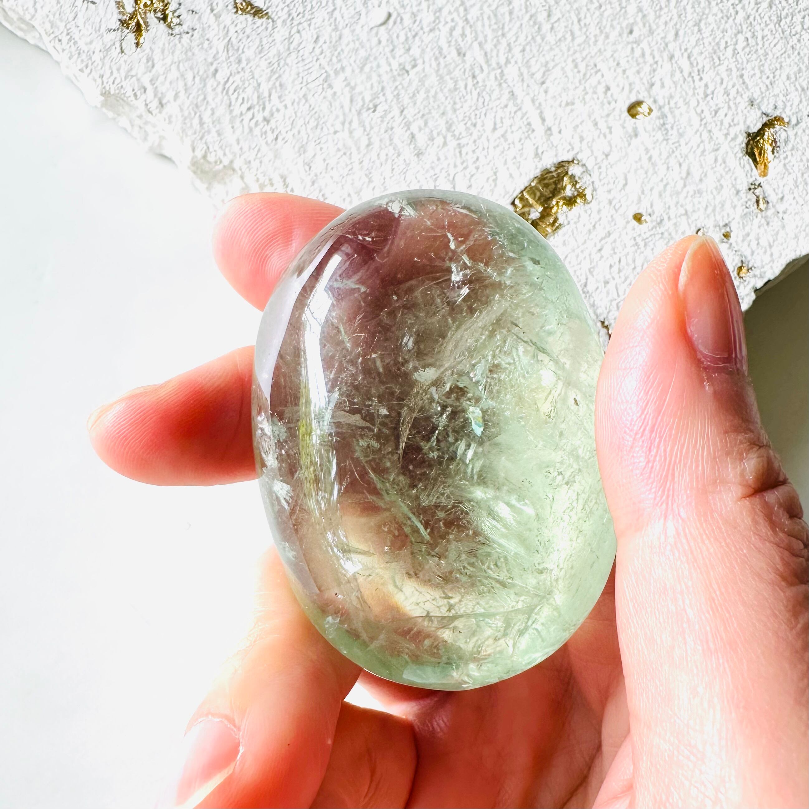ごく淡い透明感のあるグリーンの瑞々しさが魅力的です。高貴な美しさを持つプラシオライトは、持ち主の存在感を高め、成熟した女性の美しいオーラを最大限に引き出します。高価な石なのでルースで見かけることが多く、このサイズのパームやハートはあまり流通していないように思います。