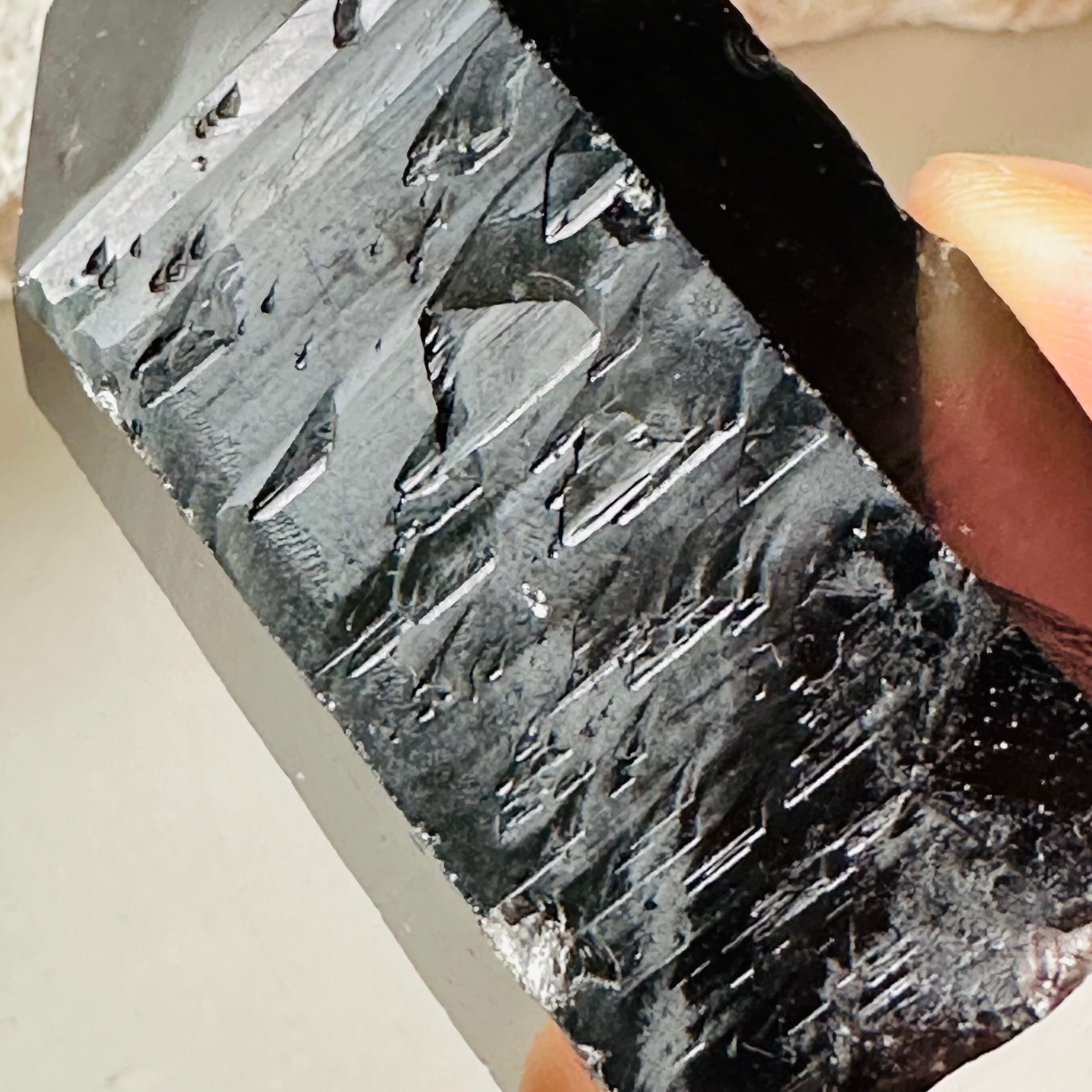 レムリアン水晶は結晶の面に刻まれたレムリアンリッジと呼ばれるバーコード状の模様が特徴です。天然スモーキーのレムリアンは大変希少なレアストーンです。擦りガラスのような表面の内部は透明度と輝きが非常に美しく、太古の昔に繁栄した超文明レムリアの叡智が感じられます。魔除けやグラウディングの優れた能力を持つスピリチュアルなストーンです。