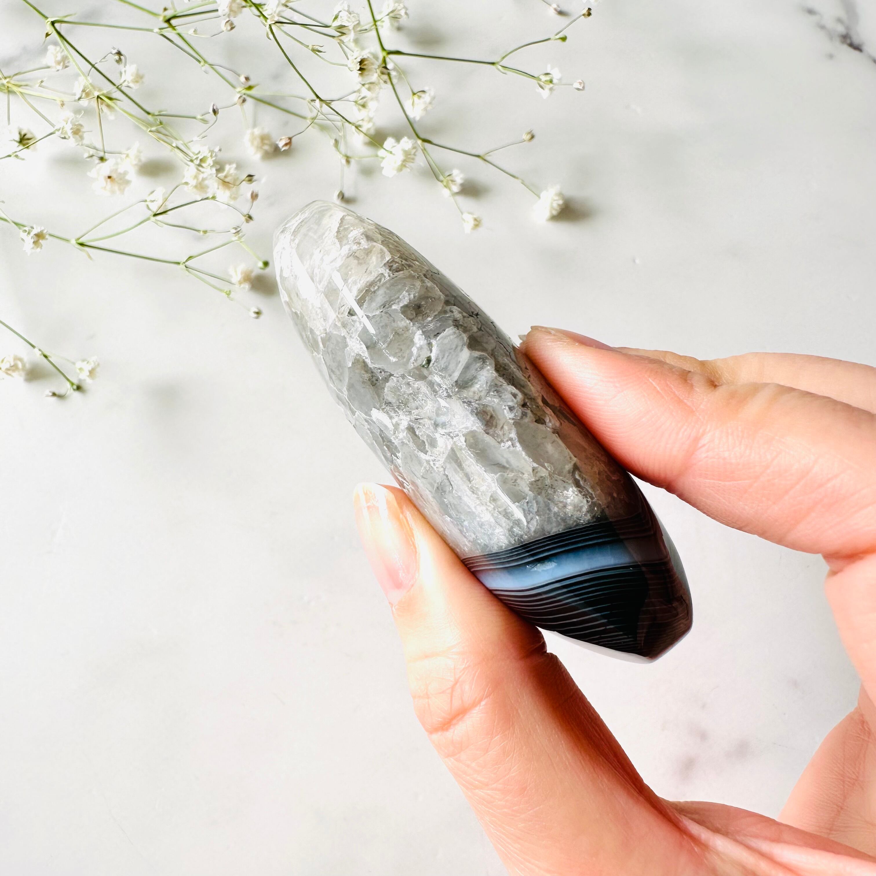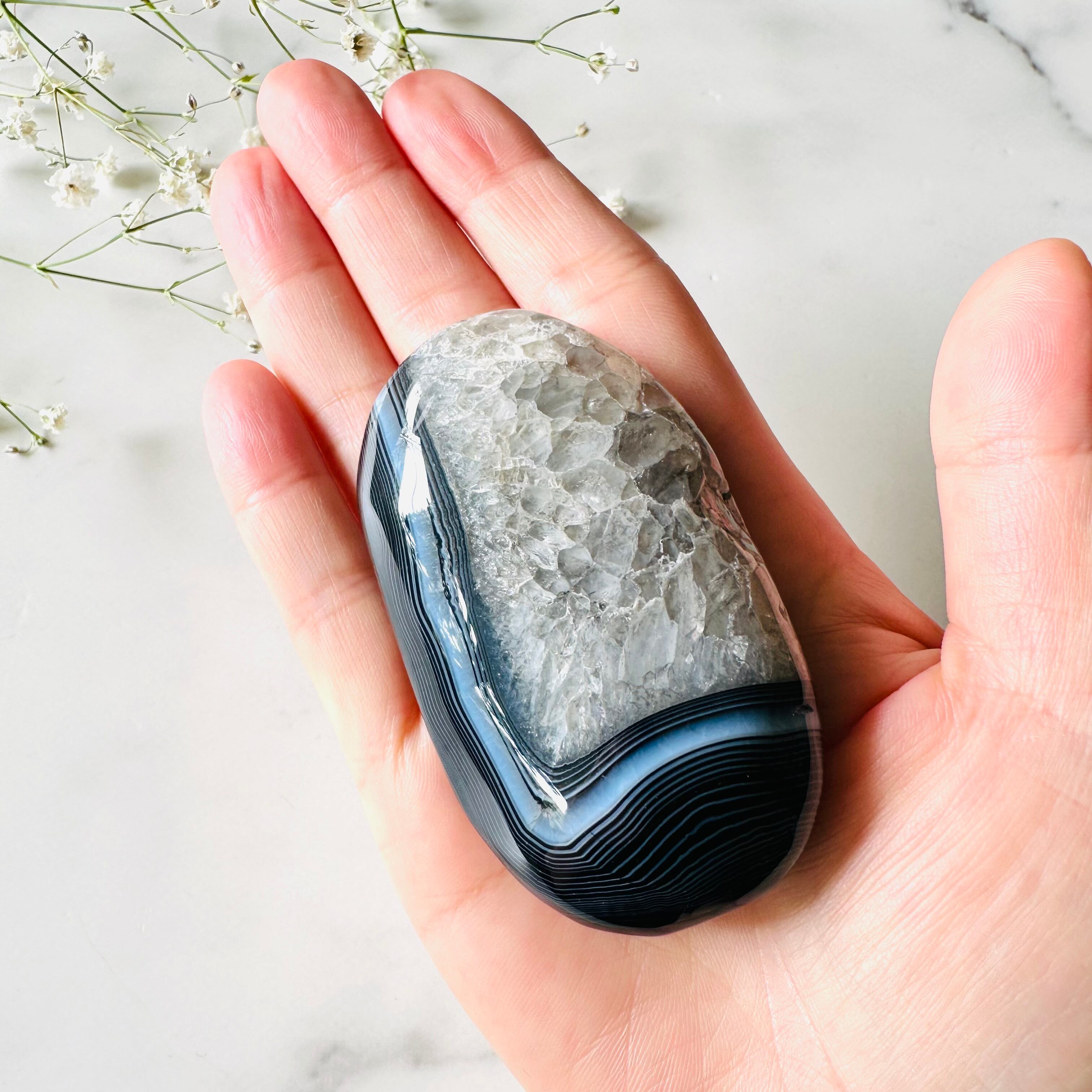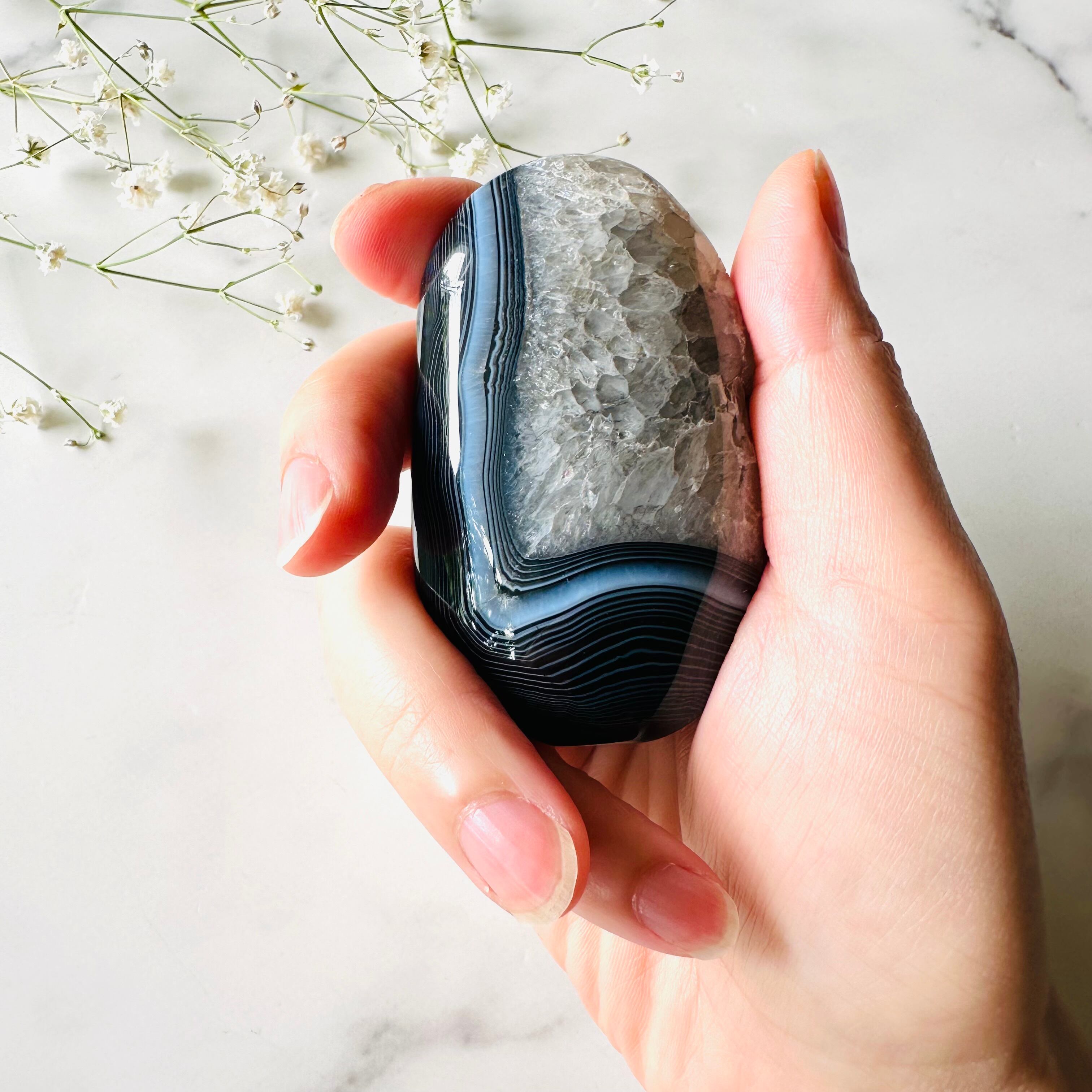 ぎっしり詰まったクォーツの美しさも去ることながら、ブルーとブラックが幾重にも重なったアゲート特有の縞模様が最大の魅力です。同時入荷した他のブラックアゲートには青を含む個体はありません。唯一無二の特別なアイテムです。少し大きめでしっかり握れるサイズです。