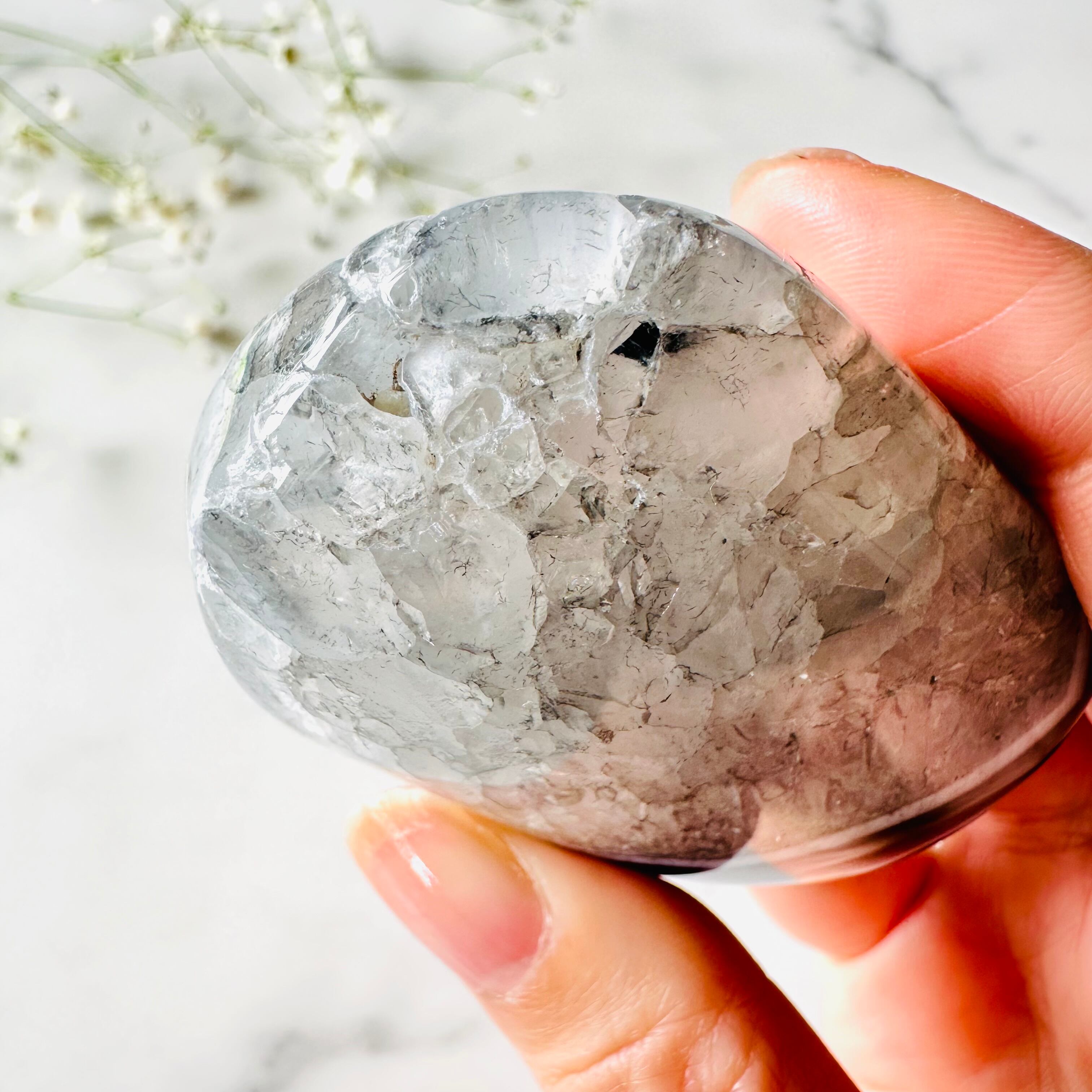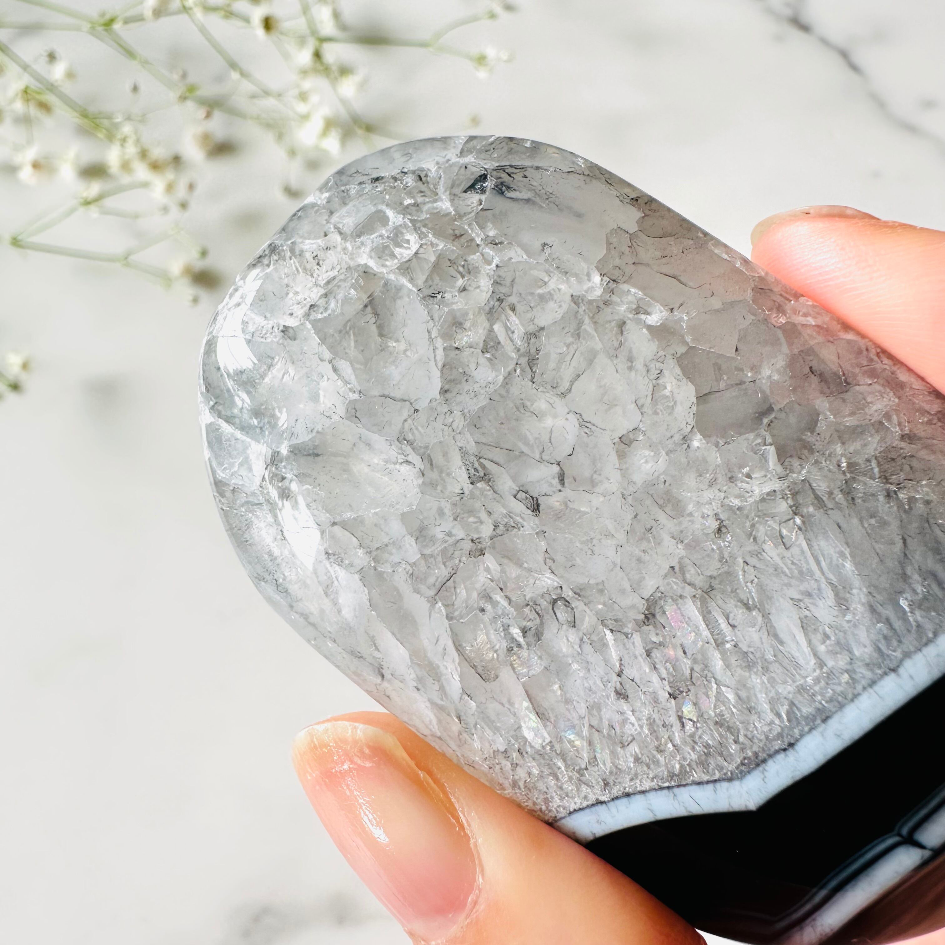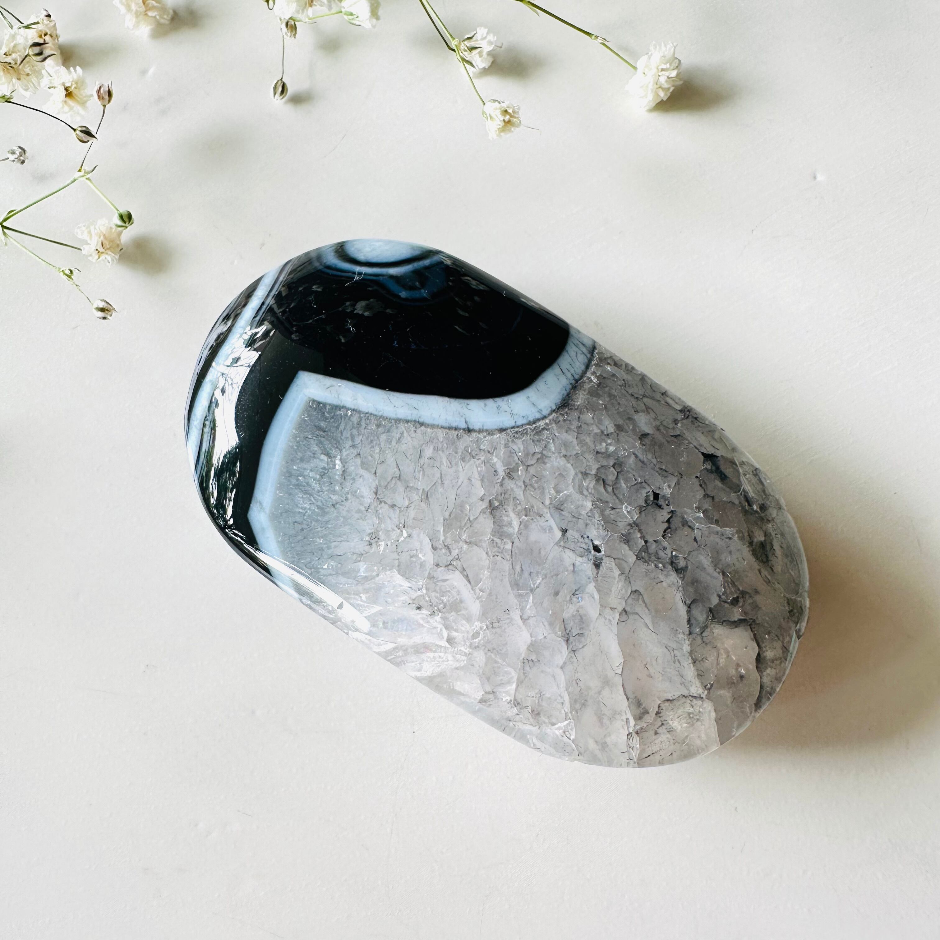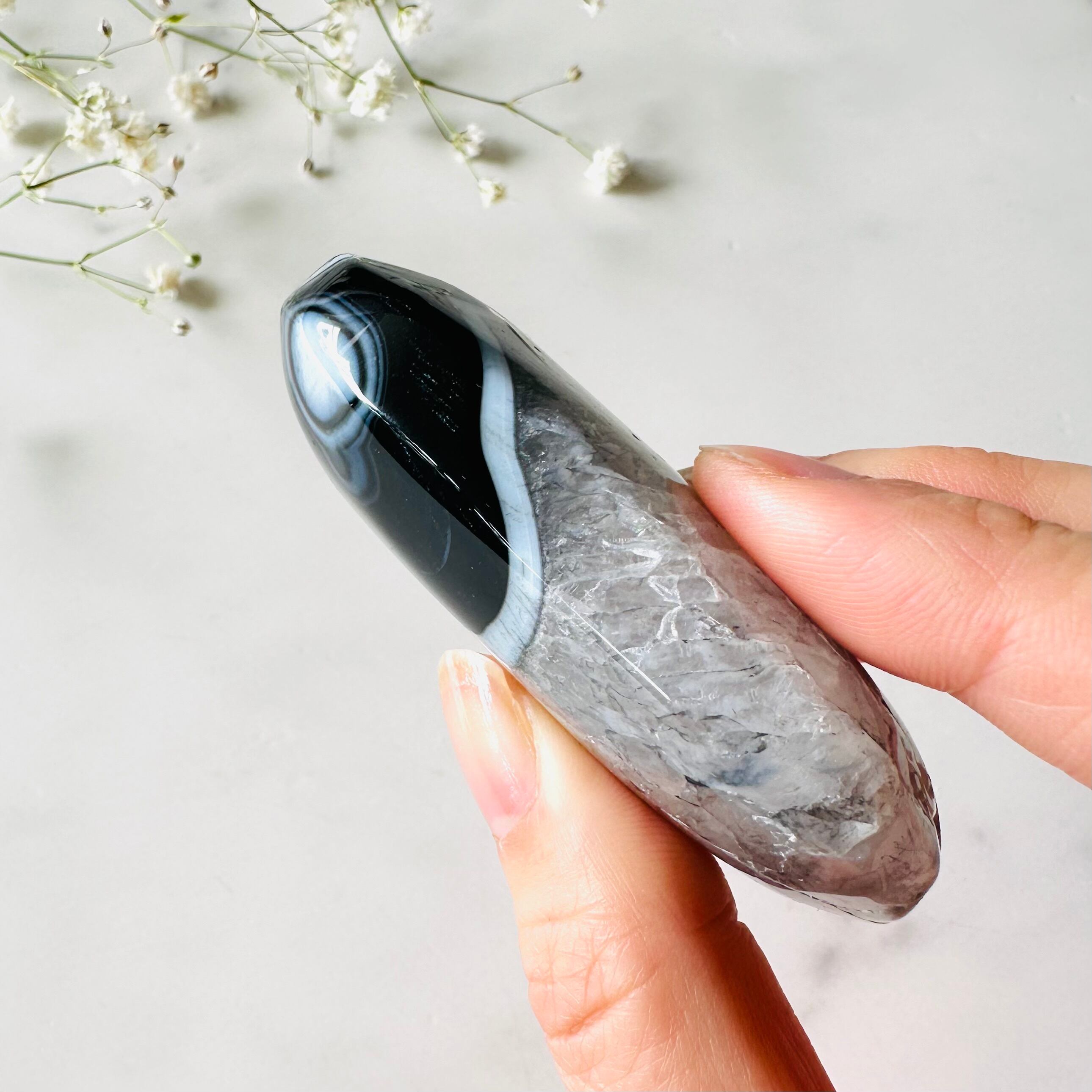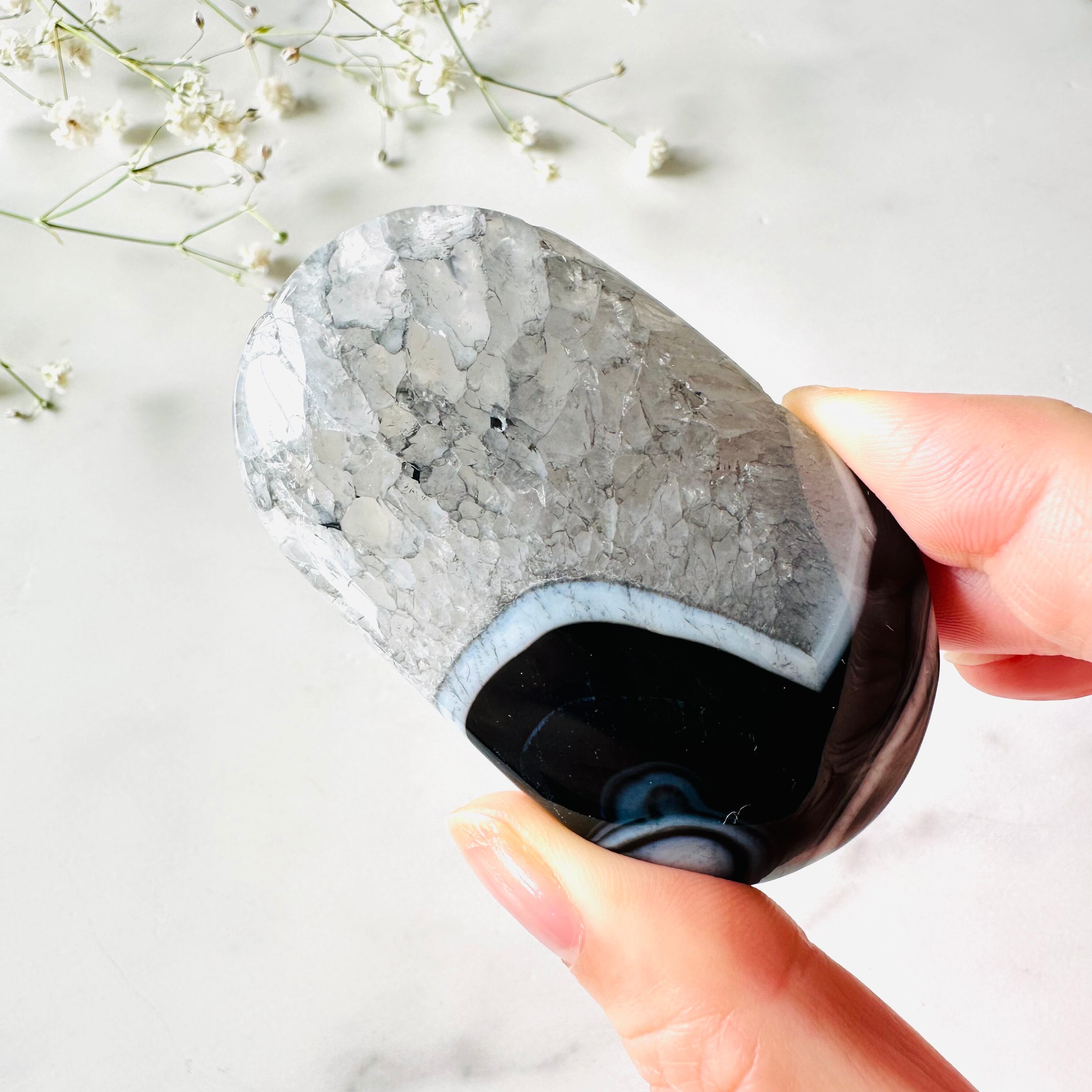 ぎっしり詰まったクォーツの美しさも去ることながら、アゲート特有の個性ある縞模様が最大の魅力です。少し大きめでしっかり握れるサイズです。