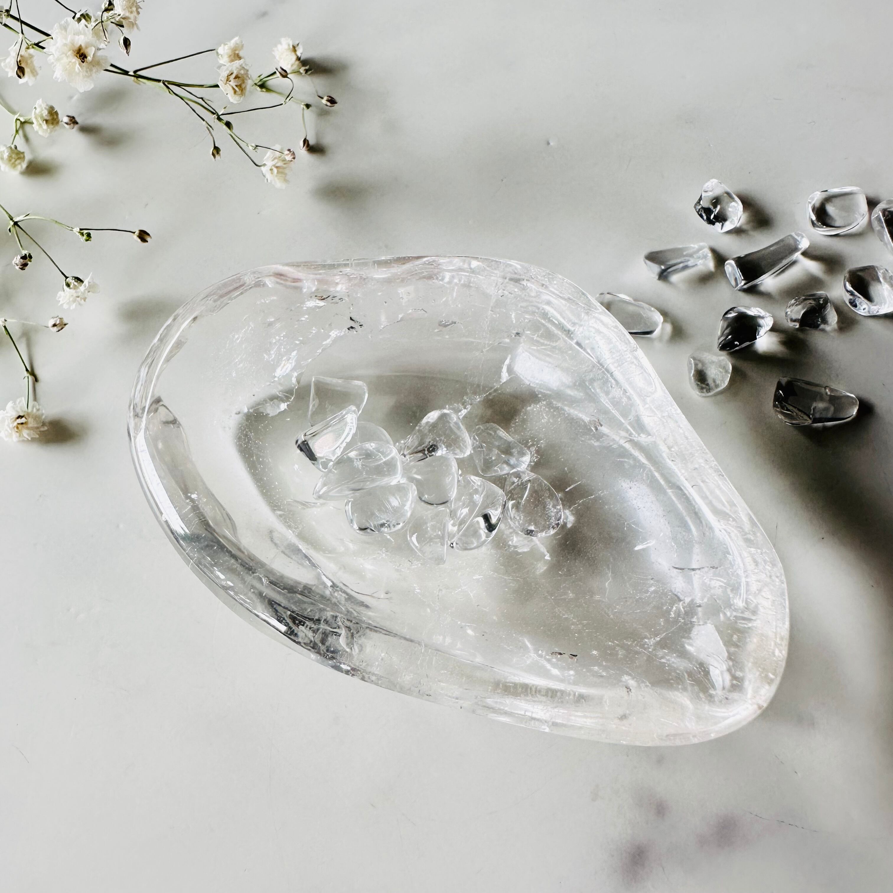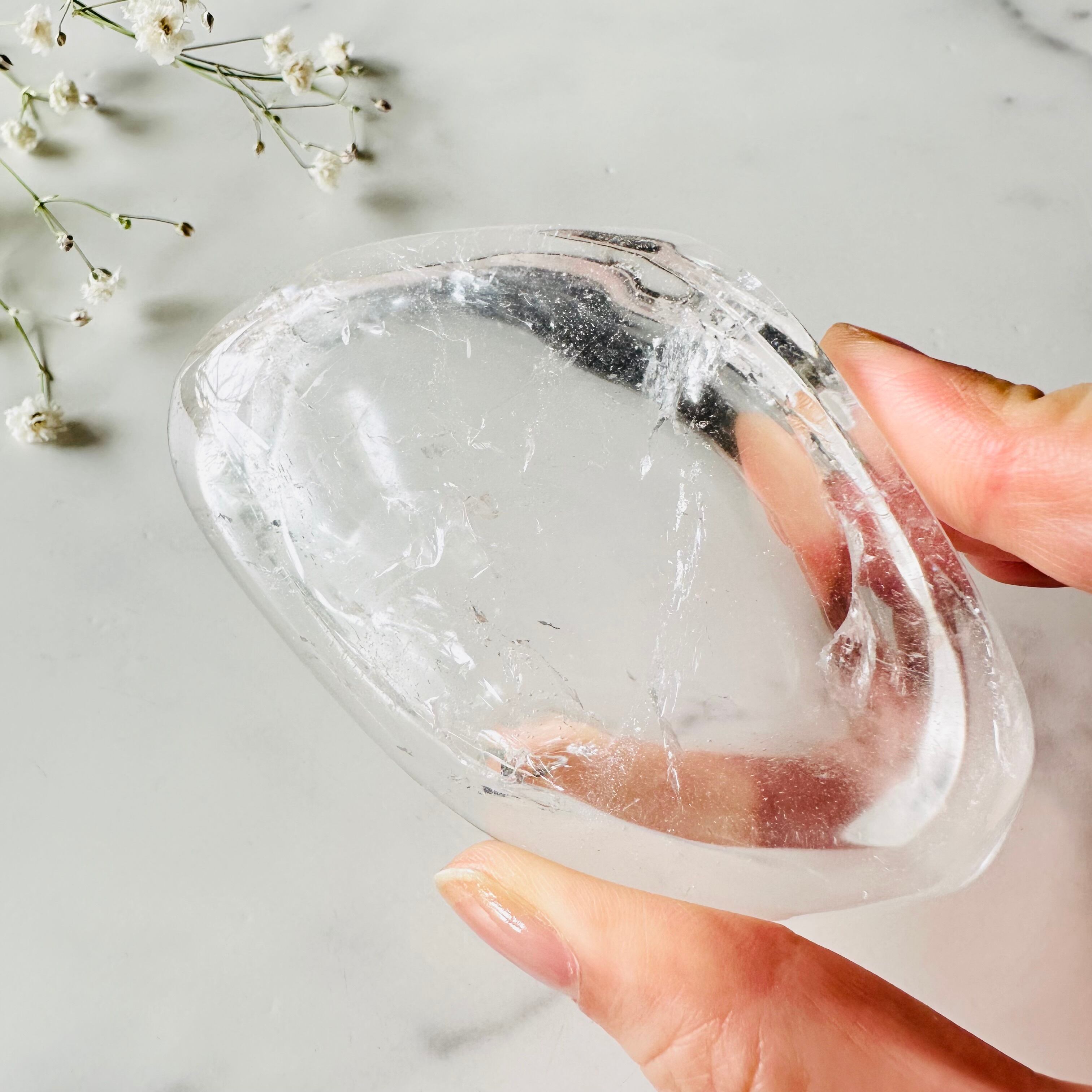 クォーツの透明感と光沢がとても綺麗です。曲線の美しい形で深めのタイプです。可愛い虹も見られます。お気に入りのアクセサリーを置けば、寝ている間に水晶の浄化力が働き、マイナスのエネルギーを放出して翌朝にはクリアな状態でまたお使いいただけます。