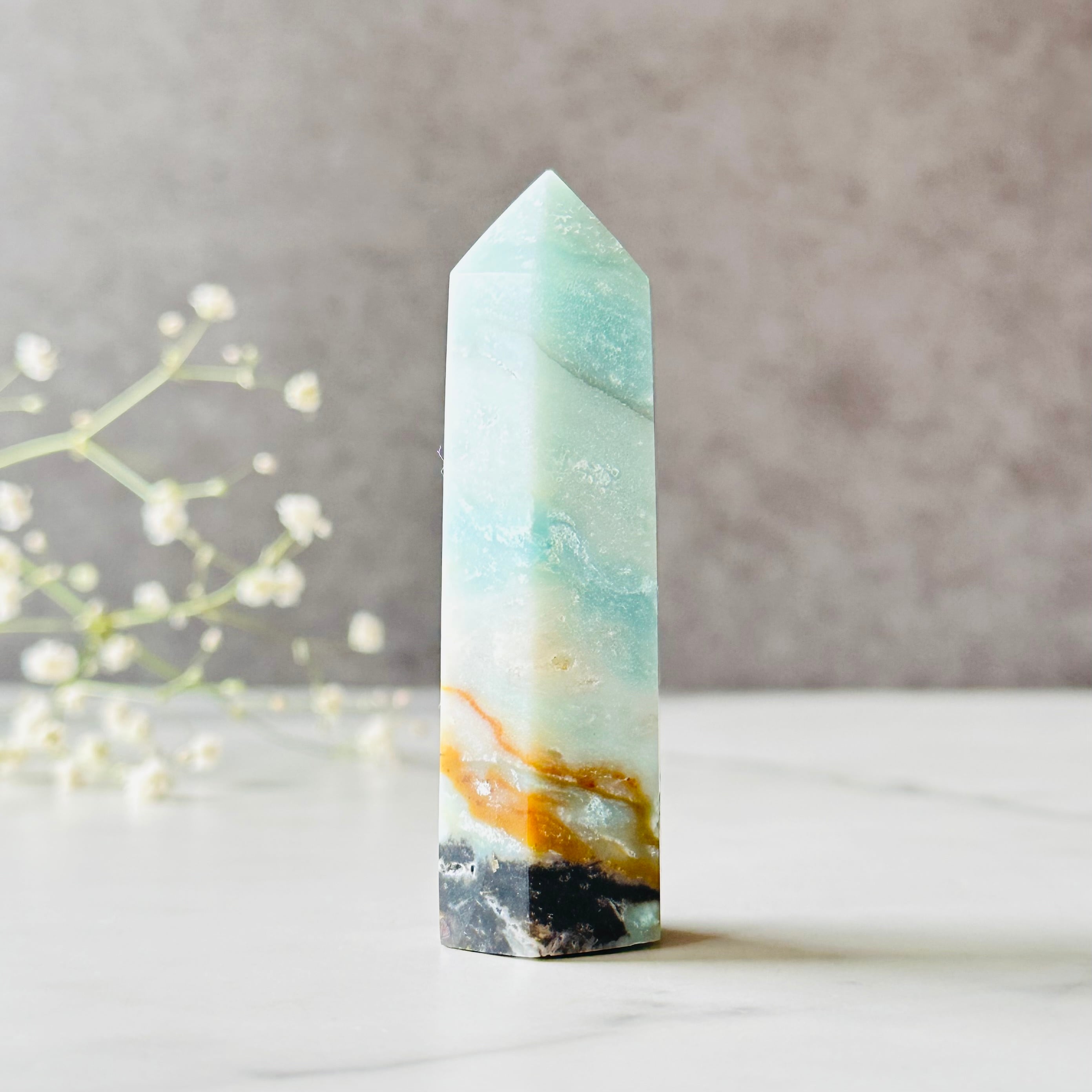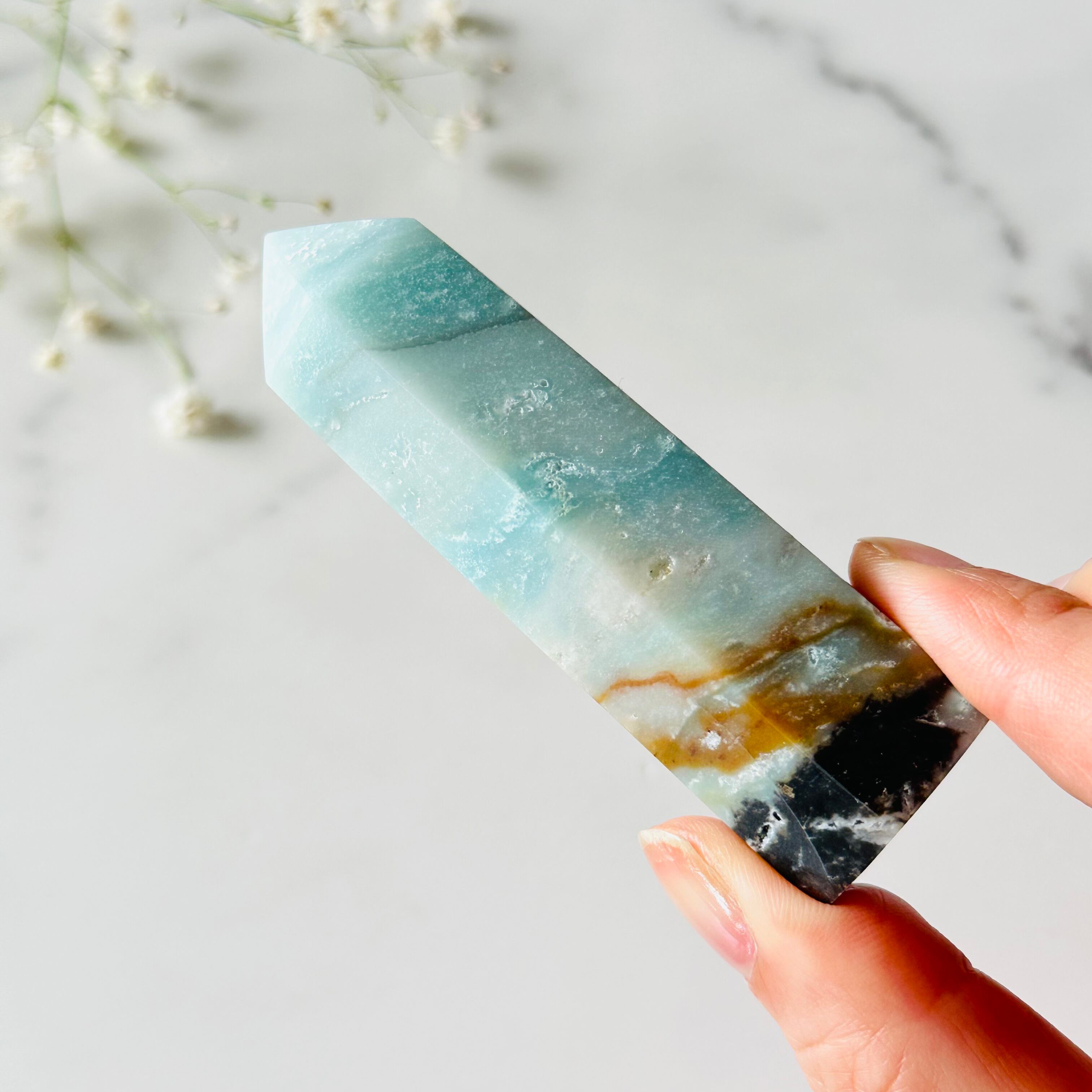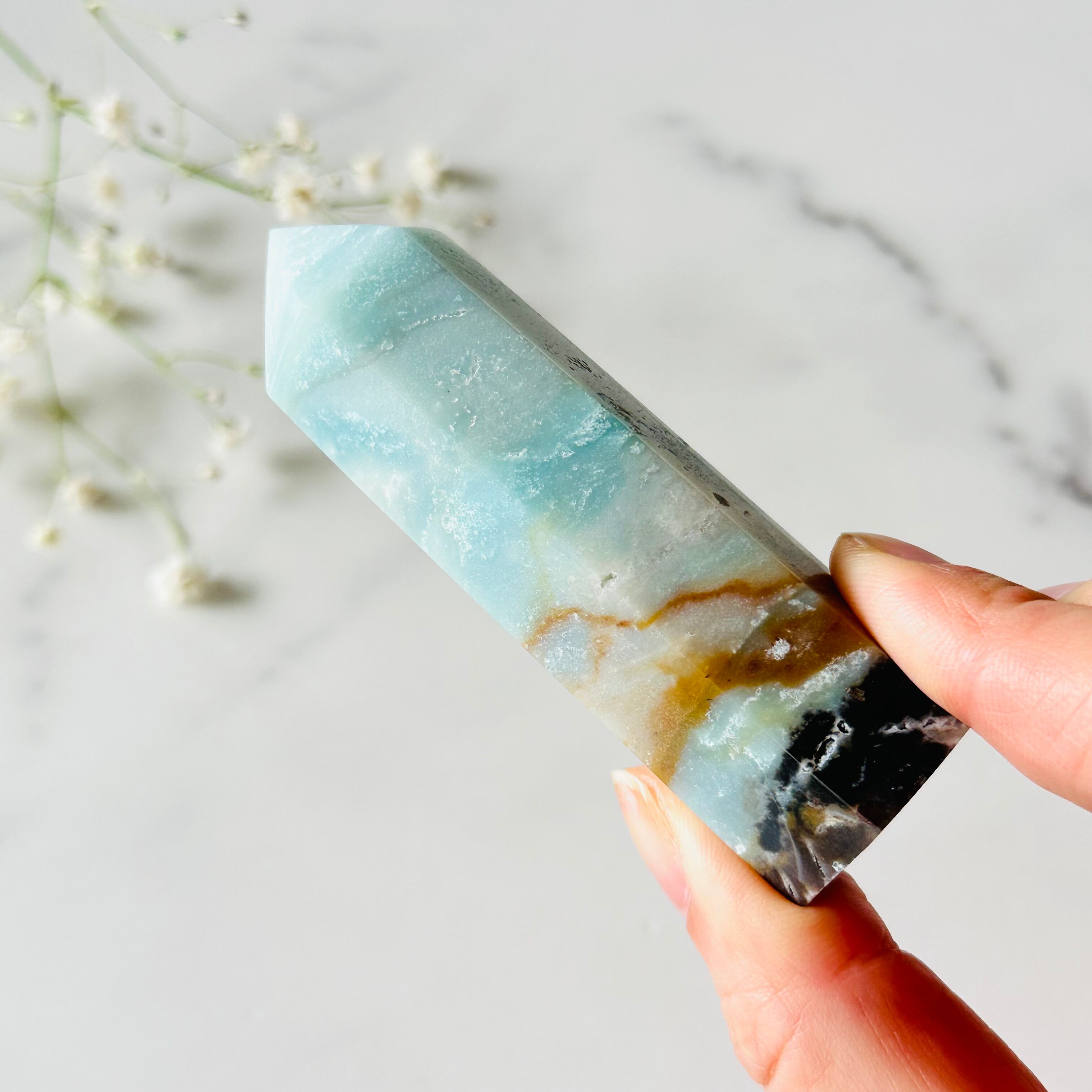 アラゴナイトは優しい黄色の天然石ですが、稀にブルーの発色を持つものが存在します。繊細なブルーと白のマーブル模様が美しいコントラストを描き出すブルーアラゴナイト。古代から愛されてきた気持ちを明るく安定させてくれる石です。穏やかな優しいブルーが癒しを感じさせてくれる希少価値の高いレアストーンです。