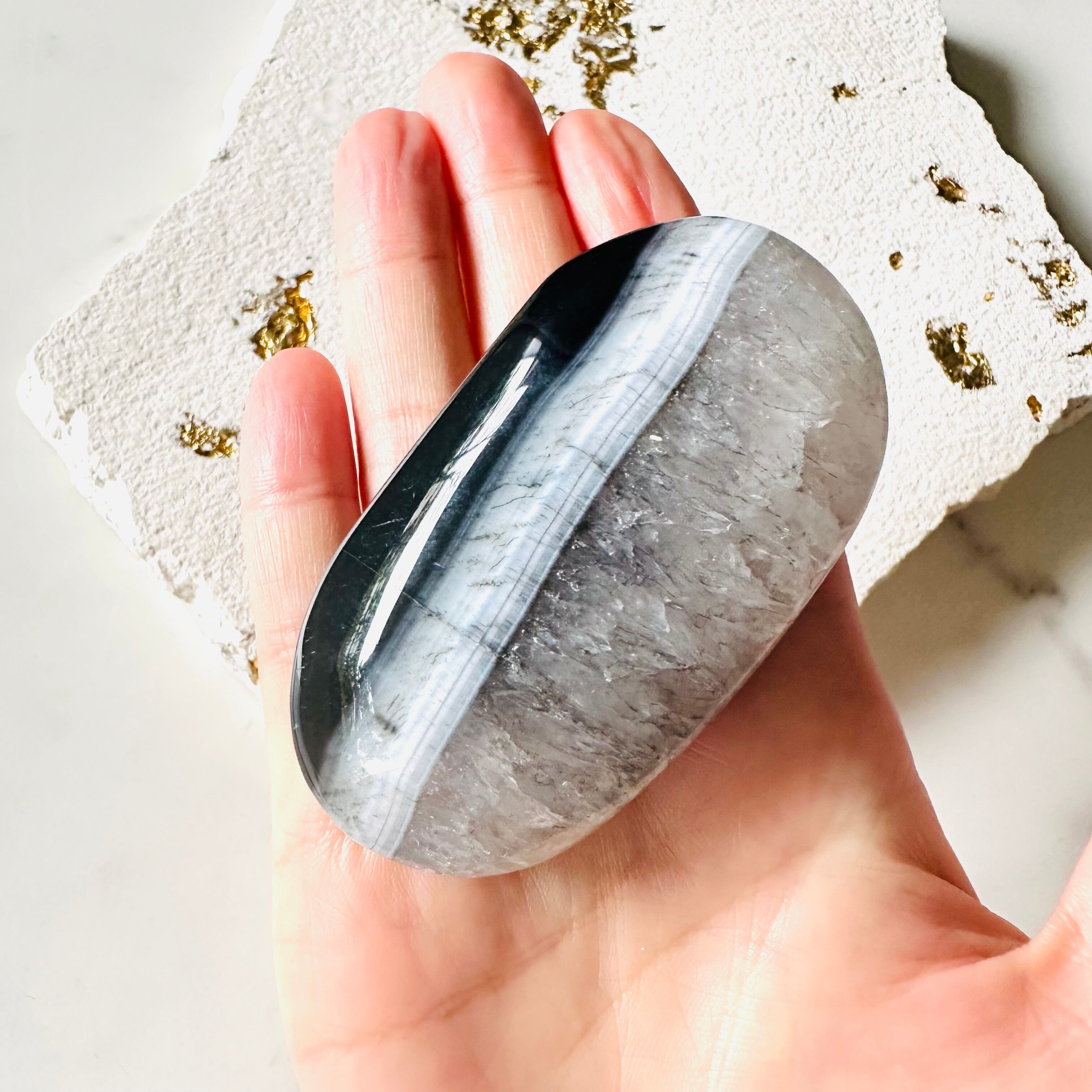 ぎっしり詰まったクォーツの美しさが魅力で無数の虹がキラキラと輝きます。まっすぐ入った白いラインが凛々しいアイテムです。男性への贈り物にもどうぞ。