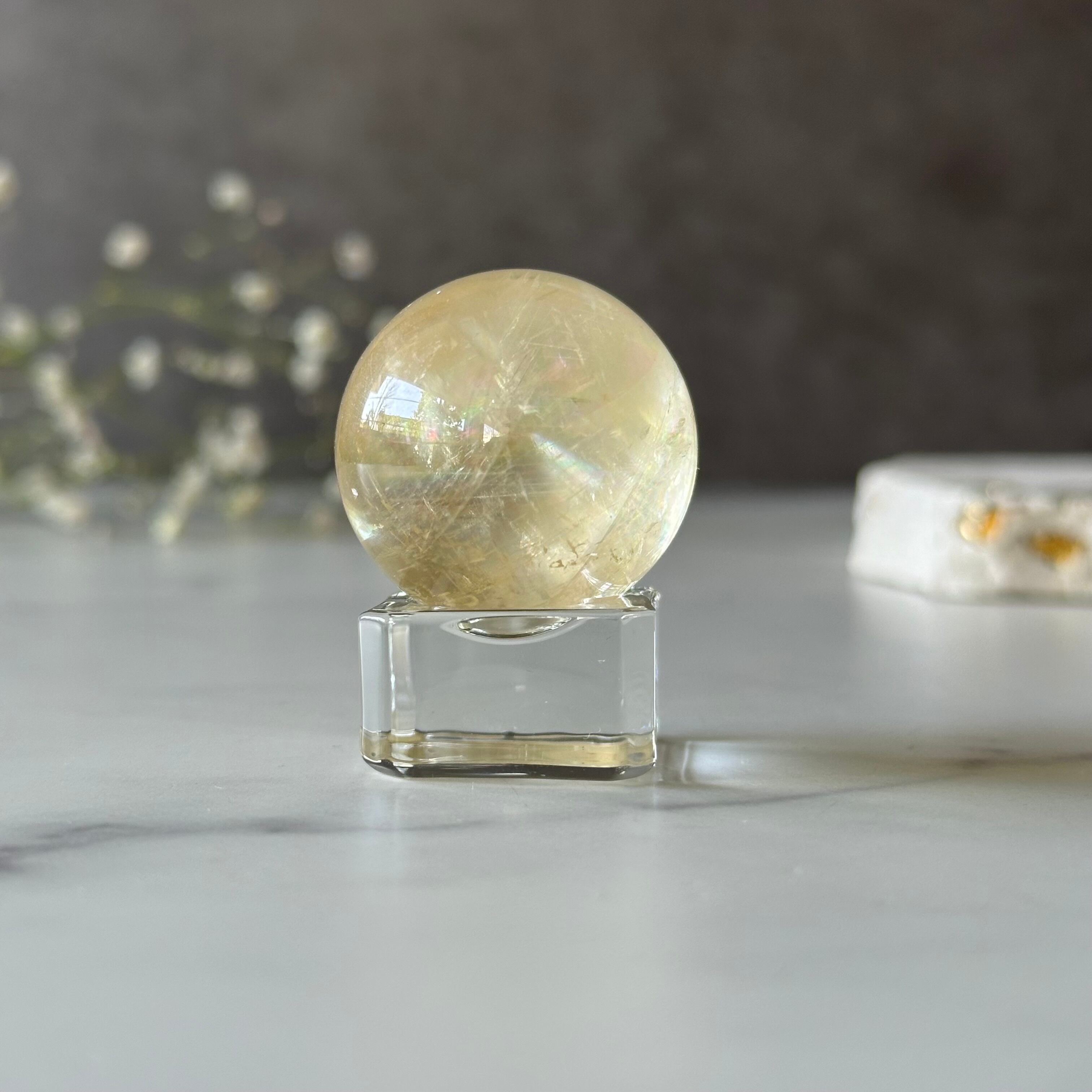 ハニーカルサイトのスフィアです。花の蜜のようにとろりと艶のある美しい色合いで、光をたっぷりと含みキラキラと輝きます。デンドリ、虹、線状の内包物がみられるユニークなアイテムです。カルサイトは波動が穏やかで、心身に優しい癒しを届けてくれます。