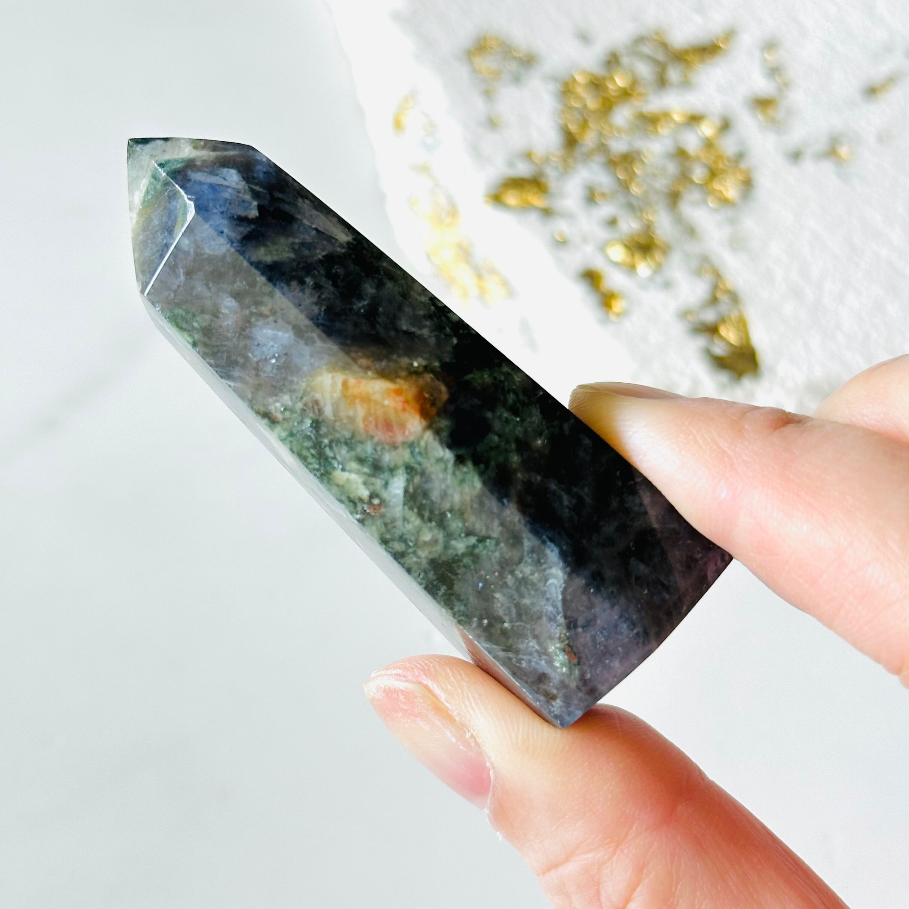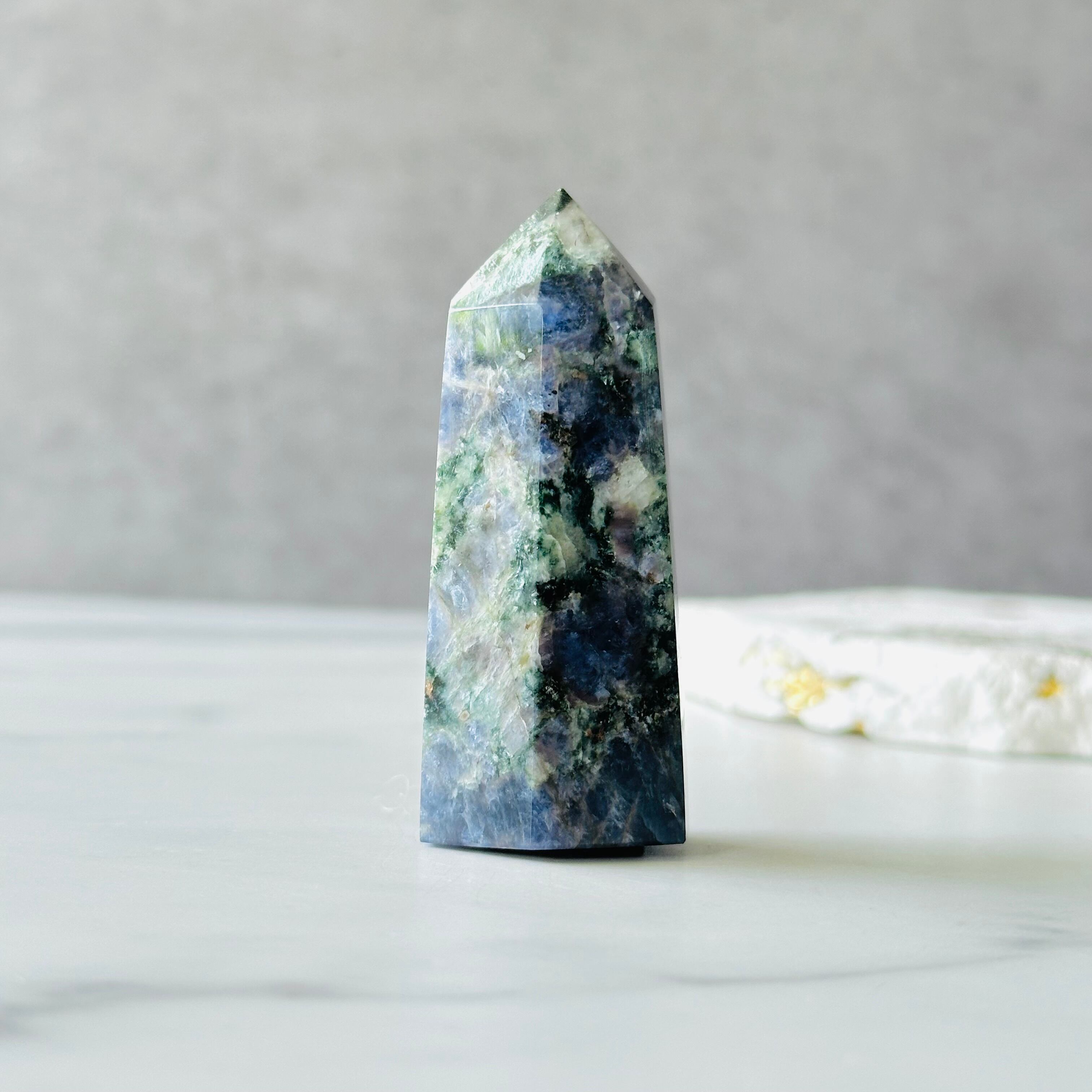 アイオライトはスミレ色の石、を意味する造語だといわれています。その名の通り、深く美しい藍色の天然石です。多色性があり見る角度や光の入り方によって多彩に混ざり合った色合いが変化して見えるところが最大の魅力です。パイライトも入り、まるで絵画作品のように美しいアイテムです。