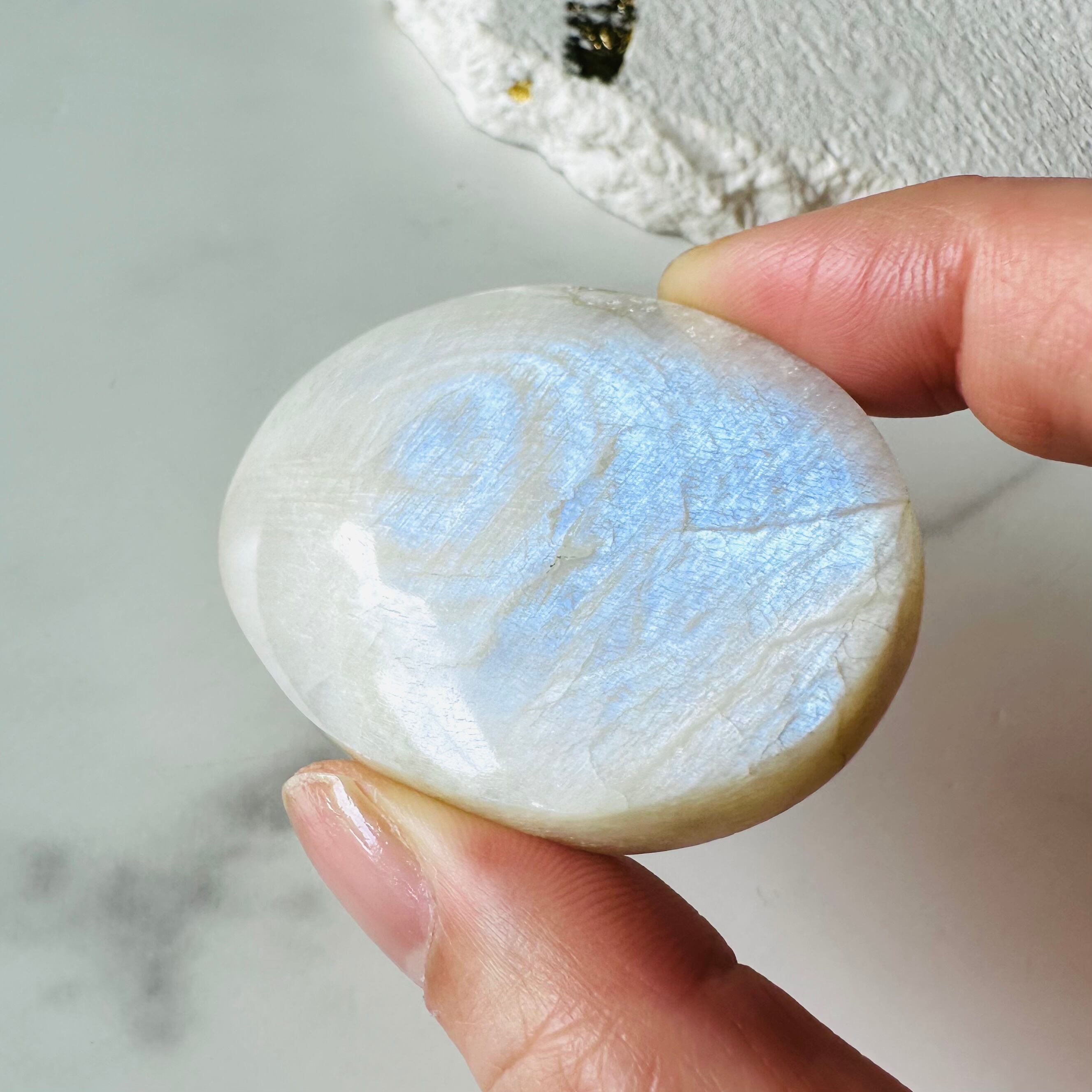 上品なホワイトの石に青いシラーが幻想的に輝く美しいムーンストーンのパームです。