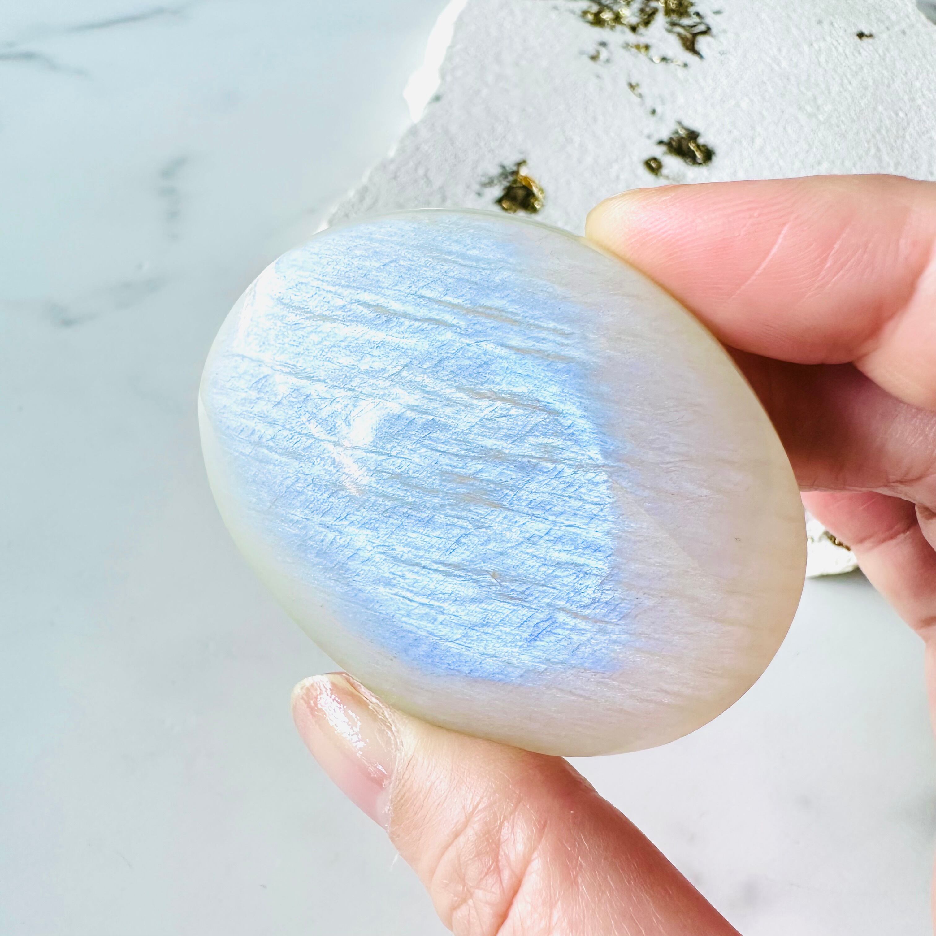 上品なホワイトの石に青いシラーが幻想的に輝く美しいムーンストーンのパームです。