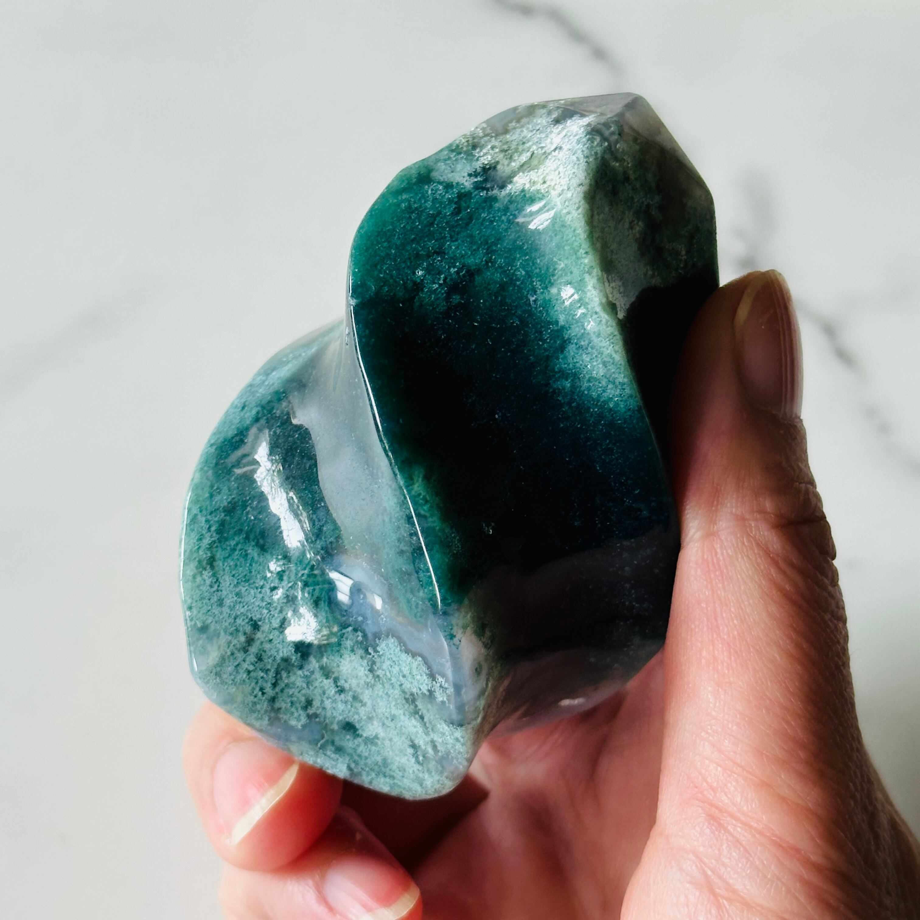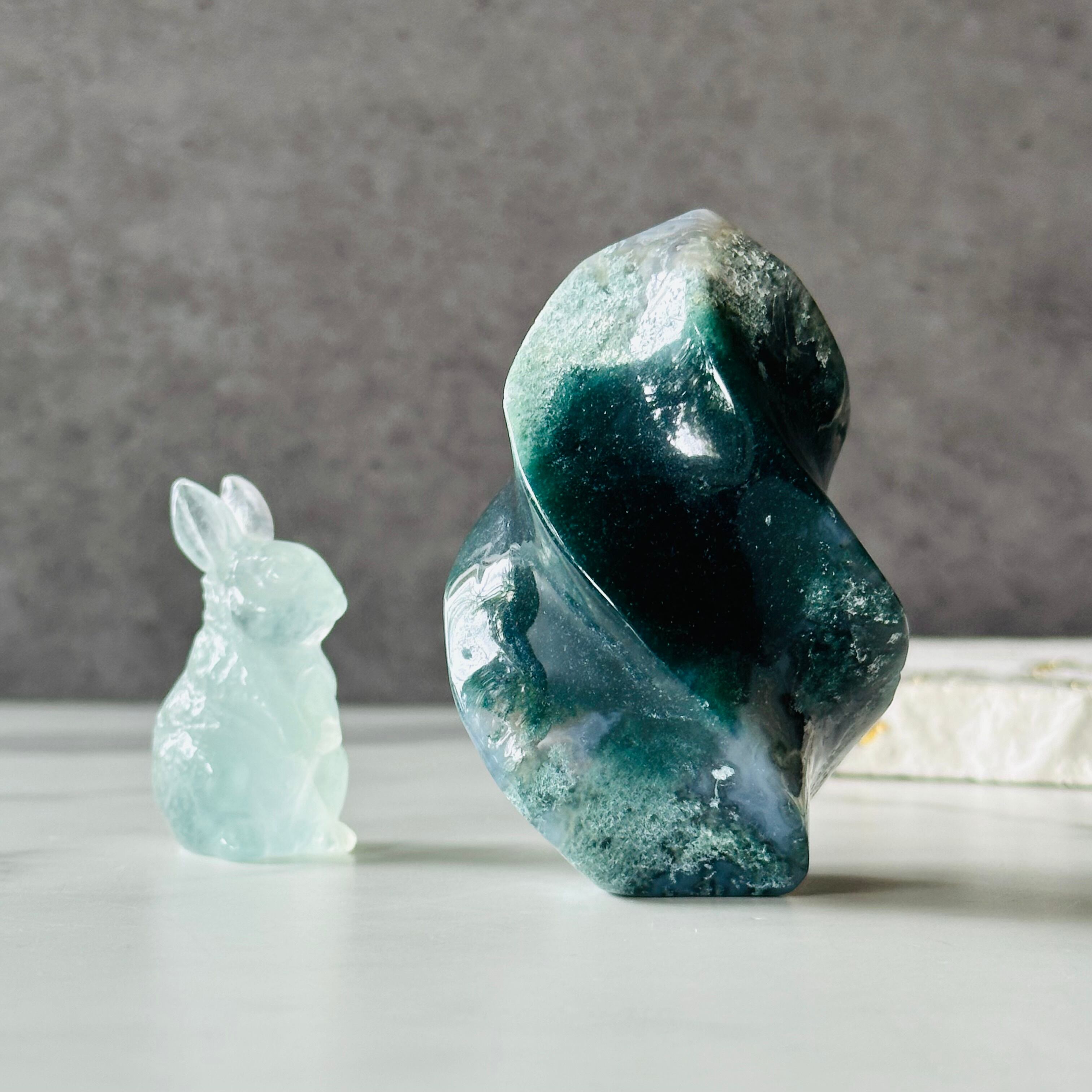 軽く捻りを加えたデザインは樹木のイメージ。モスアゲートはややグレー味を帯びた落ち着いたモスグリーンの色合いと、植物に似た穏やかな波動が深い癒しを与えてくれます。インテリアとしても優秀です。