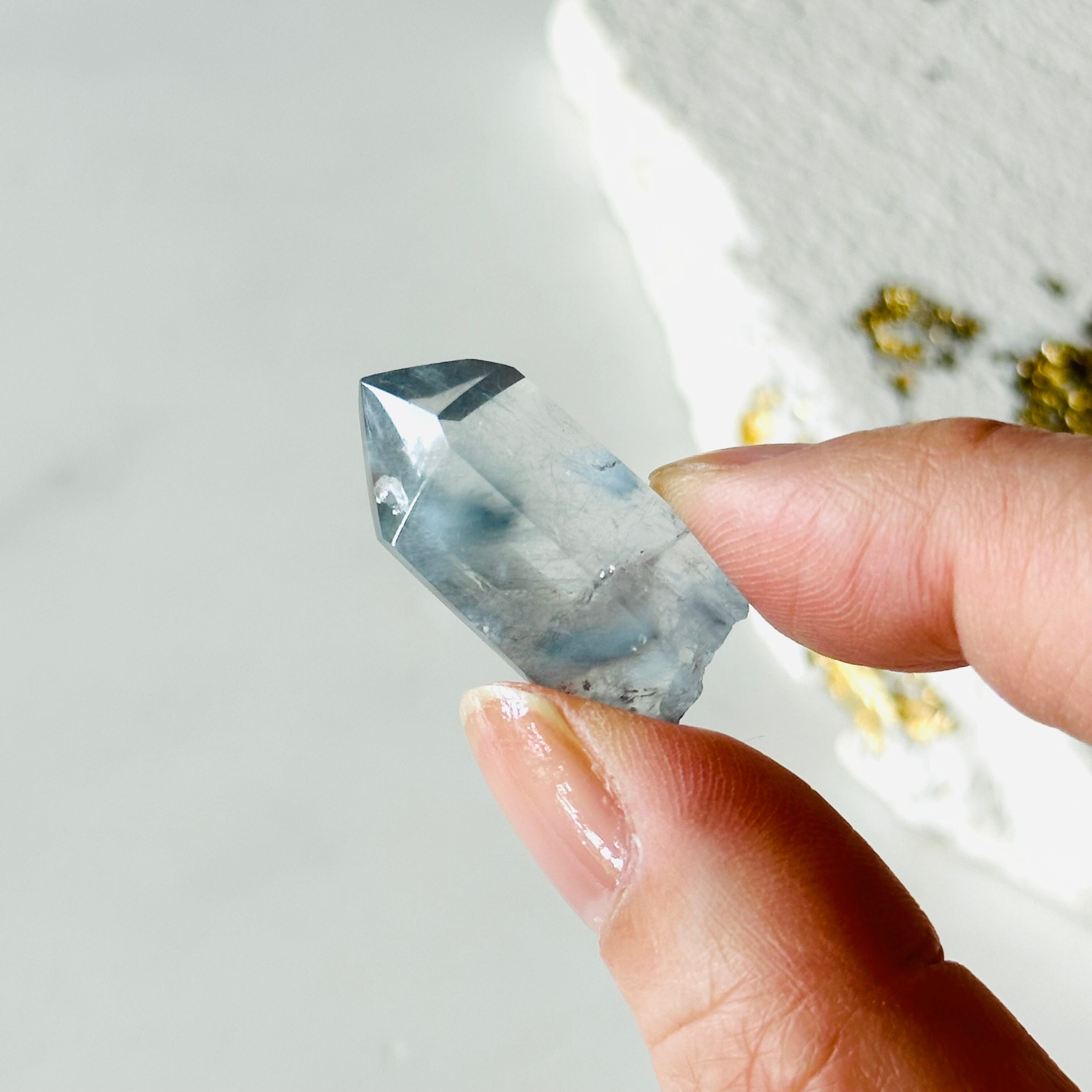 透明度が高いクォーツの内部にグレーがかったブルーの内包物がたっぷりと細かい羽毛のように入ります。