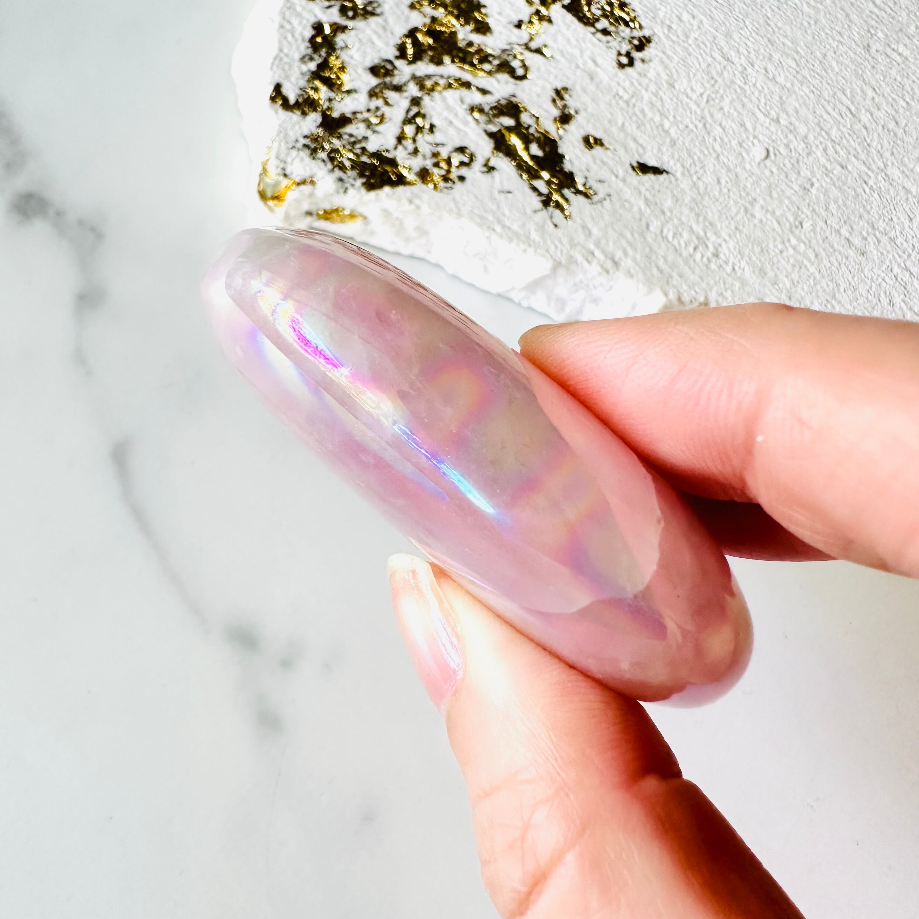 オーラを纏ったローズクォーツのパームストーンです。