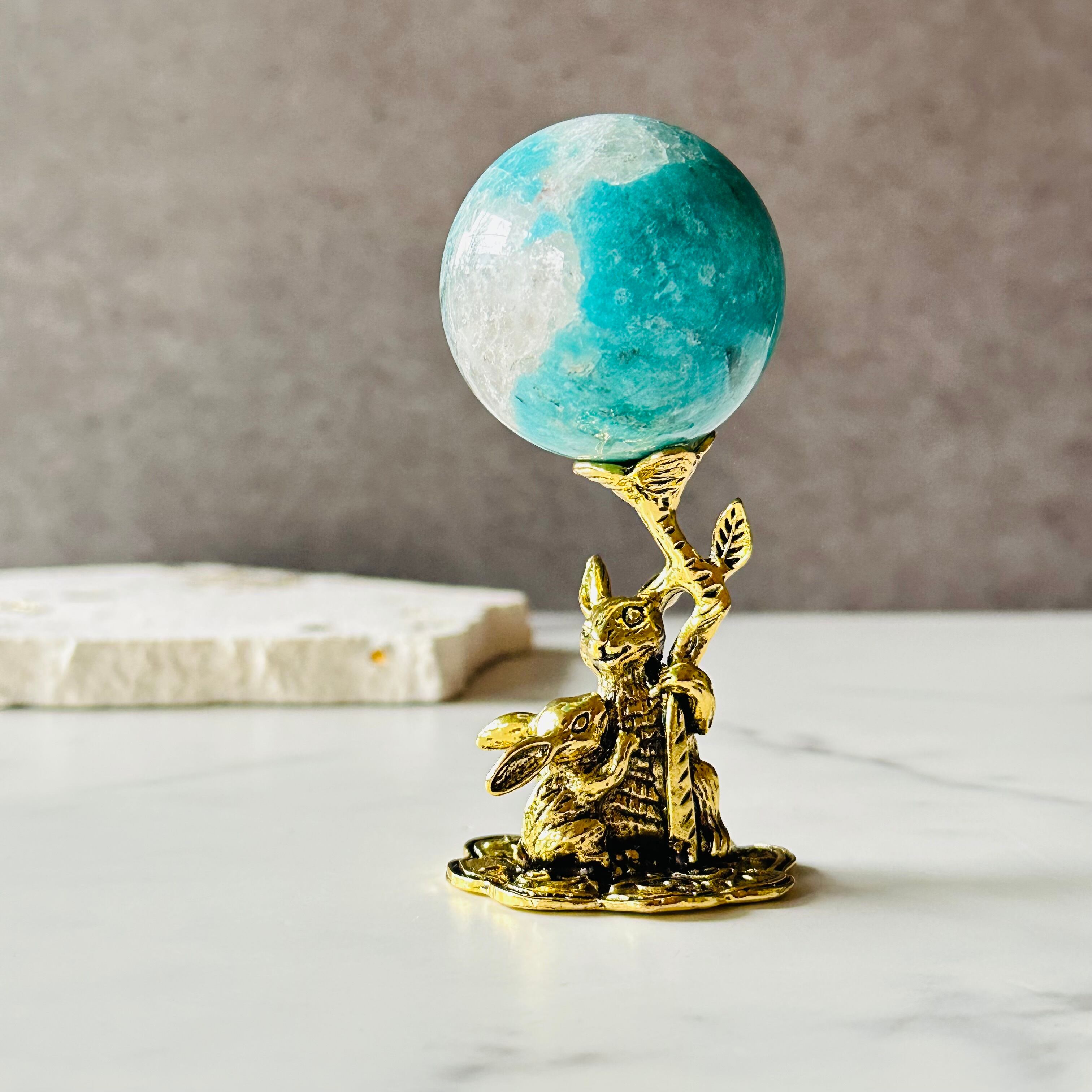 鮮やかなブルーグリーンの発色が美しいアマゾナイトのスフィアです。白いクォーツを多く含みます。精神名に作用するアマゾナイト。疲れた時に眺めるとほっと安心するアイテムです。