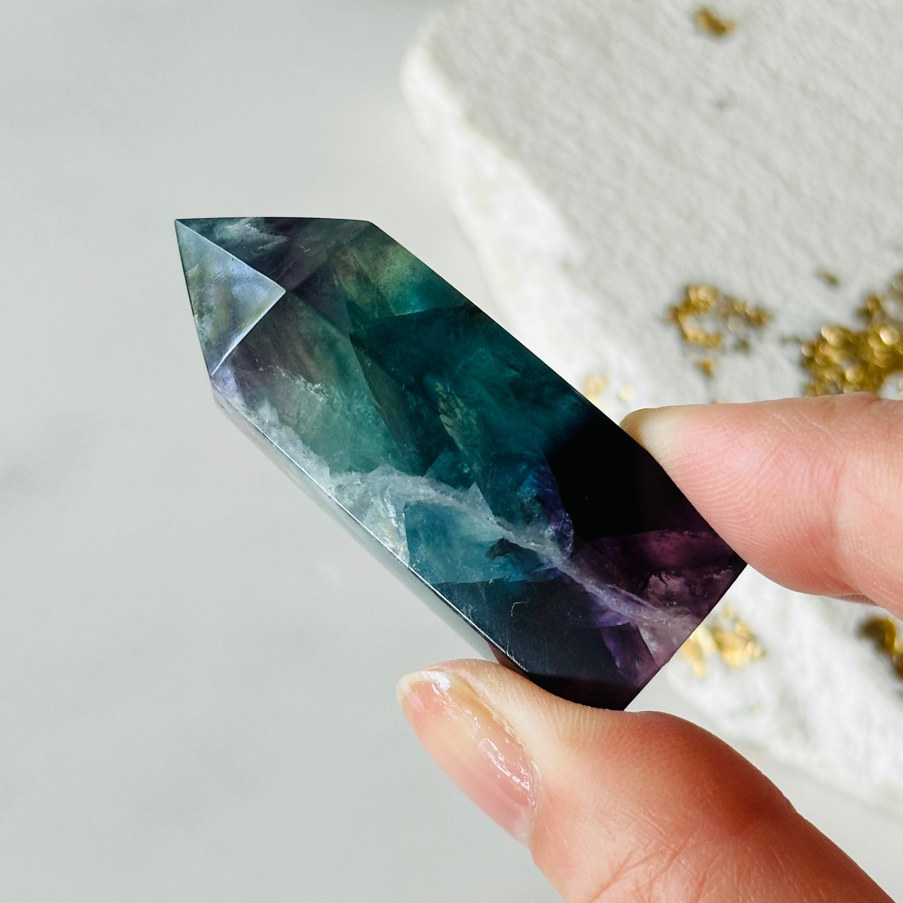 ブルー、グリーン、パープルが混ざり合い、光を入れると一層美しく輝きます。虹も入ります。
