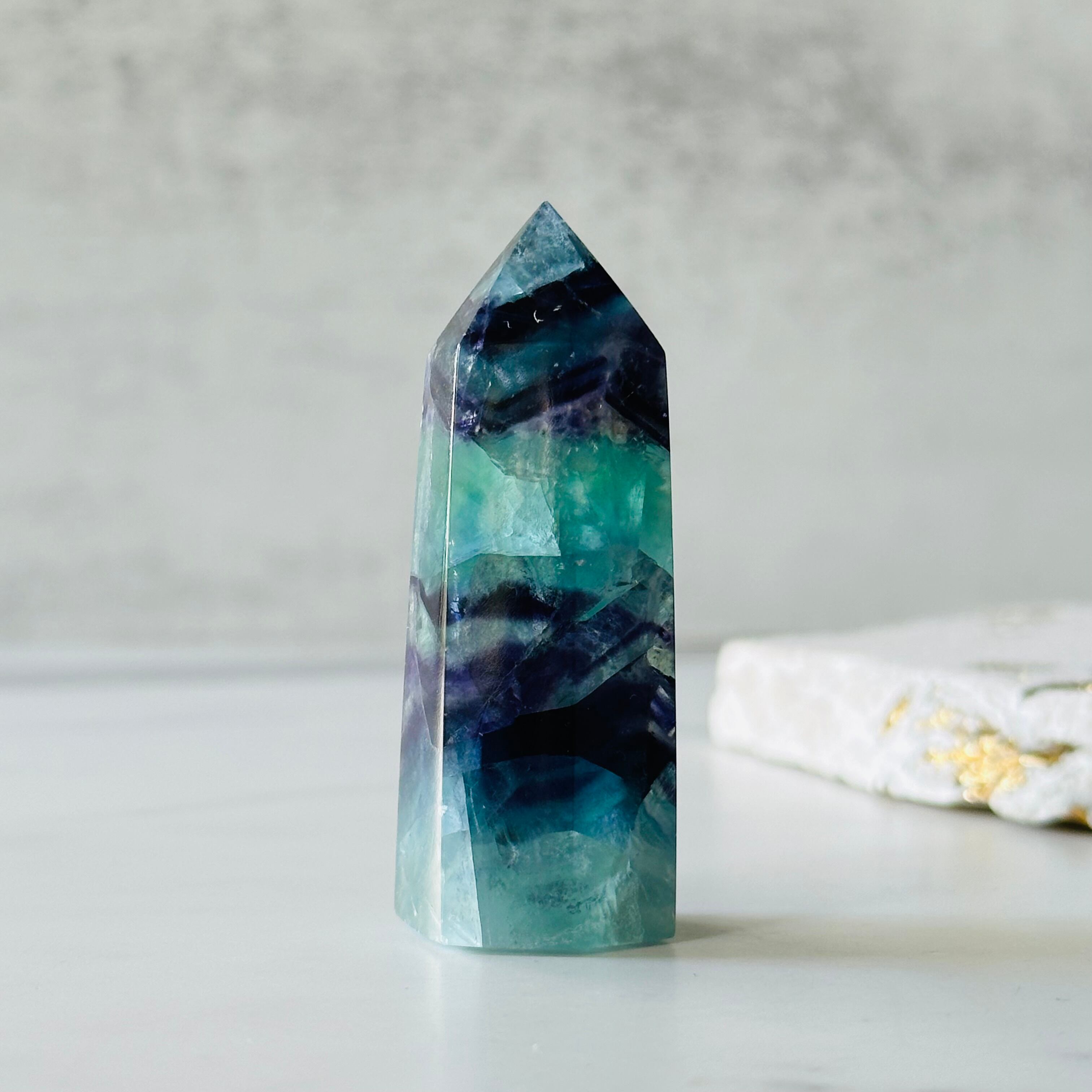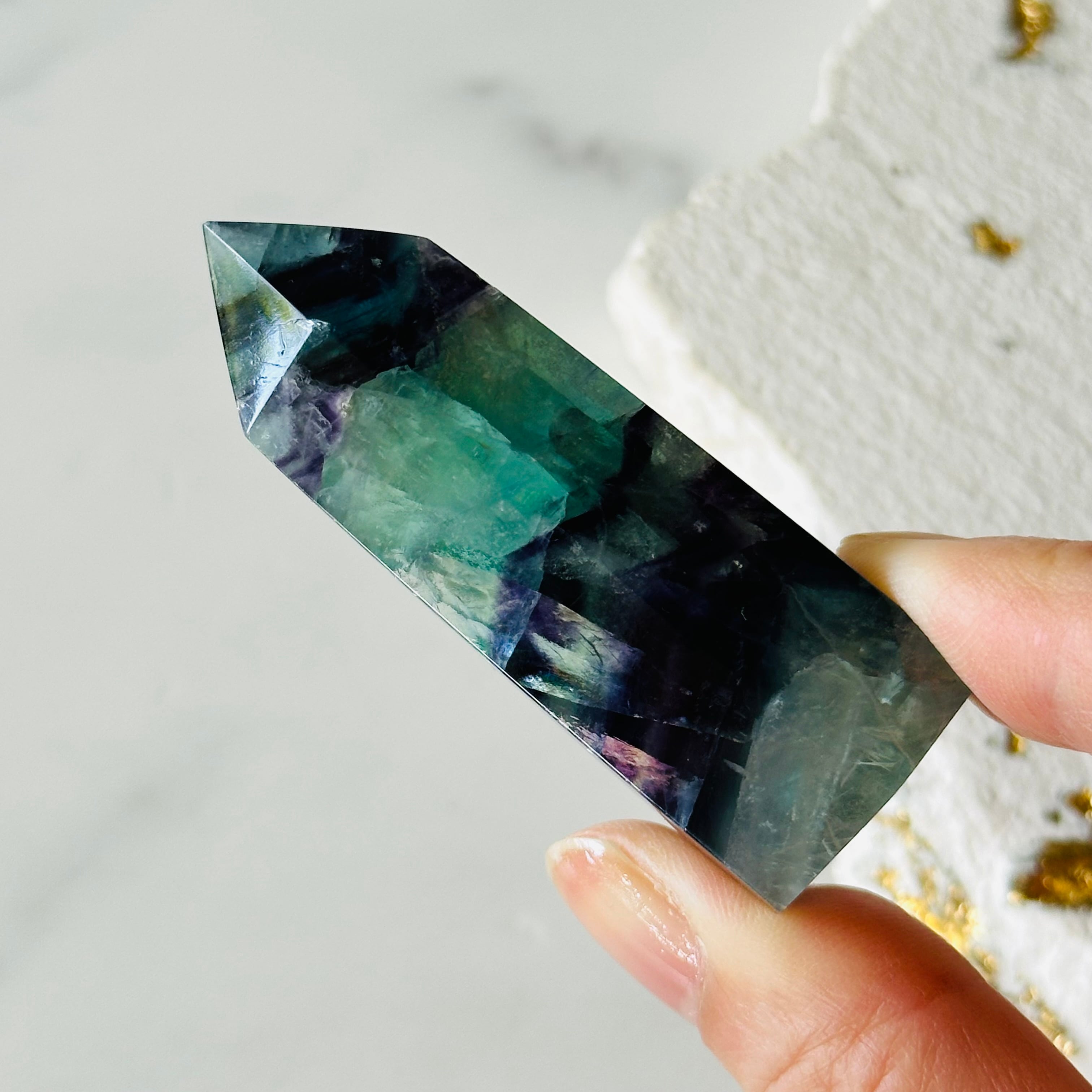 ブルー、グリーン、パープルが混ざり合い、光を入れると一層美しく輝きます。虹も入ります。