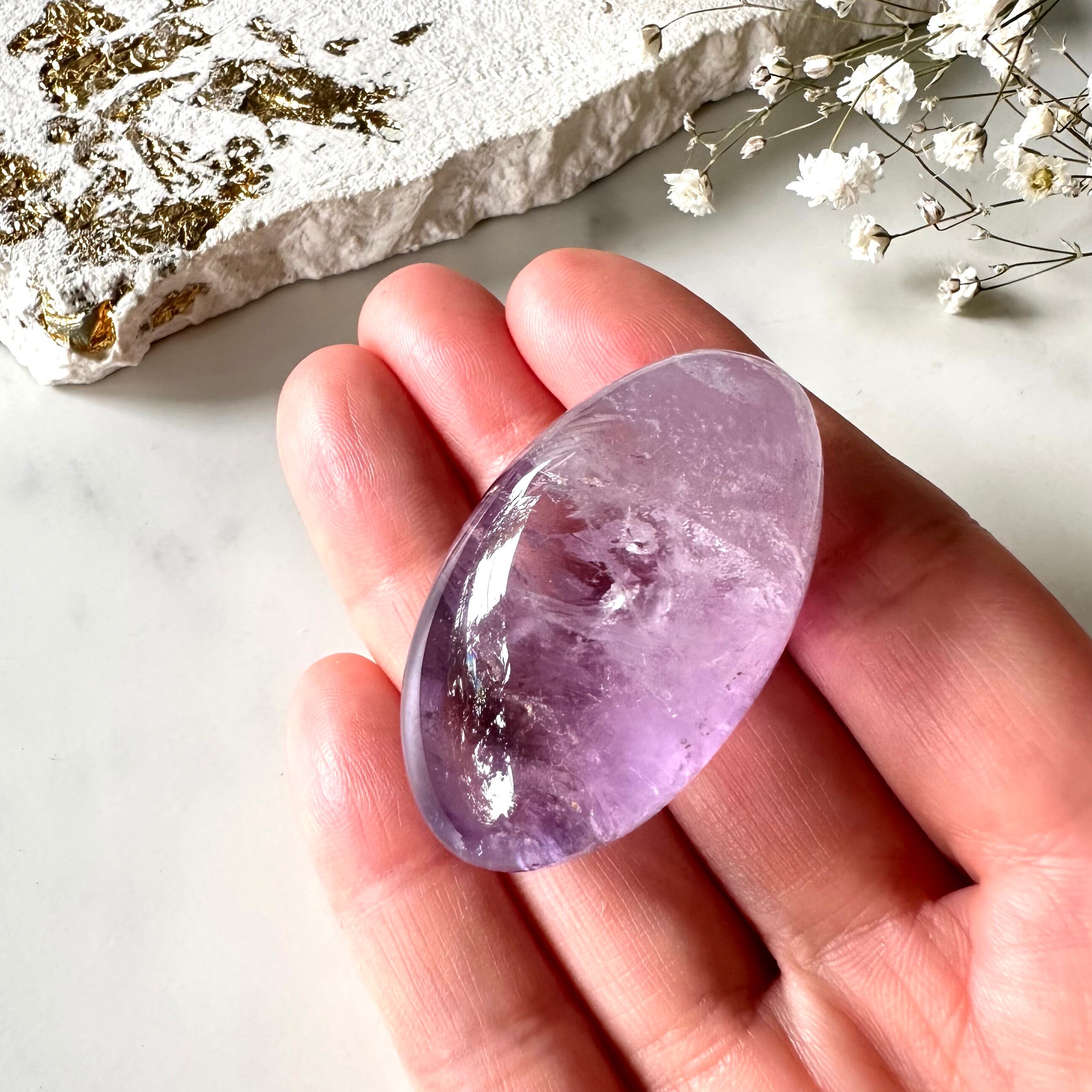 ラベンダーカラーが可愛いブラジル産アメジストのペブルです。透明感があり光を入れるとキラキラと輝き虹も入ります。