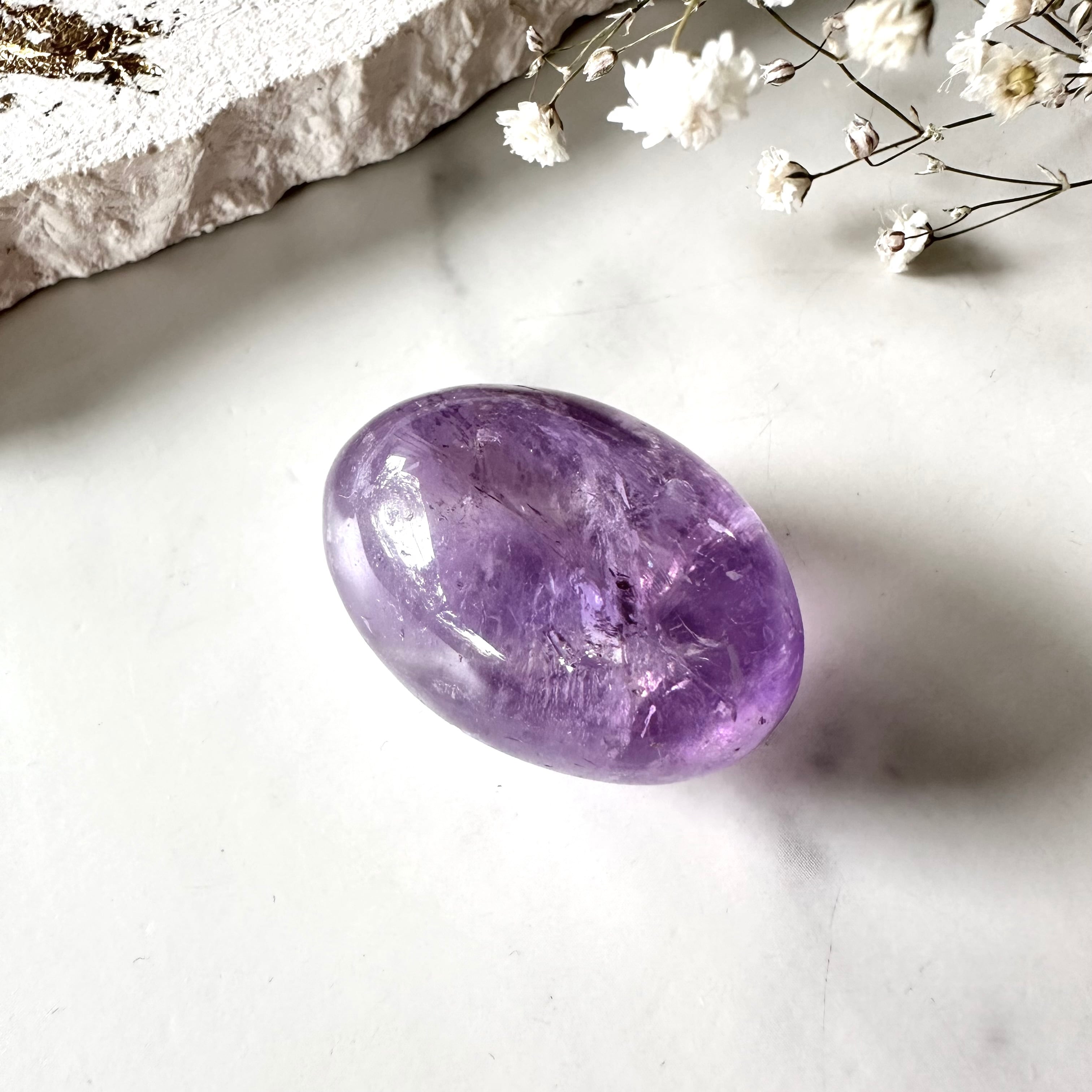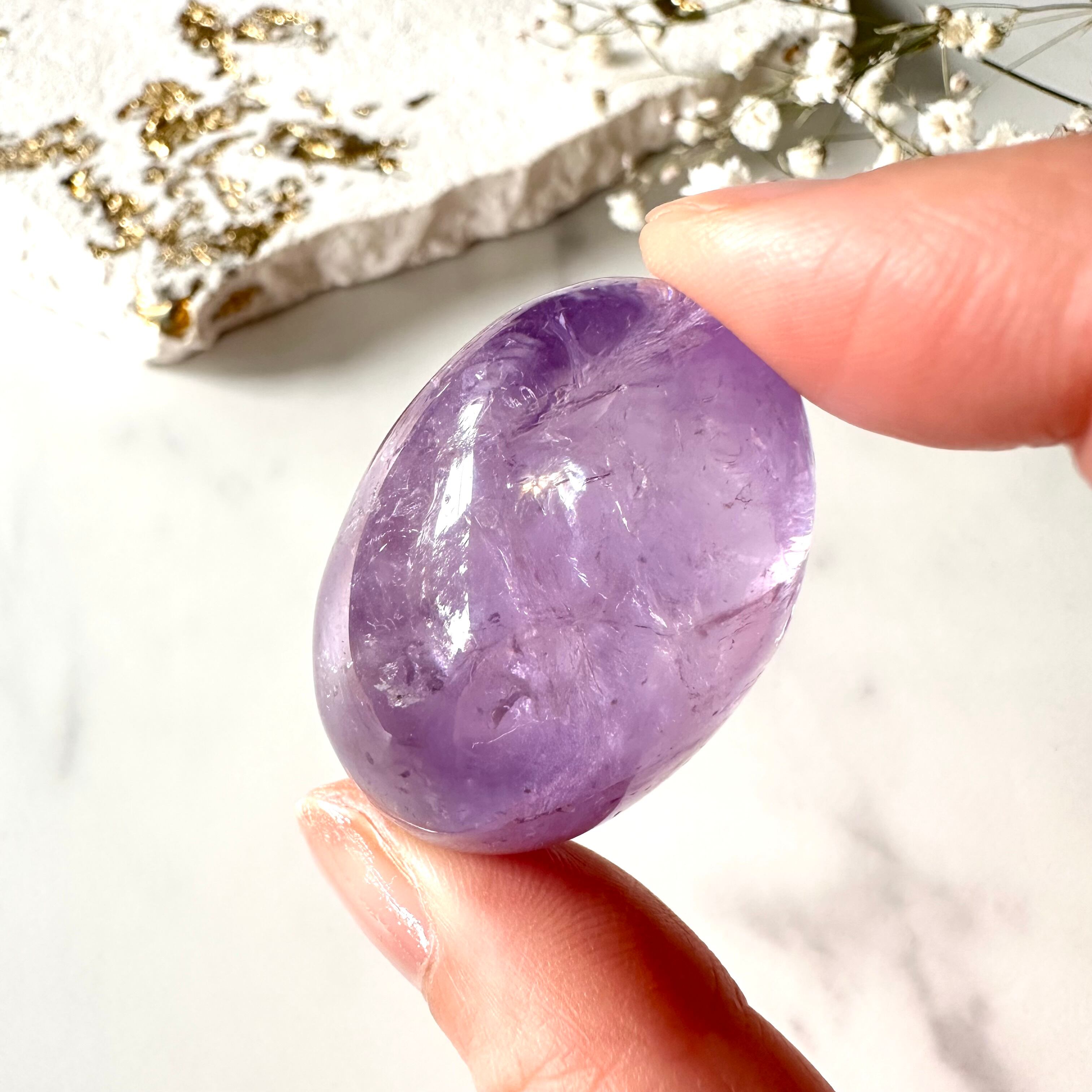 ラベンダーカラーが可愛いブラジル産アメジストのペブルです。透明感があり光を入れるとキラキラと輝き虹も入ります。