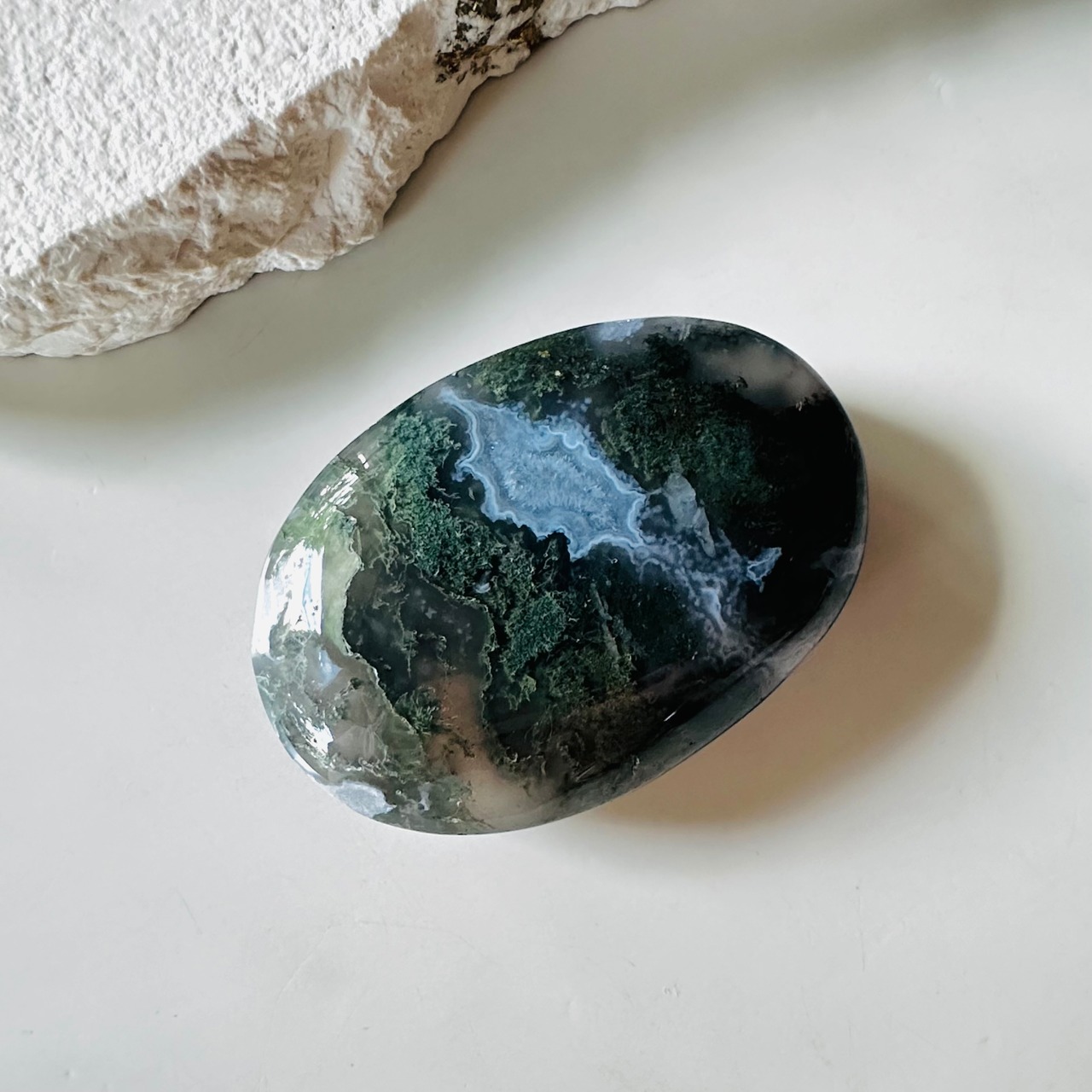 深い緑色の癒しのモスアゲートパームストーンです。苔むしたようなグリーンが穏やかな癒しを与えてくれます。