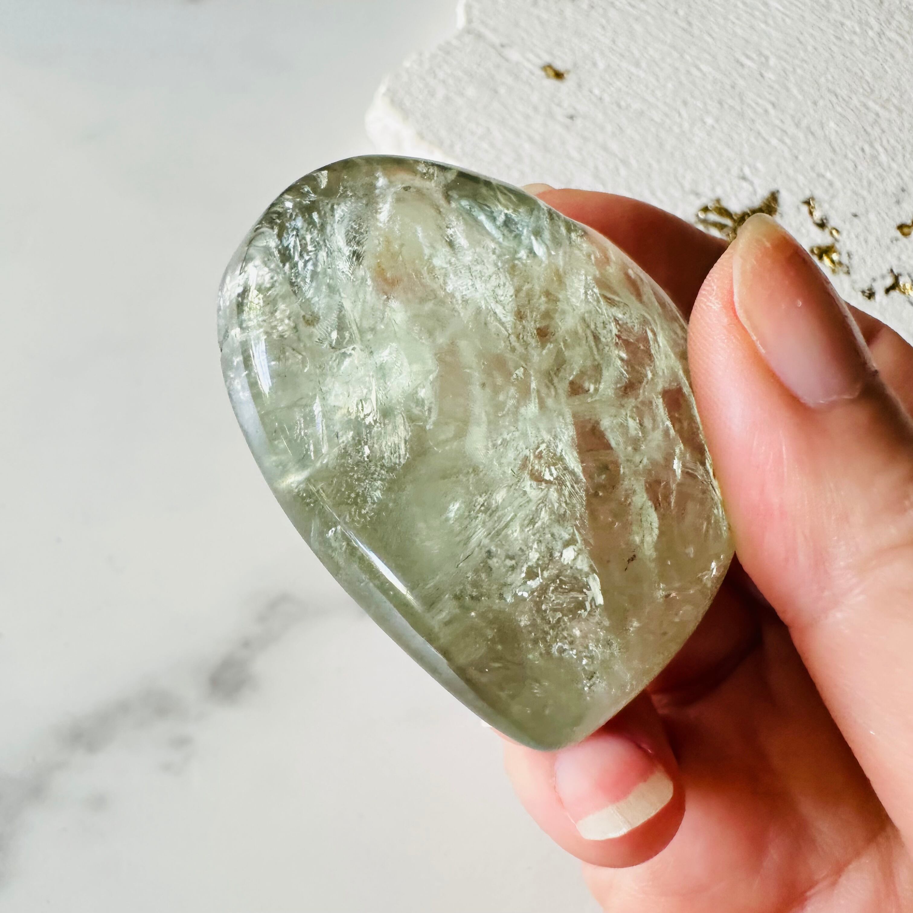 透明感のあるグリーンの瑞々しさが魅力的です。高貴な美しさを持つプラシオライトは、持ち主の存在感を高め、成熟した女性の美しいオーラを最大限に引き出します。高価な石なのでルースで見かけることが多く、このサイズのパームやハートはあまり流通していないように思います。