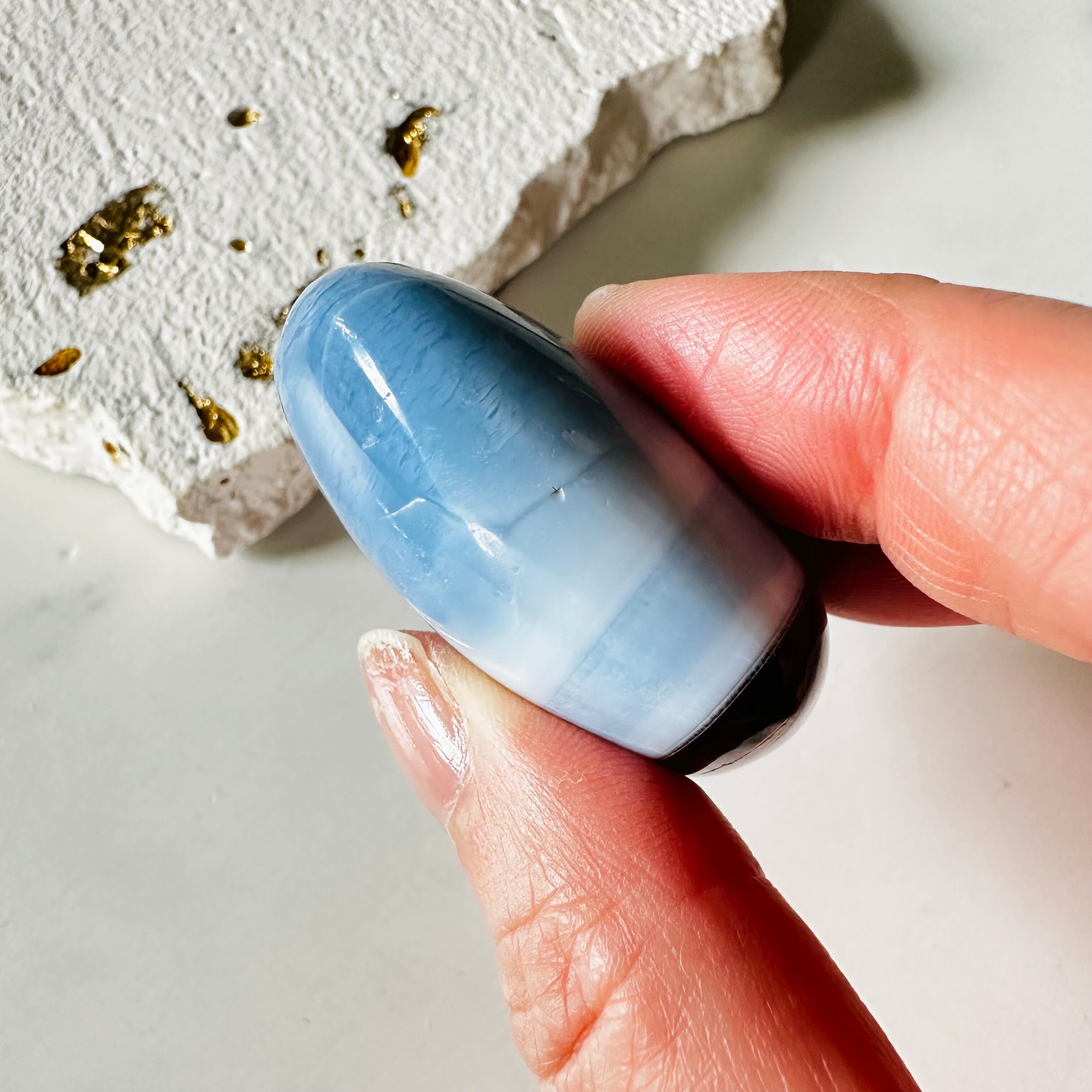 アメリカ・オレゴン州の自然豊かな大地に育まれたブルーオパール。履き慣れたデニムのような、あるいは藍染のような少し掠れたブルーは、私たち日本人の暮らしにしっくりと馴染みます。