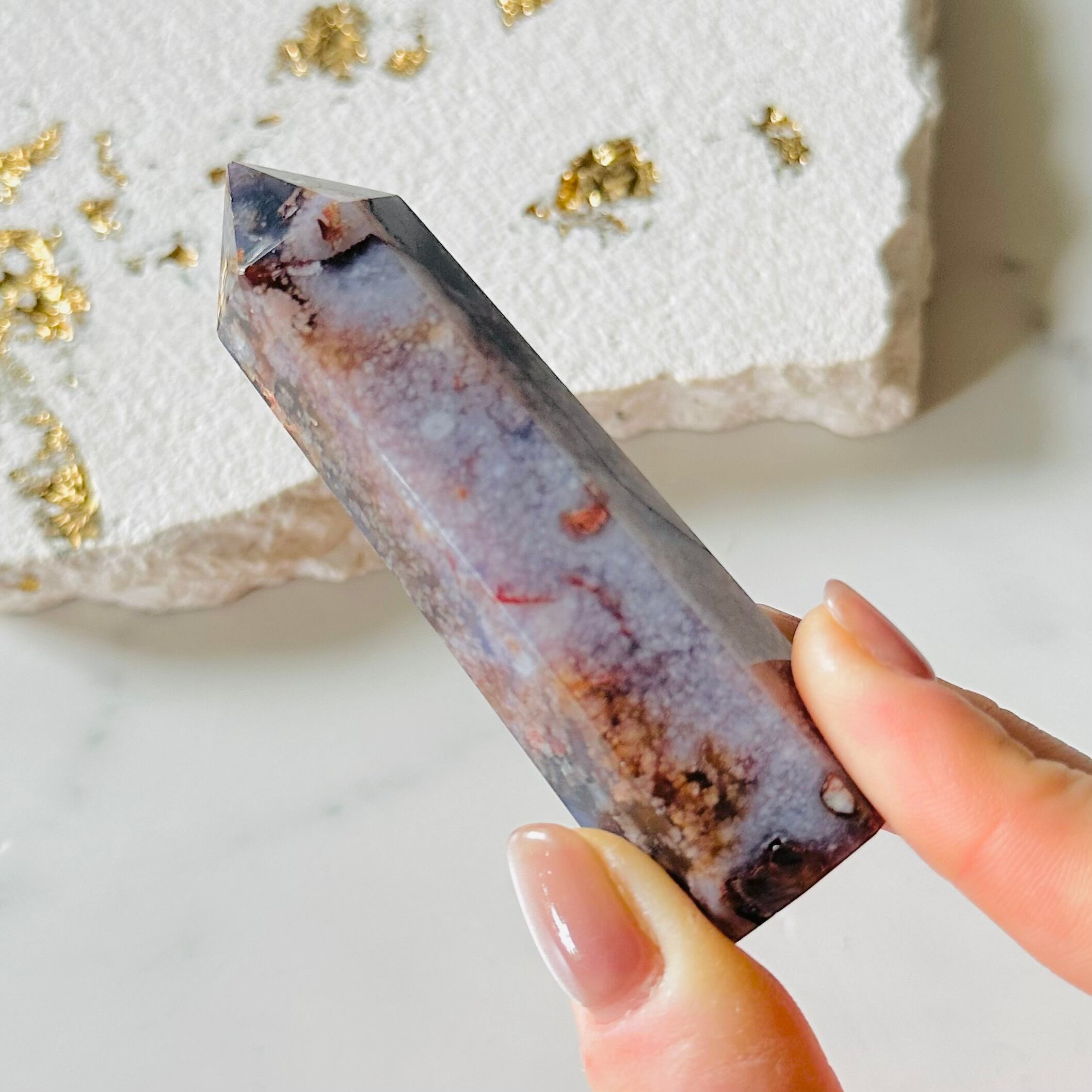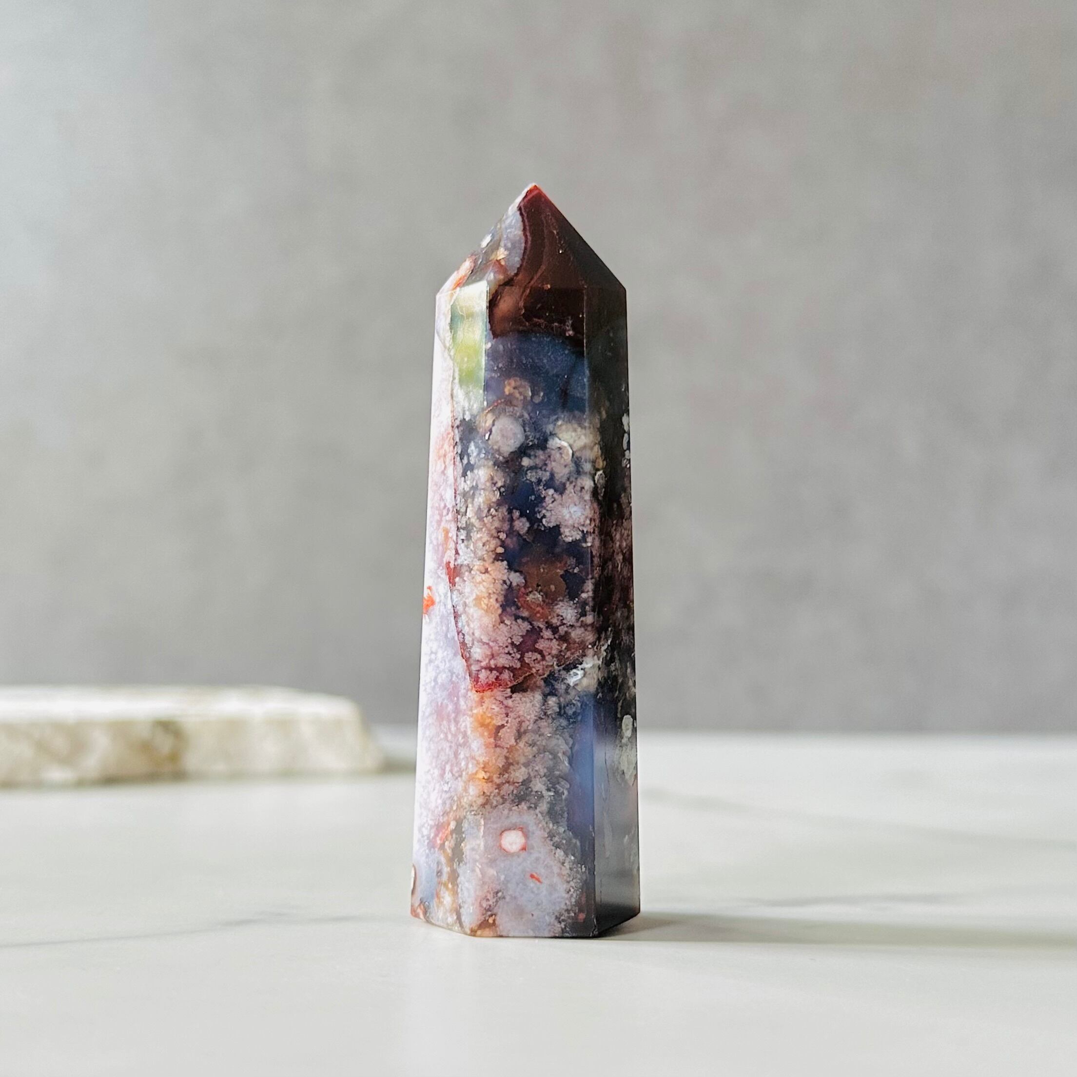 青紫色の石にピンク色のお花が咲き誇るブルーフラワーアゲートタワーです。艶のある質感と美しい色合いが魅力です。