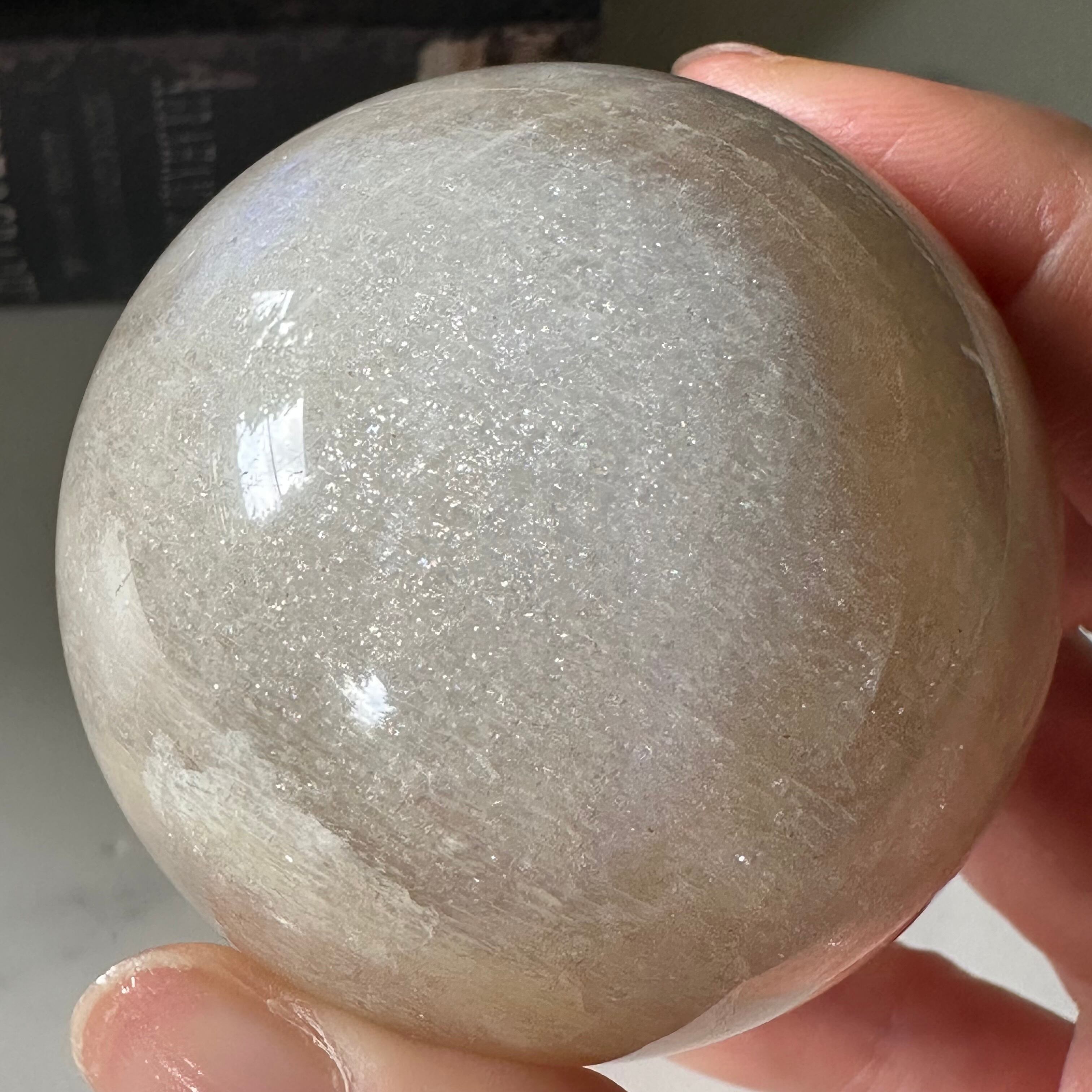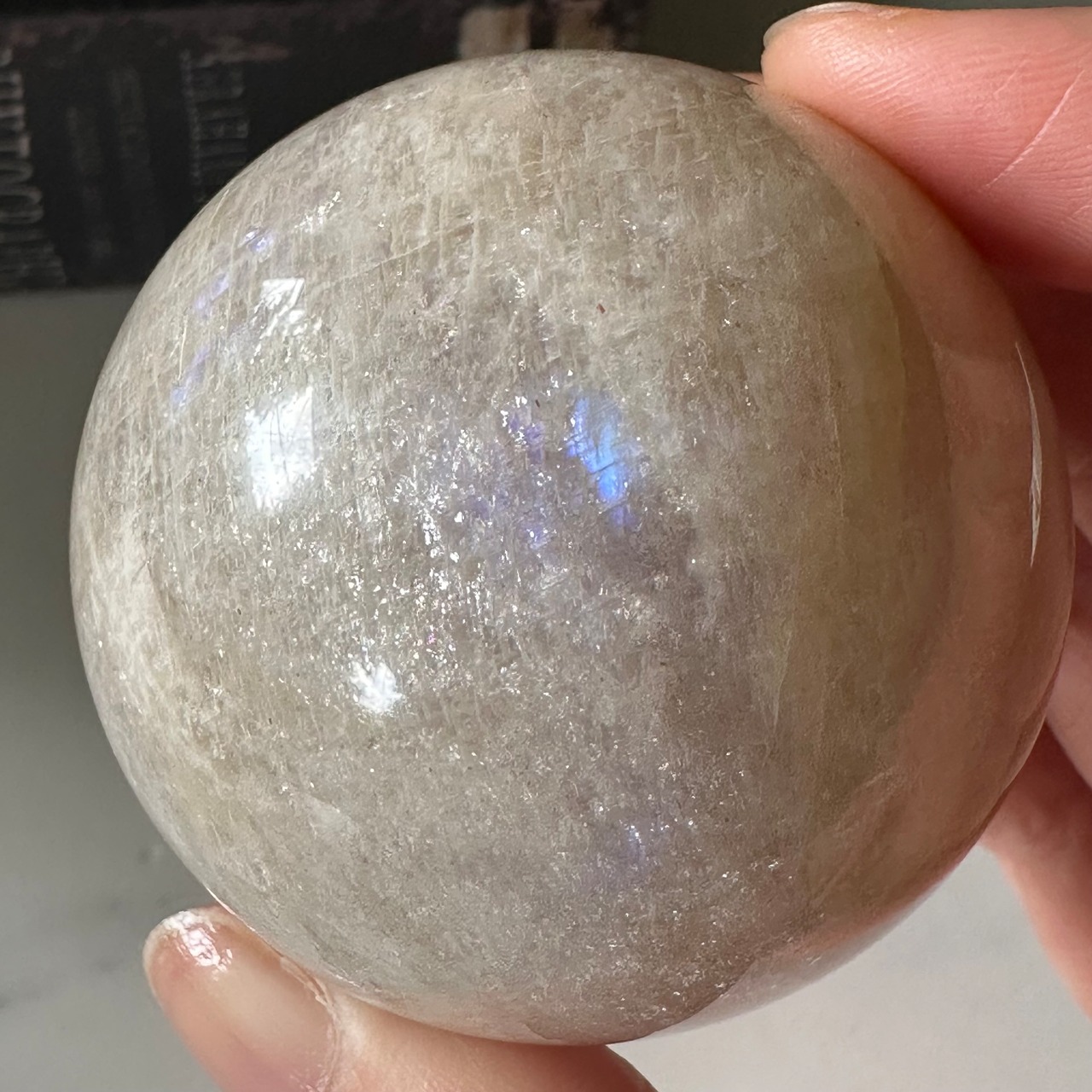 手の中でくるくる回すと驚くほど美しく煌めき始めます。光の反射によって生まれるブルーシラーが幻想的で、うっとりと見惚れてしまう美しいスフィアです。