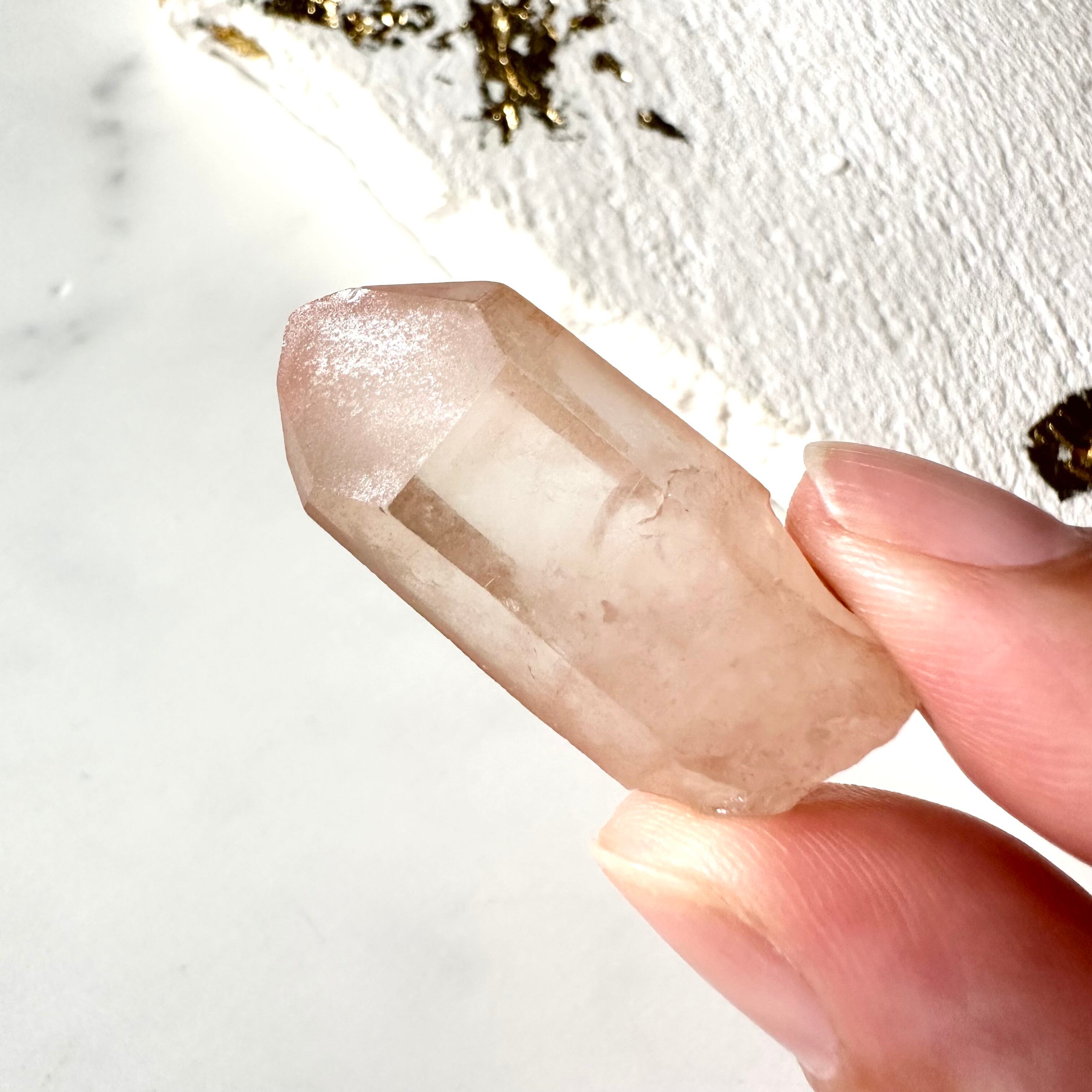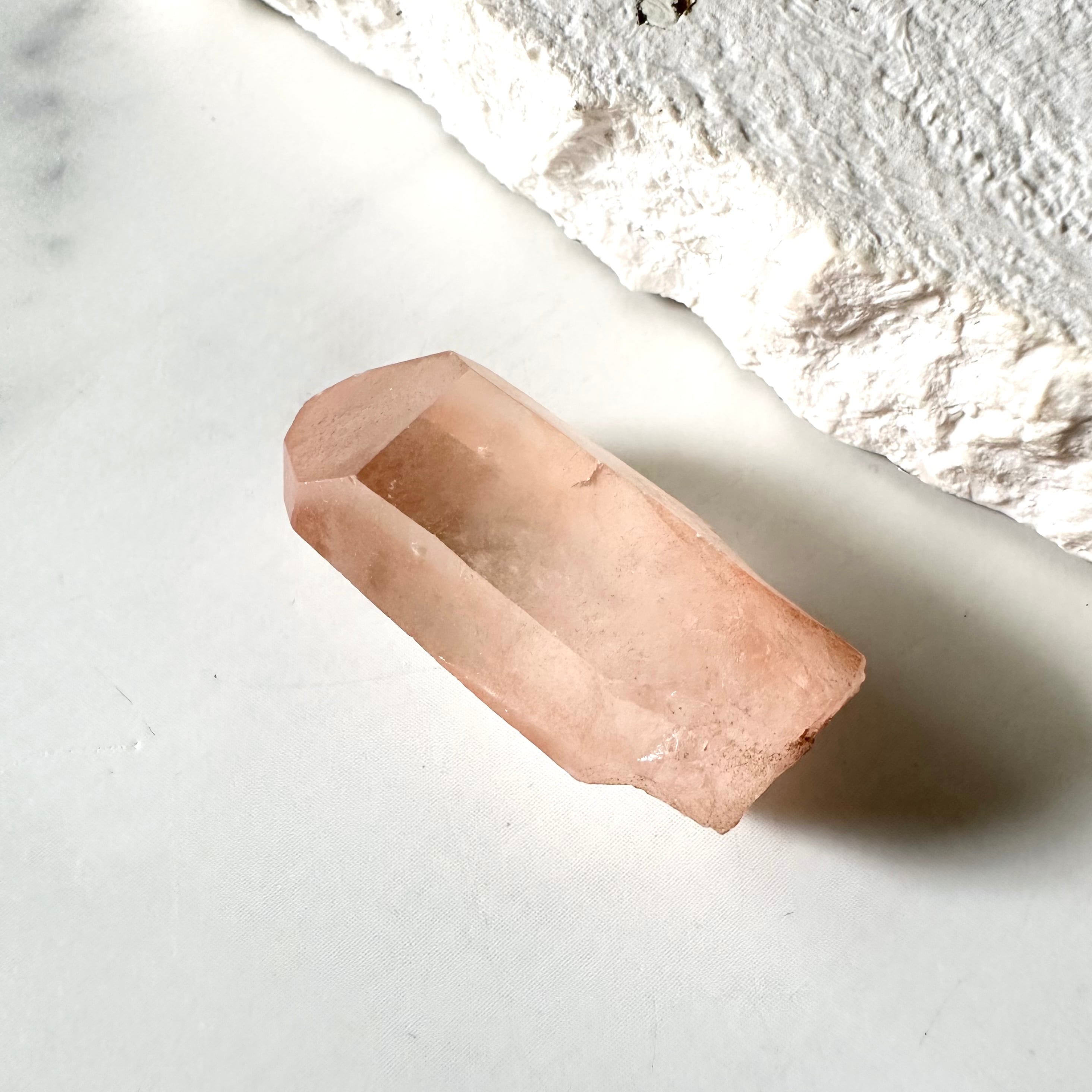 鉄分の付着によりピンク色に変化したレムリアンシードクリスタル。レムリアンは、数億万年前に存在したとされる伝説のレムリア大陸で、高度な文明を築いたとされるレムリア民族がメッセージを現代人に残し伝えるクリスタルだといわれています。可愛らしいピンク色は、レムリアンの強く静謐な波動に加えて、女性らしい優しさと愛情豊かなエネルギーに溢れています。
