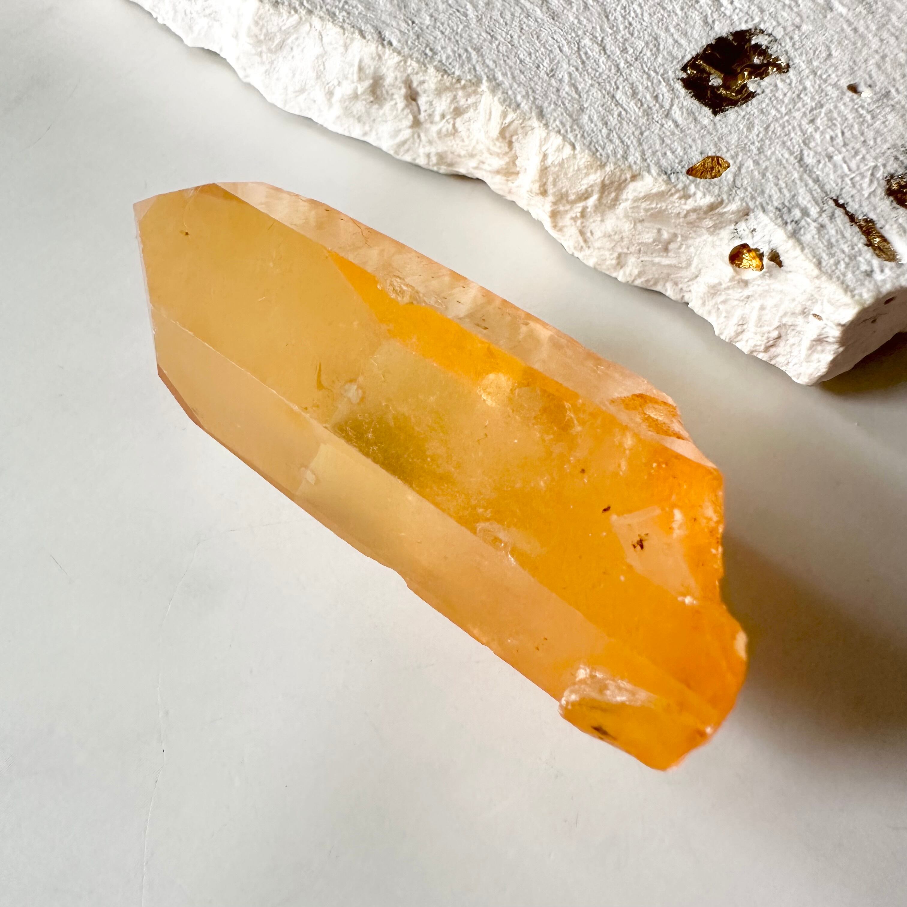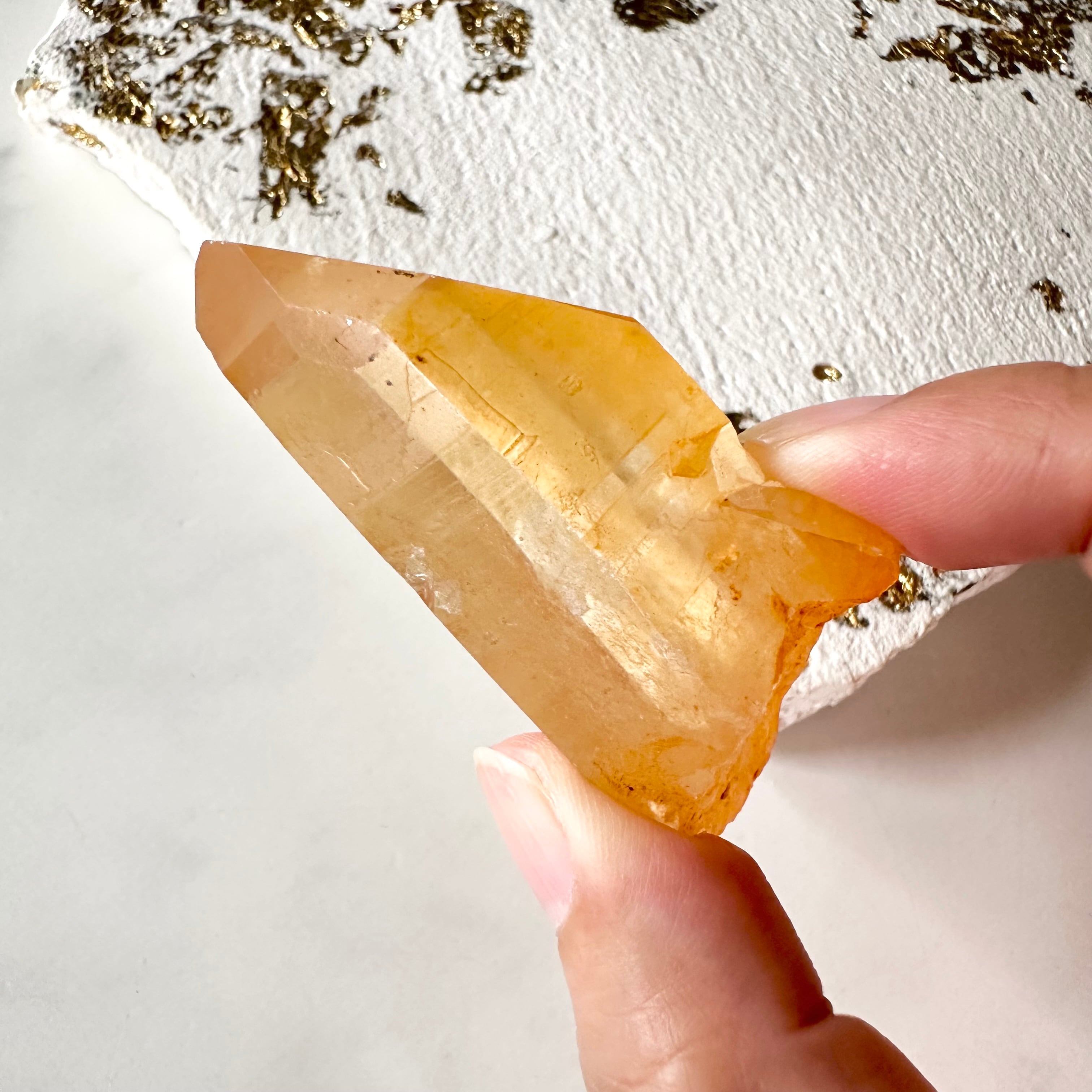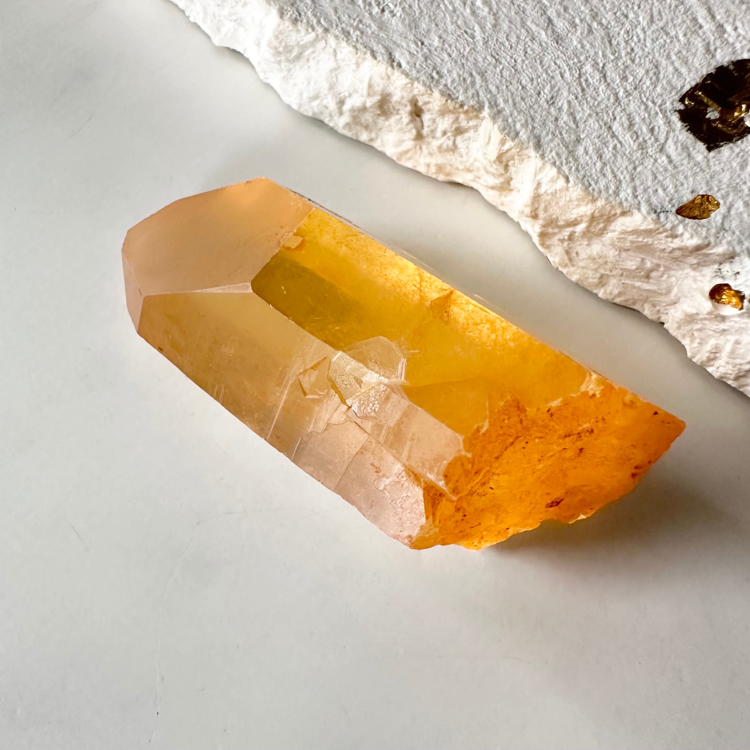 透明感のある透き通ったオレンジ色が綺麗なブラジル産のタンジェリンクォーツです。表面には天然のオーロラが見られます。天然のオーロラはイエローゴールドに見える表面に光を反射させると虹が出る現象を言い、非常に貴重で稀有なストーンです。