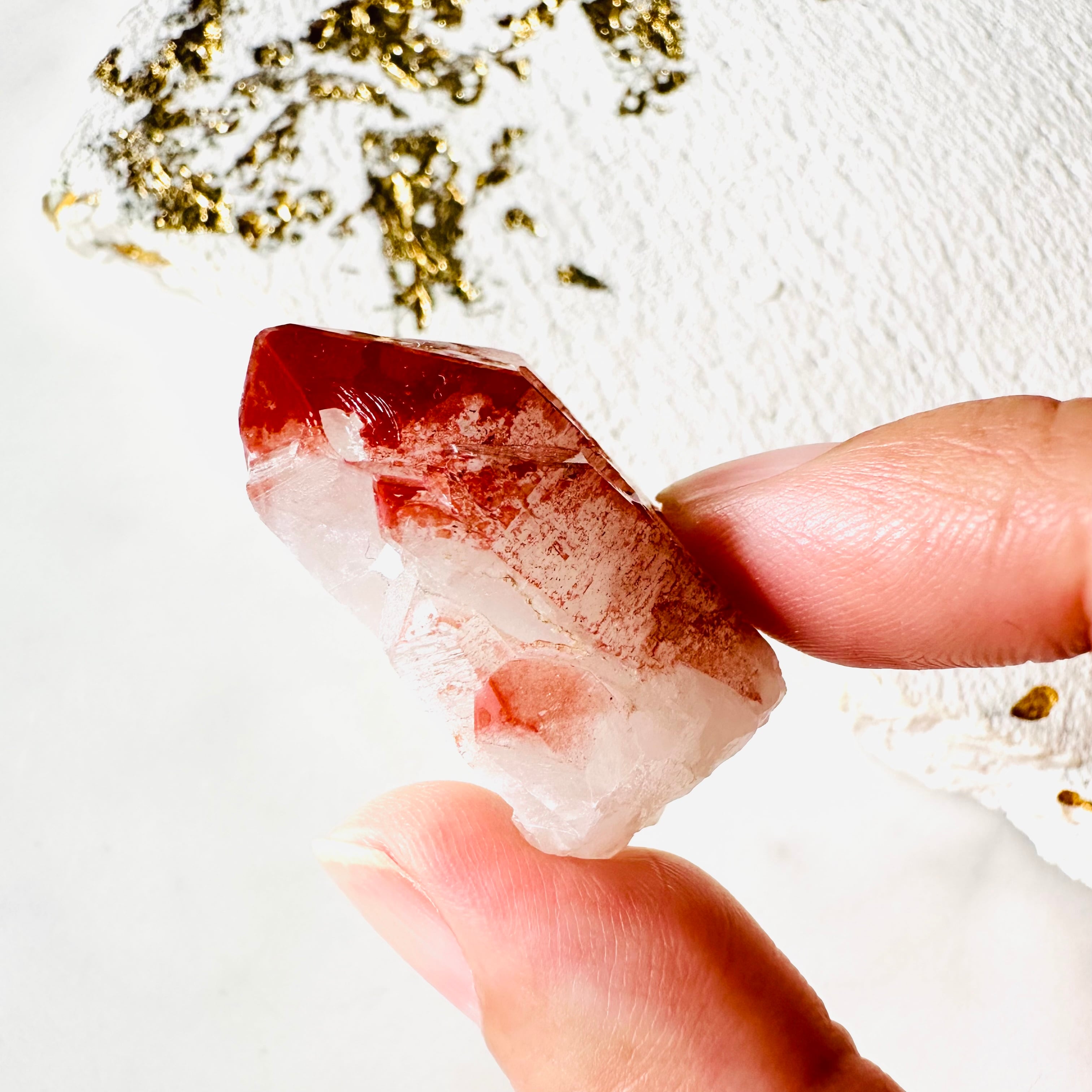 この鮮やかな赤い色は水晶の表面に付着したヘマタイト(鉄分)によるものです。オレンジリバー産のレッドクォーツは、品質が高いことで知られますが、中でも艶テリが抜群で状態のいい石を厳選しました。