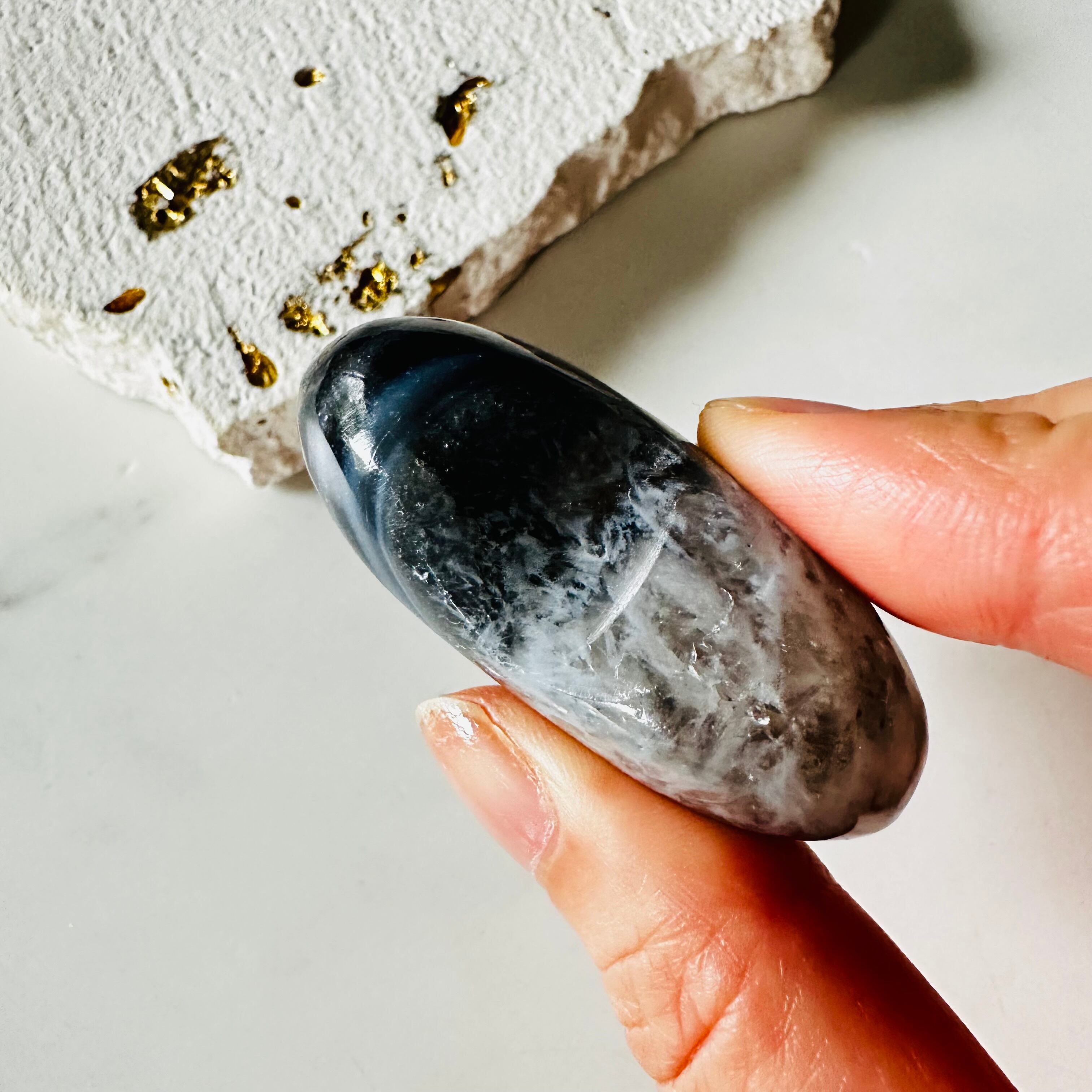 アメリカ・オレゴン州の自然豊かな大地に育まれたブルーオパール。履き慣れたデニムのような、あるいは藍染のような少し掠れたブルーは、私たち日本人の暮らしにしっくりと馴染みます。