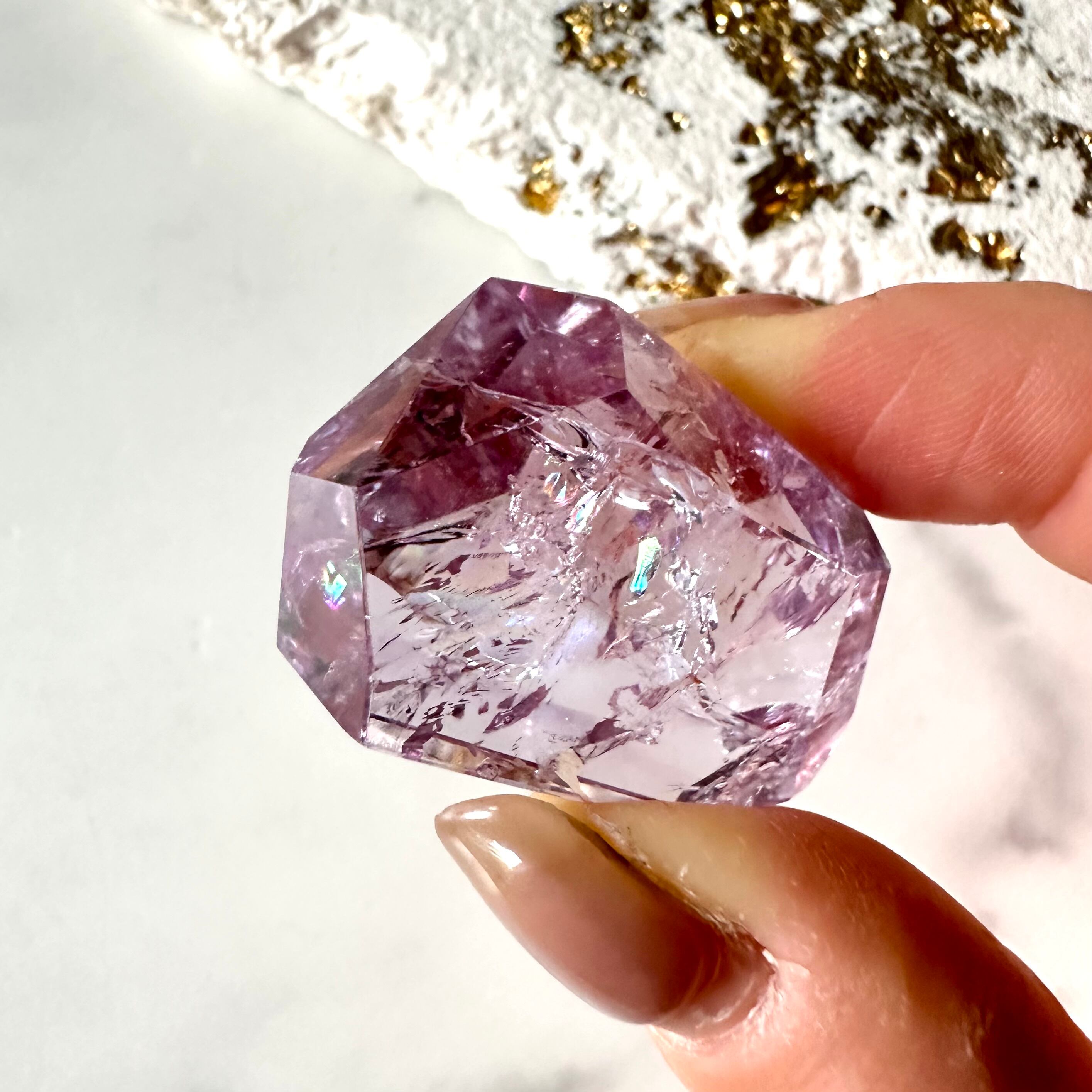 内部のクラックが美しい虹を映し出す宝石カットのアメジスト。高い透明度のアメジストはまるで氷のかけらのようにキラキラと光を放ち、幻想的な世界に連れて行ってくれます。素材の美しさ、丁寧なカット、ラベンダーカラーの色合いがとても魅力的で、世界にひとつだけの特別なアイテムです。ぜひお手に取ってご覧ください。
