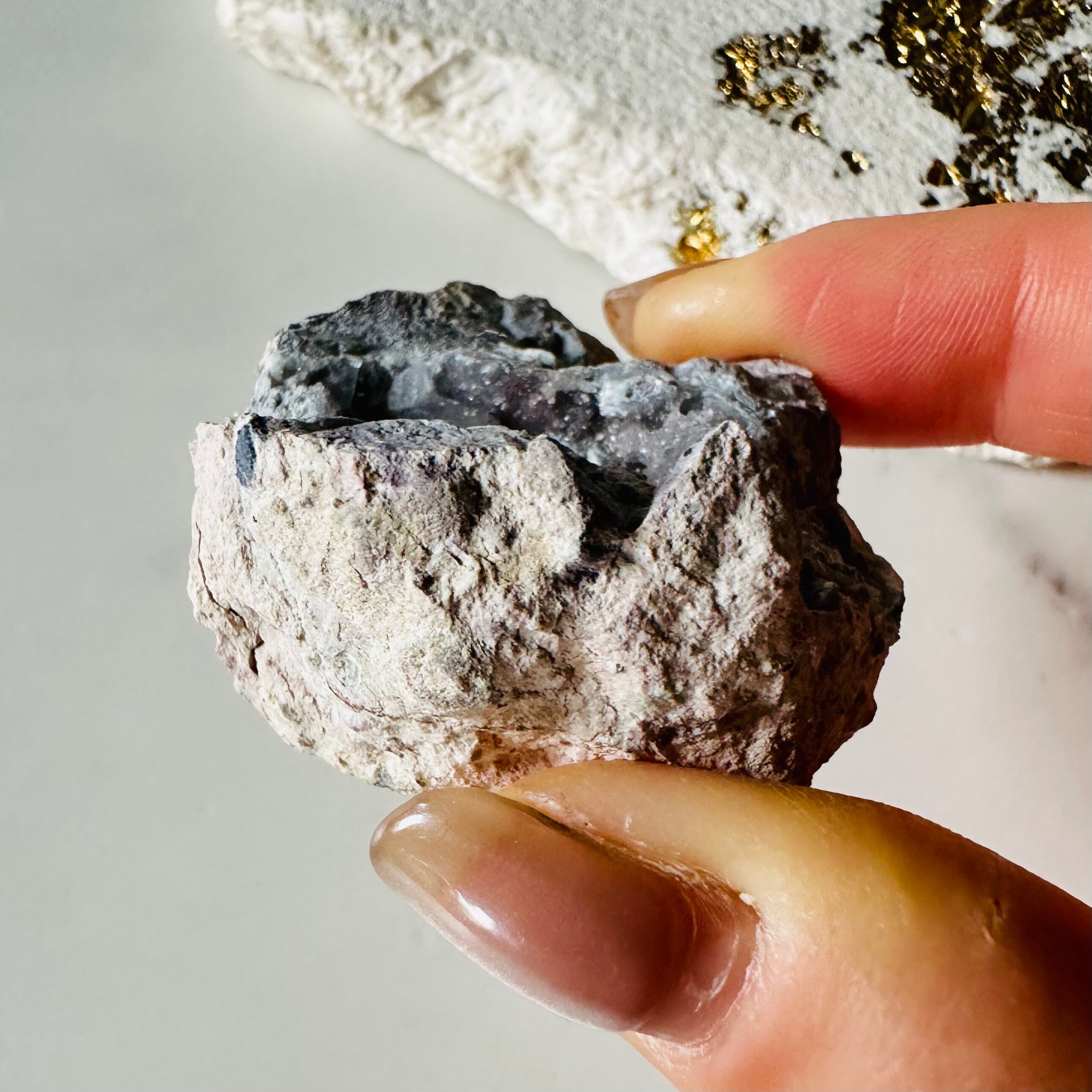 ソノラ産のジオードは透明感ある美しいアメジストの結晶が出てきます。母岩は柔らかく、内側を覗き込んでいるうちに、中の結晶を取り出したい欲求に駆られます。