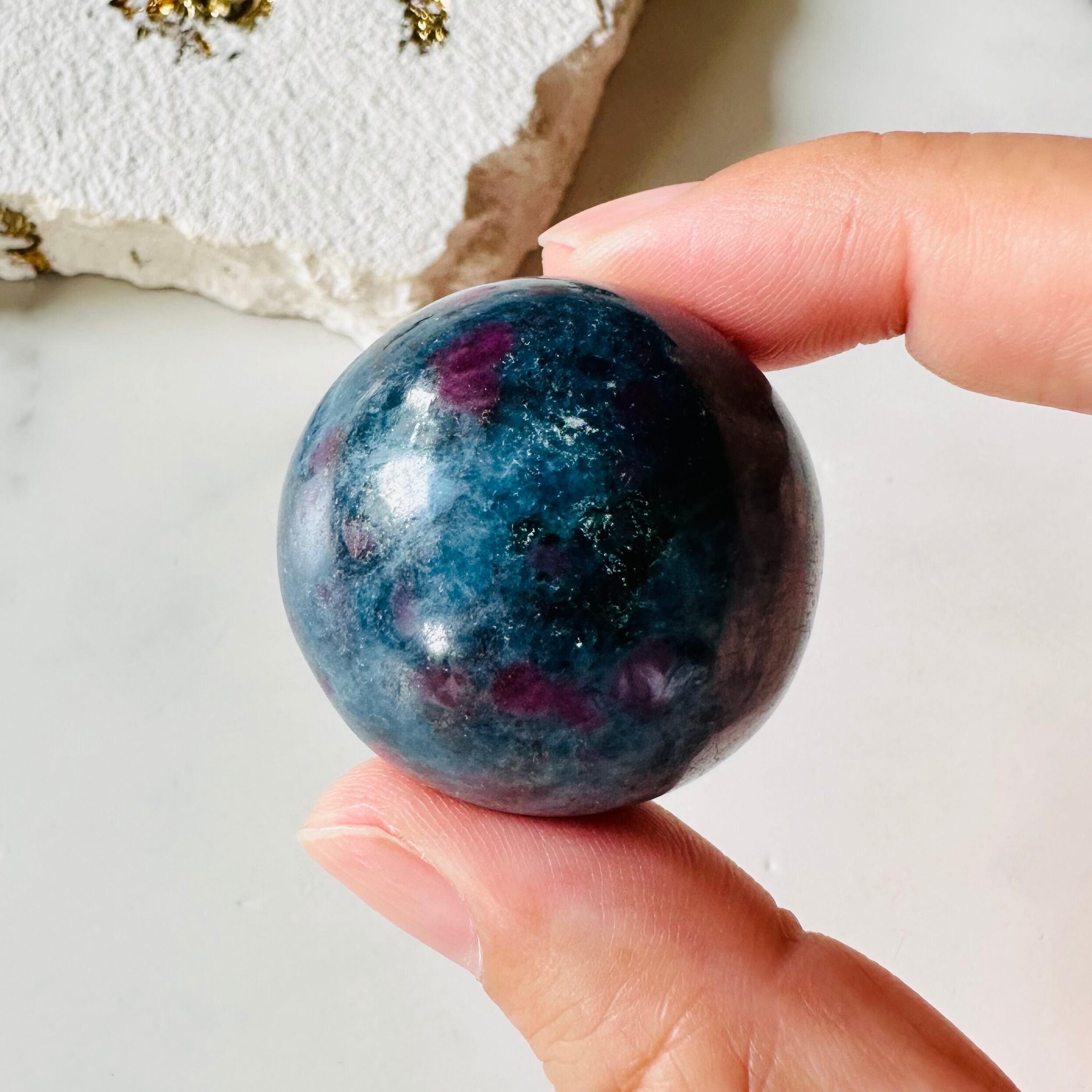 深いブルーのスフィアにルビーのピンクが散りばめられています。