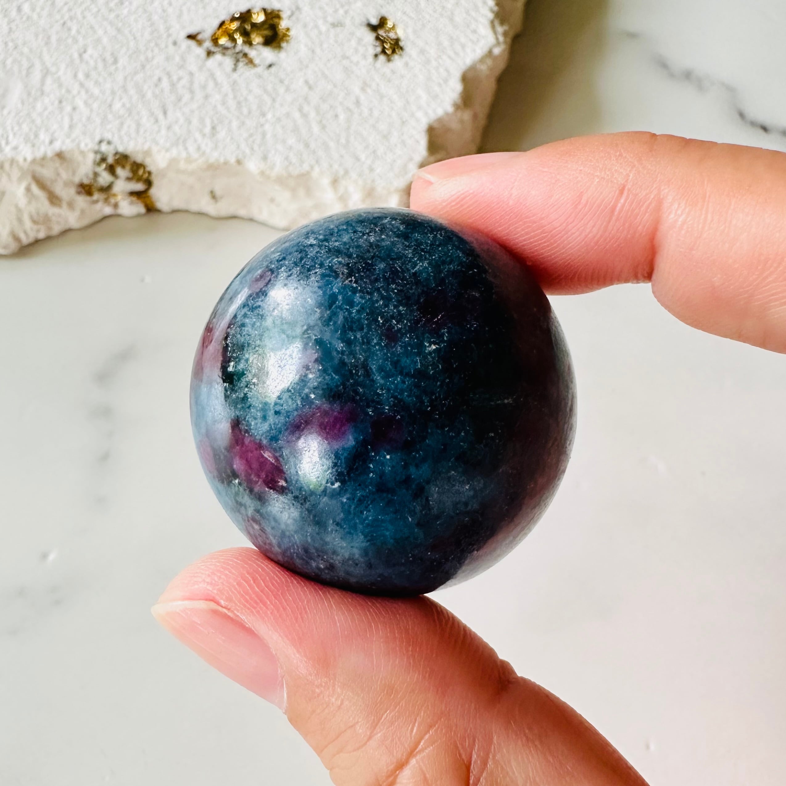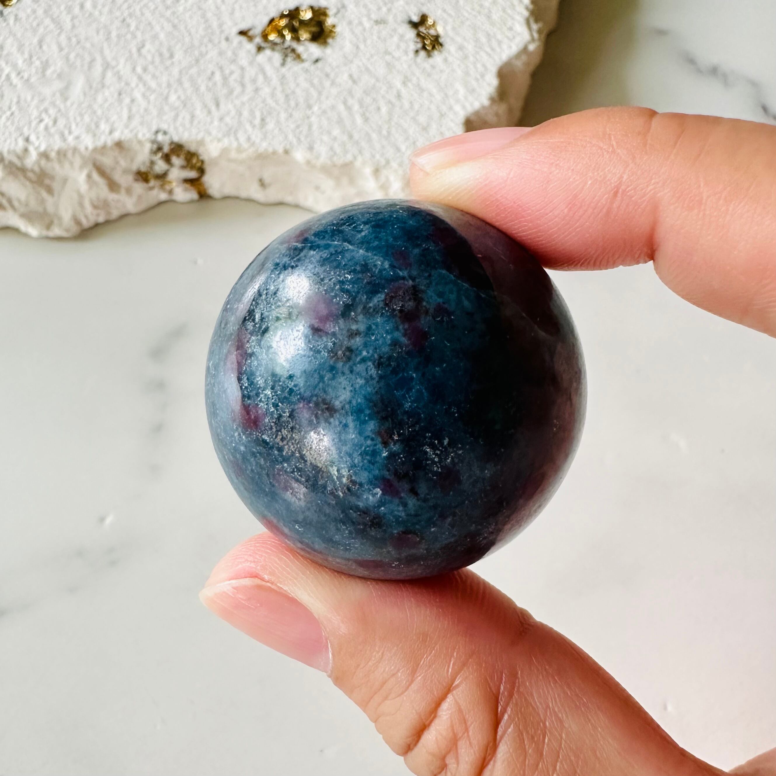 深いブルーのスフィアにルビーのピンクが散りばめられています。