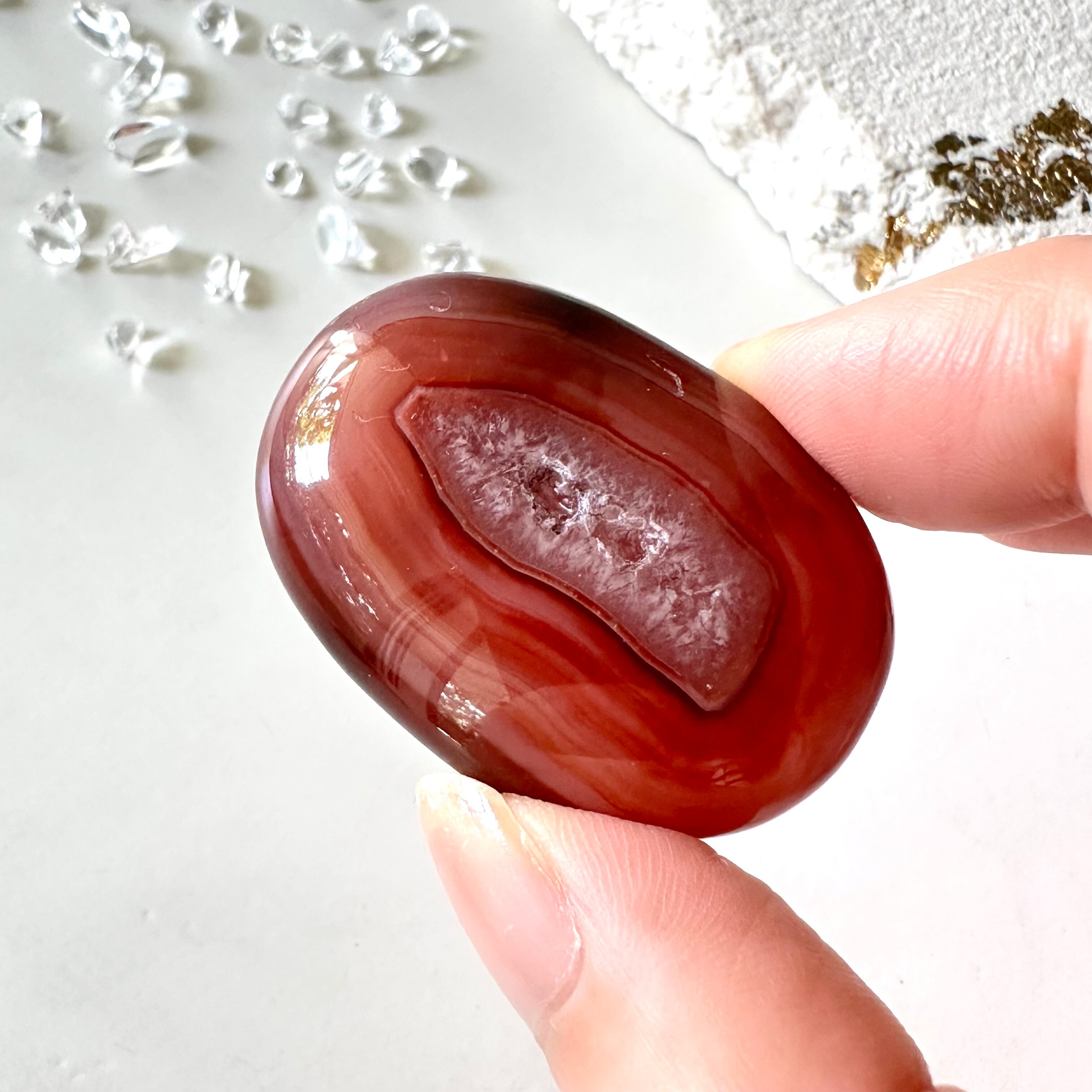 赤とオレンジの綺麗なパターンを持つカーネリアンのパームストーンです。