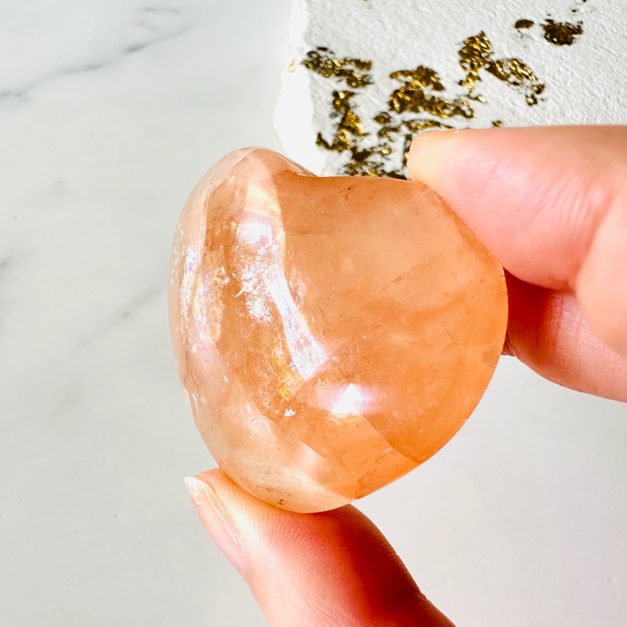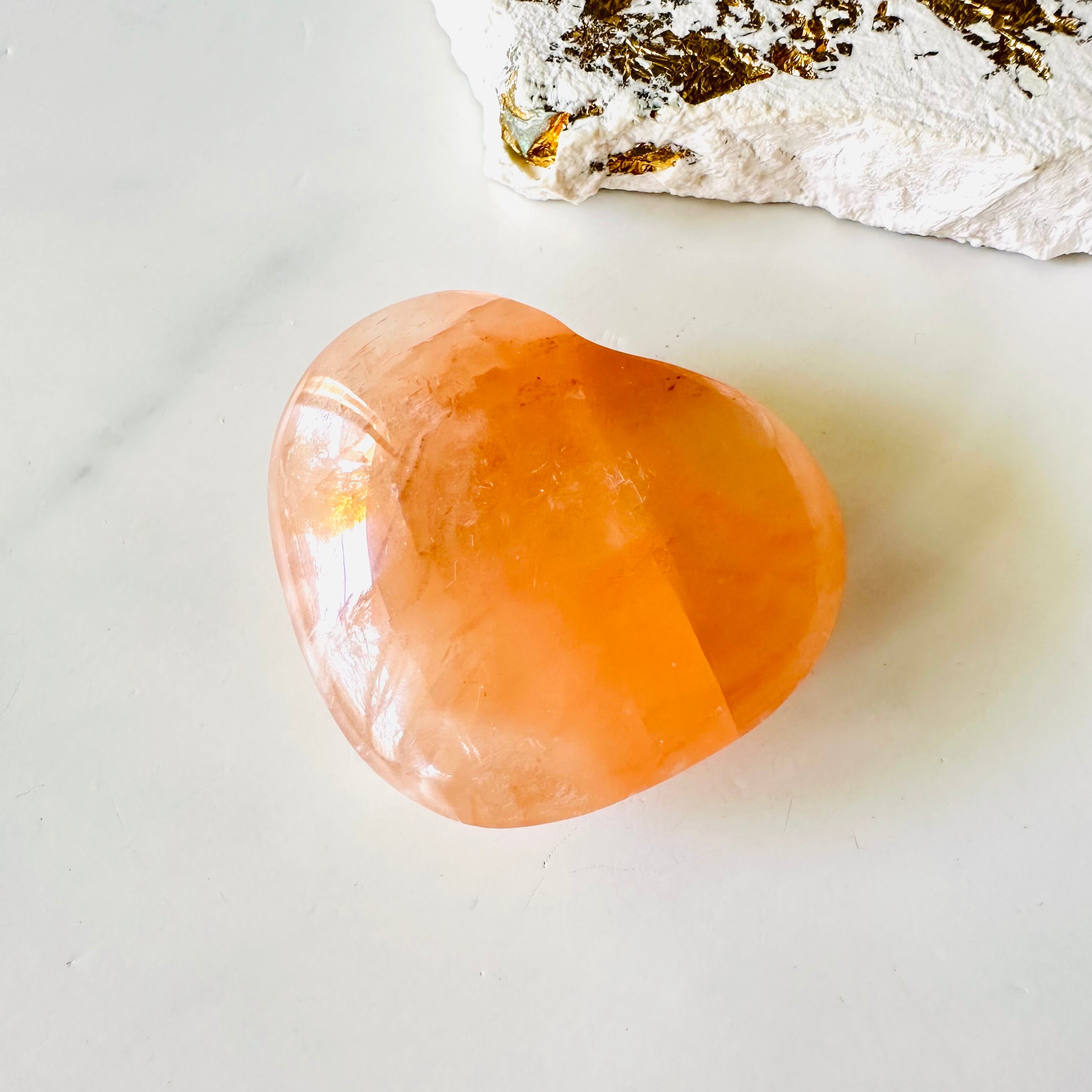 透け感のあるオレンジカルサイトのハート型ストーンです。フレッシュなオレンジゼリーのように瑞々しいオレンジで、傾けると両面にキラキラなシラーと虹が輝きます。