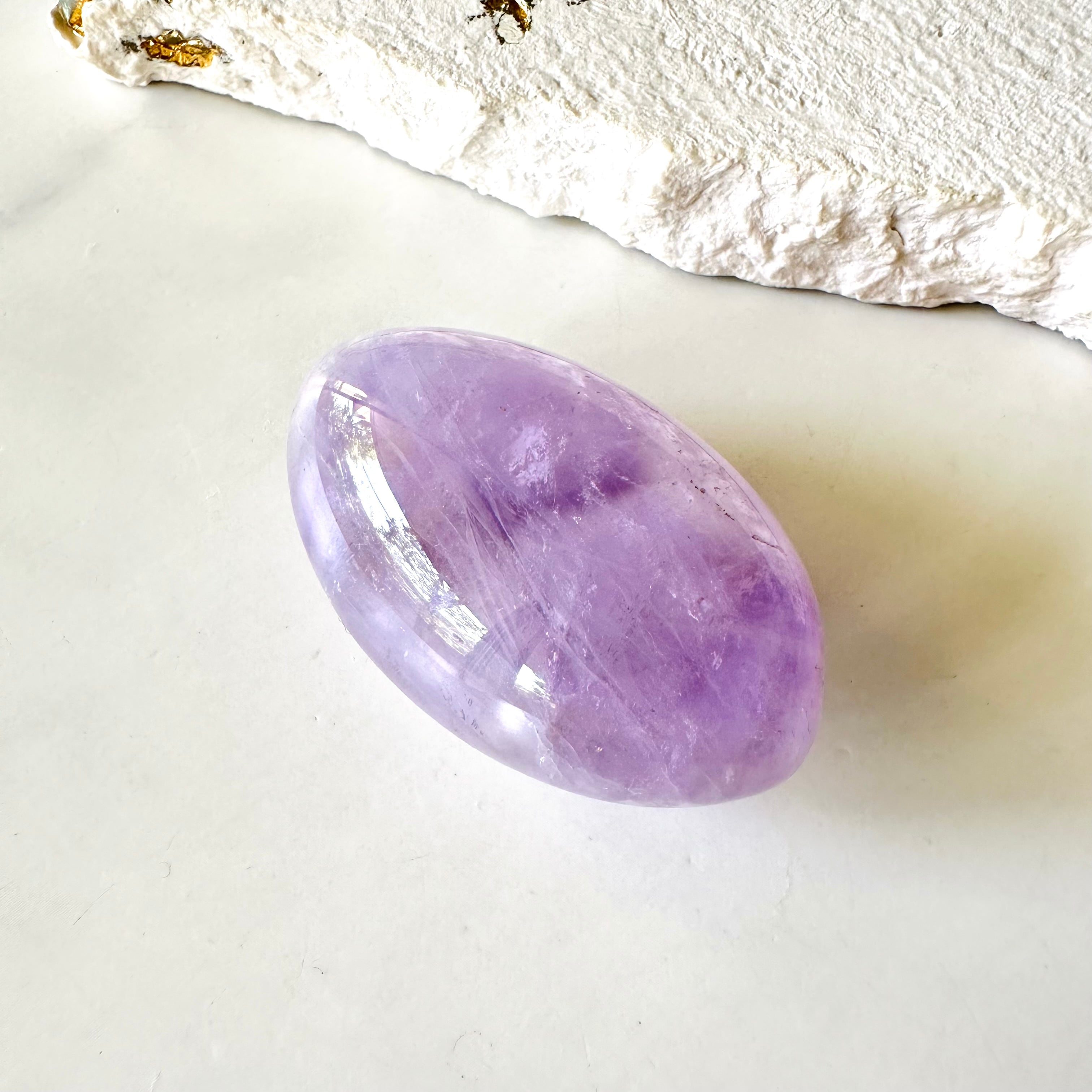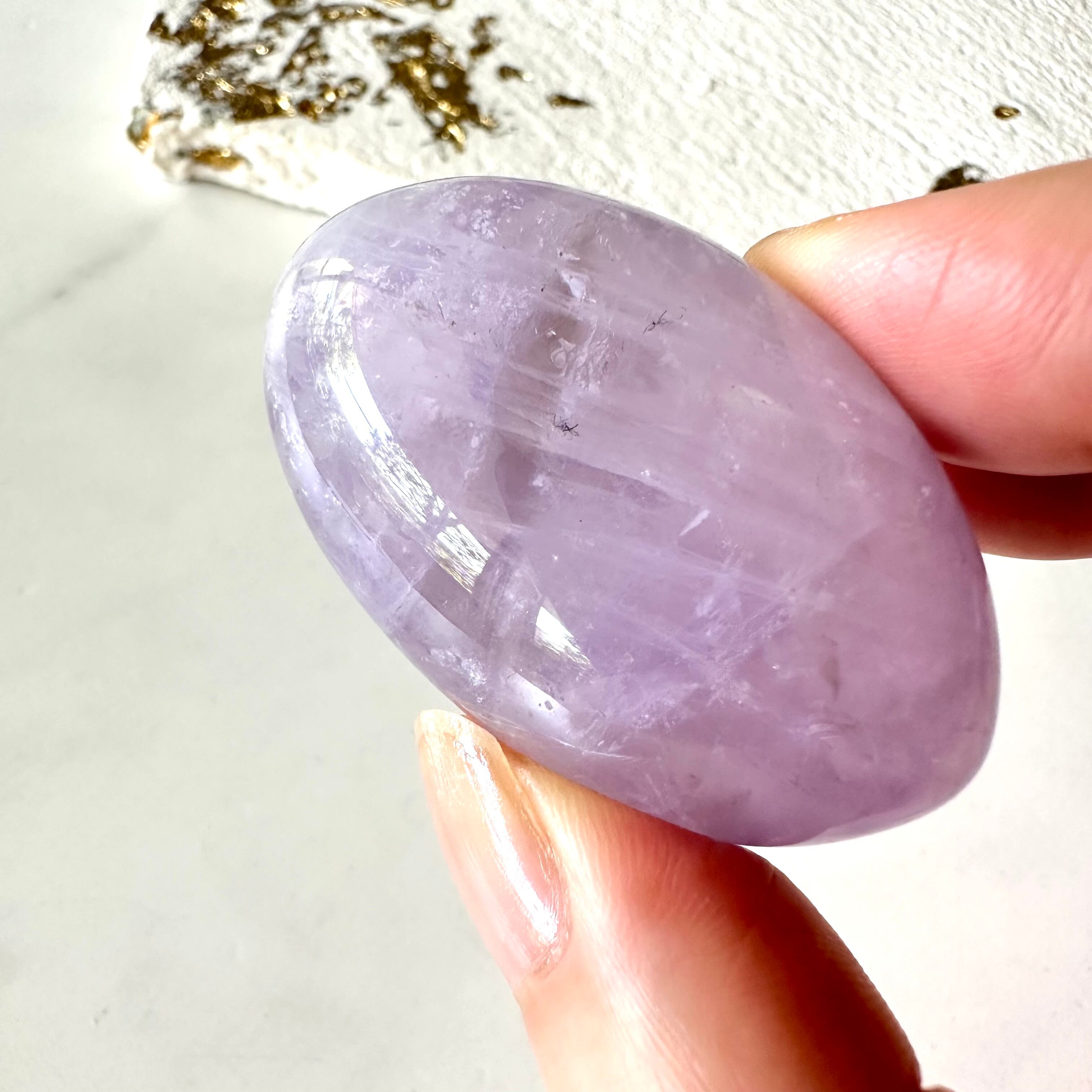 ラベンダーカラーが可愛いブラジル産アメジストのペブルです。シャリ感があり光を入れるとキラキラと輝き虹も入ります。
