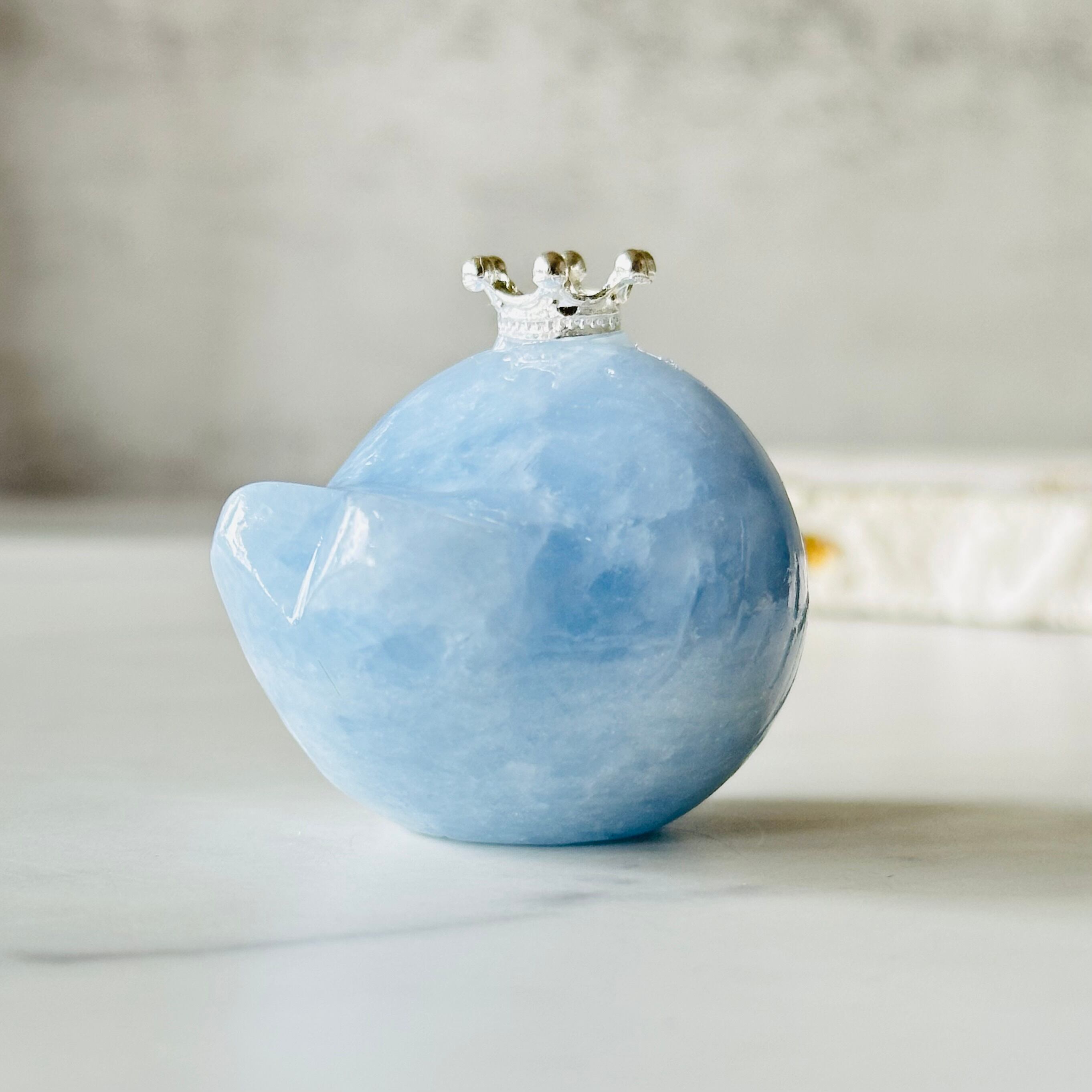 セレスタイトは青い空や澄んだ海を思わせる美しいブルーが特徴です。比較的柔らかい石なので、通常は原石のまま流通しています。このように生き物の形に加工されることは珍しいです。ベッドサイドにぜひ置いてほしいアイテムです。