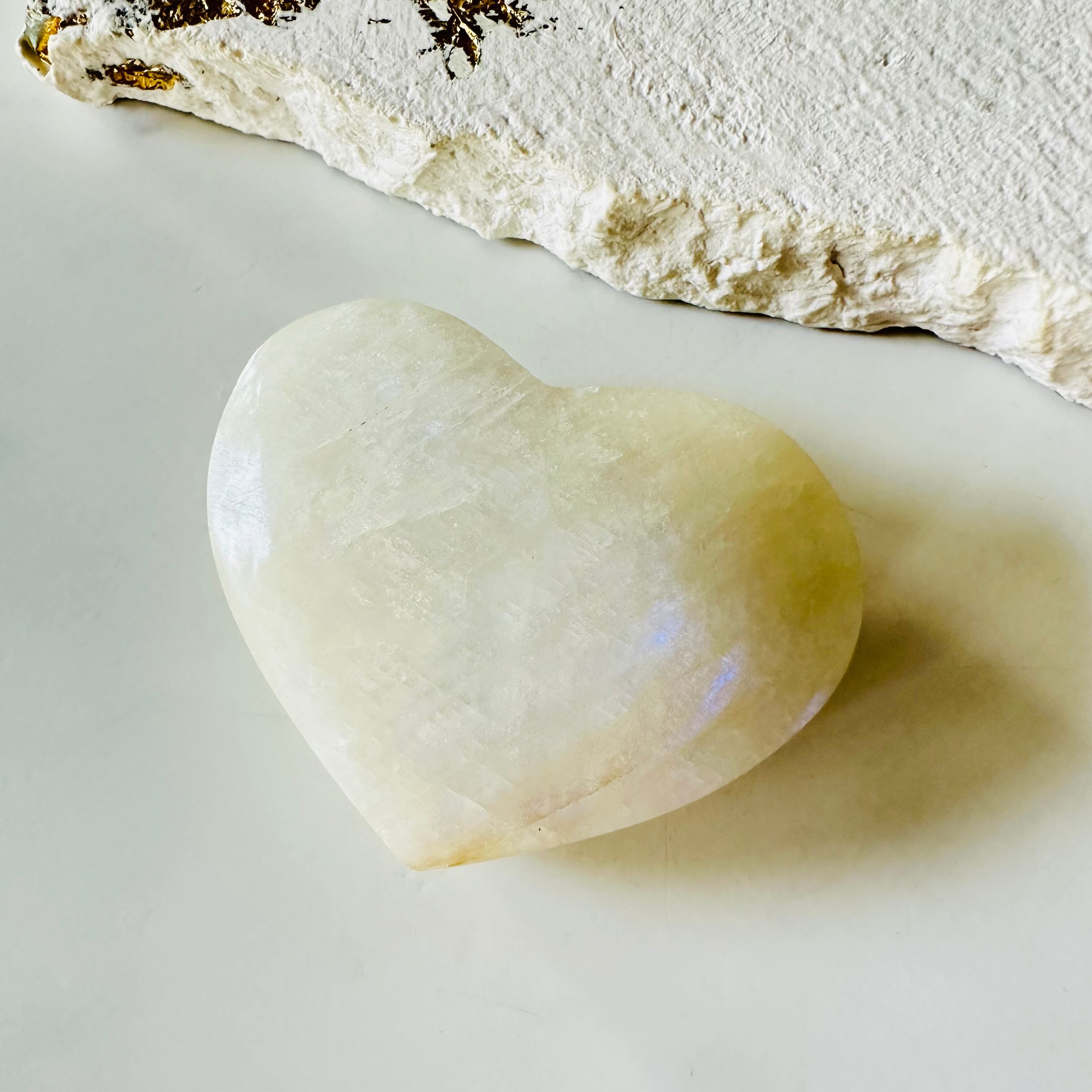 上品な青いシラーが美しい幻想的なムーンストーンのハート型ストーンです。ピュアホワイトのハートを傾けると、両面どちらも美しいブルーフラッシュが輝き始めます。石の表面に細かくキラキラ瞬くシルバーの煌めきも綺麗です。
