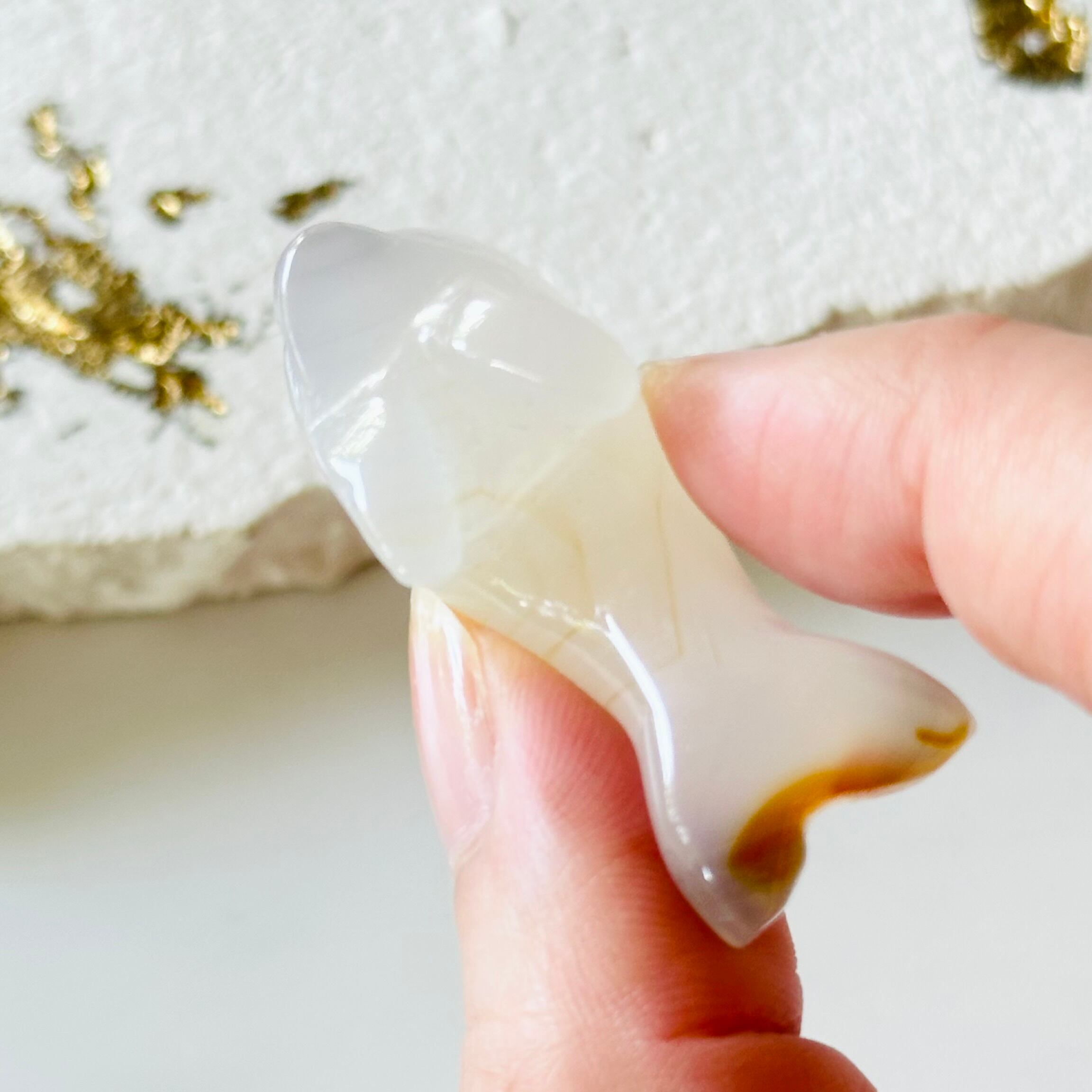 愛らしいフォルムのアゲートのイルカさん。アゲートは半透明で尻尾の部分のグレーとオレンジがアクセントになっています。くりっとした瞳が可愛らしい表情です。