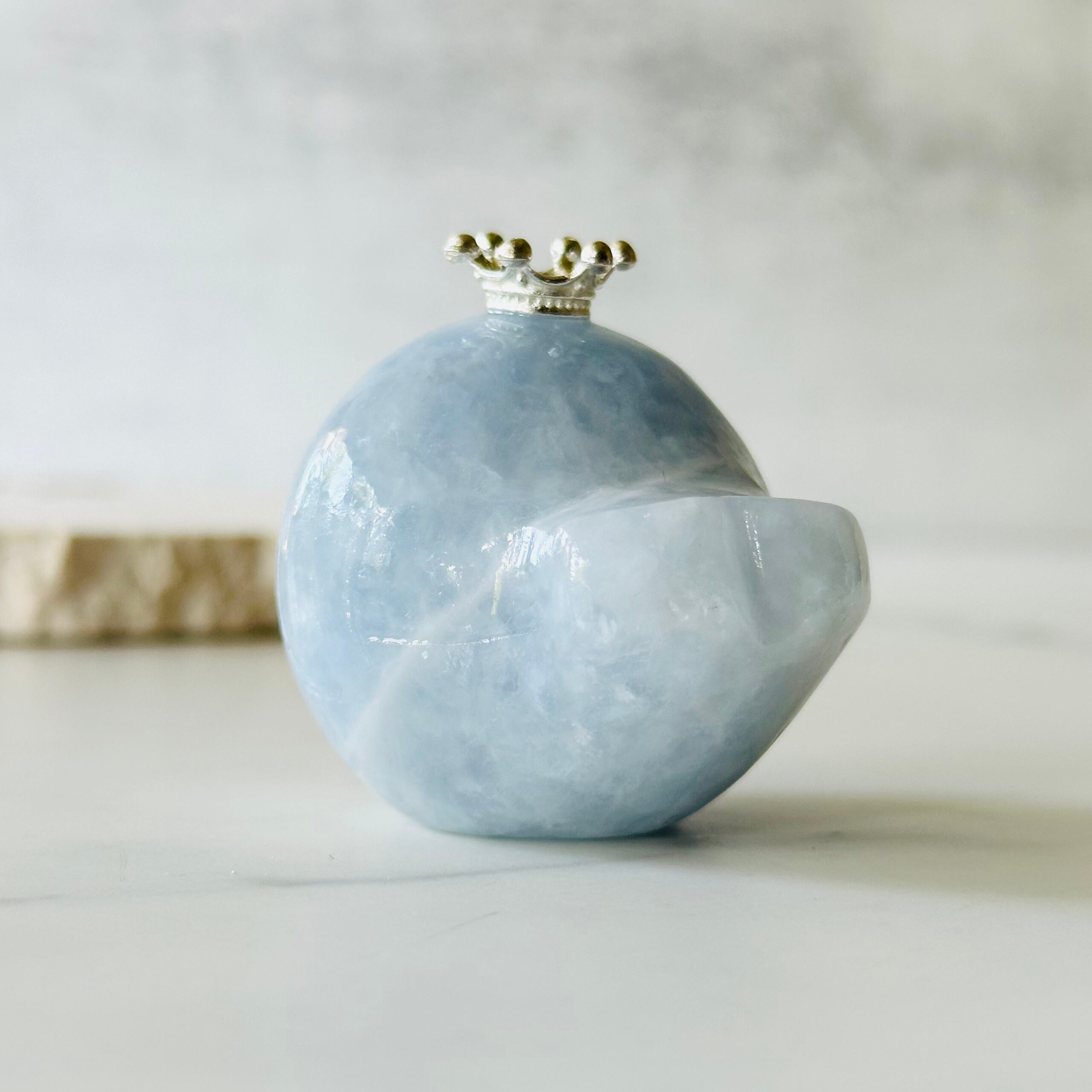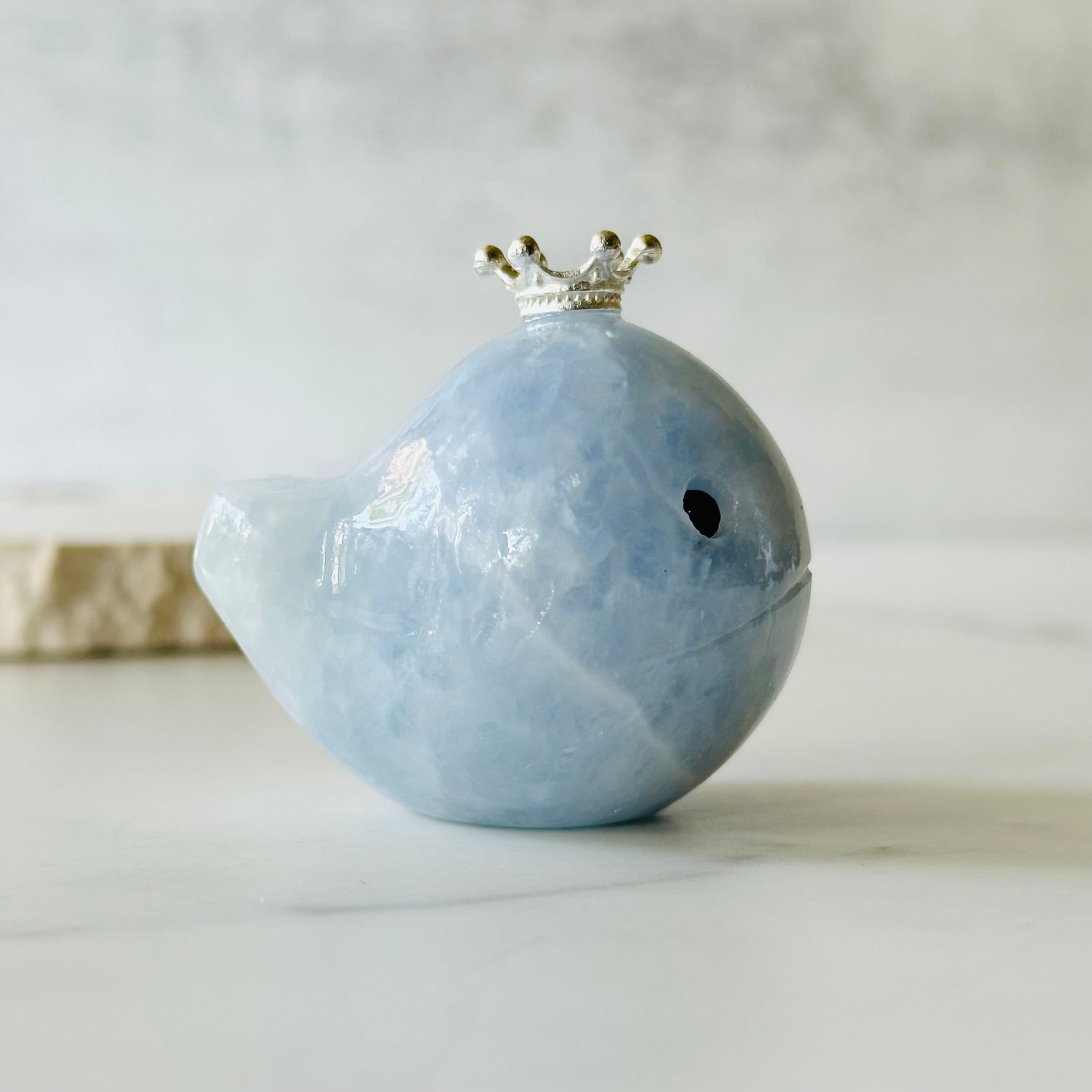 セレスタイトは青い空や澄んだ海を思わせる美しいブルーが特徴です。比較的柔らかい石なので、通常は原石のまま流通しています。このように生き物の形に加工されることは珍しいです。ベッドサイドにぜひ置いてほしいアイテムです。