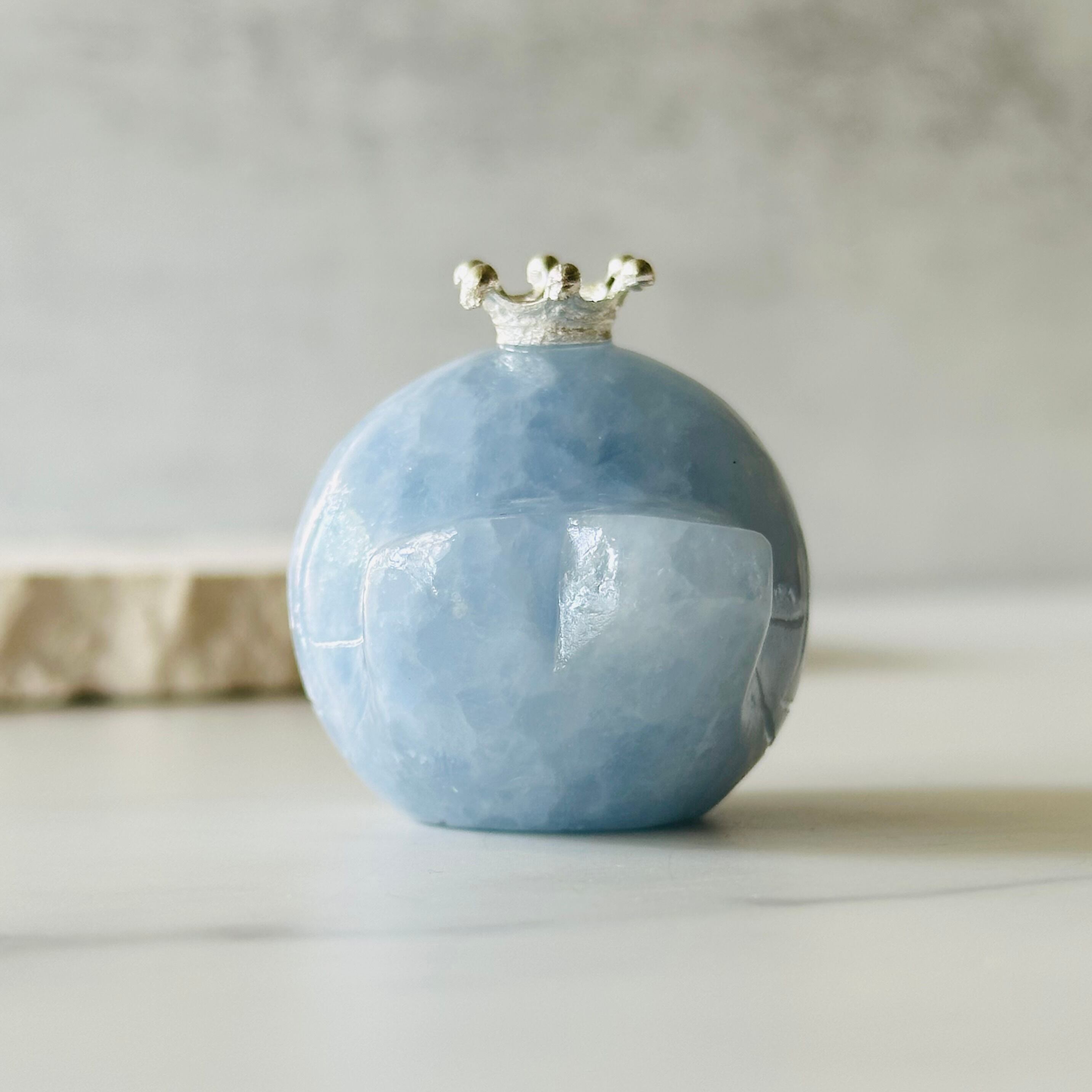 セレスタイトは青い空や澄んだ海を思わせる美しいブルーが特徴です。比較的柔らかい石なので、通常は原石のまま流通しています。このように生き物の形に加工されることは珍しいです。ベッドサイドにぜひ置いてほしいアイテムです。