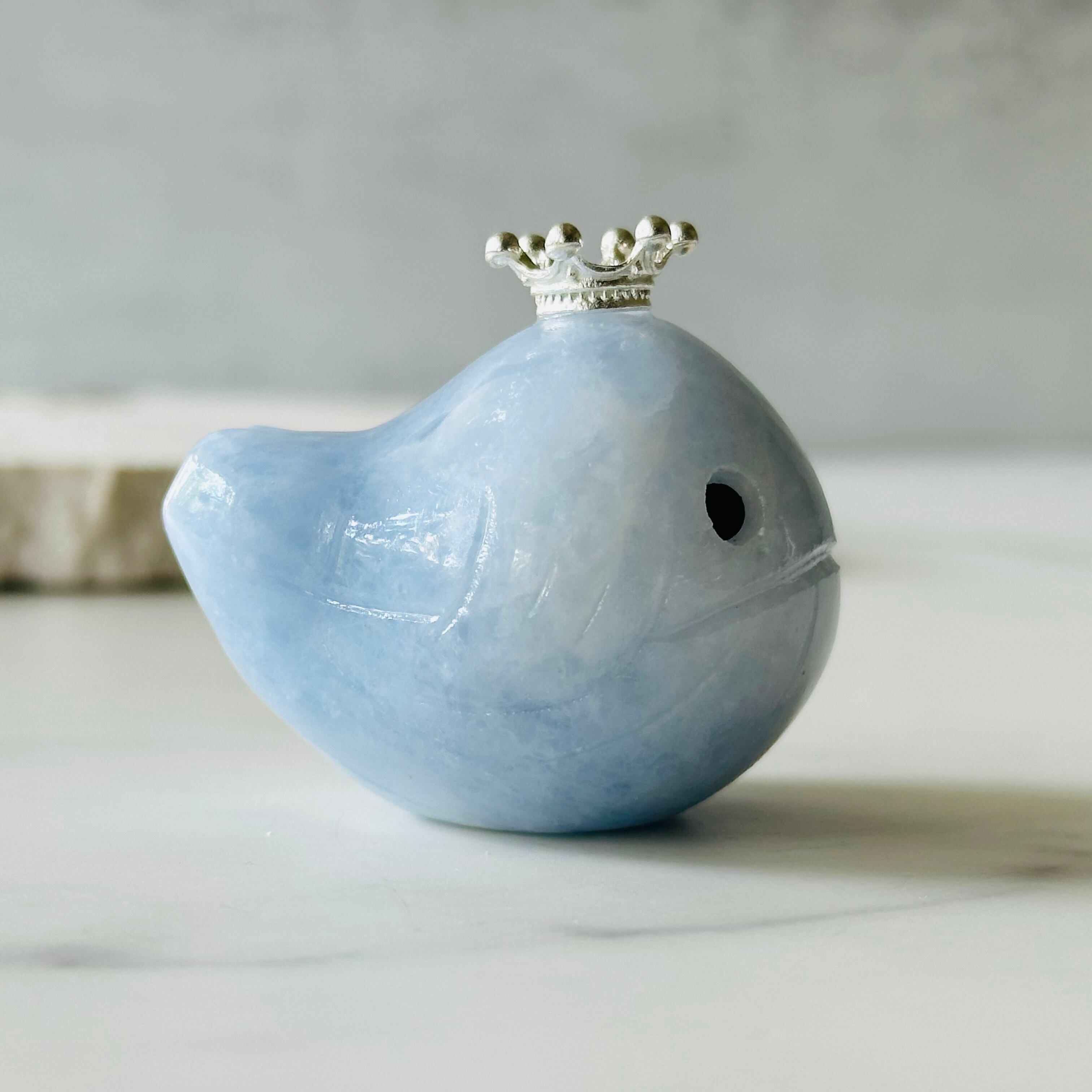 セレスタイトは青い空や澄んだ海を思わせる美しいブルーが特徴です。比較的柔らかい石なので、通常は原石のまま流通しています。このように生き物の形に加工されることは珍しいです。ベッドサイドにぜひ置いてほしいアイテムです。