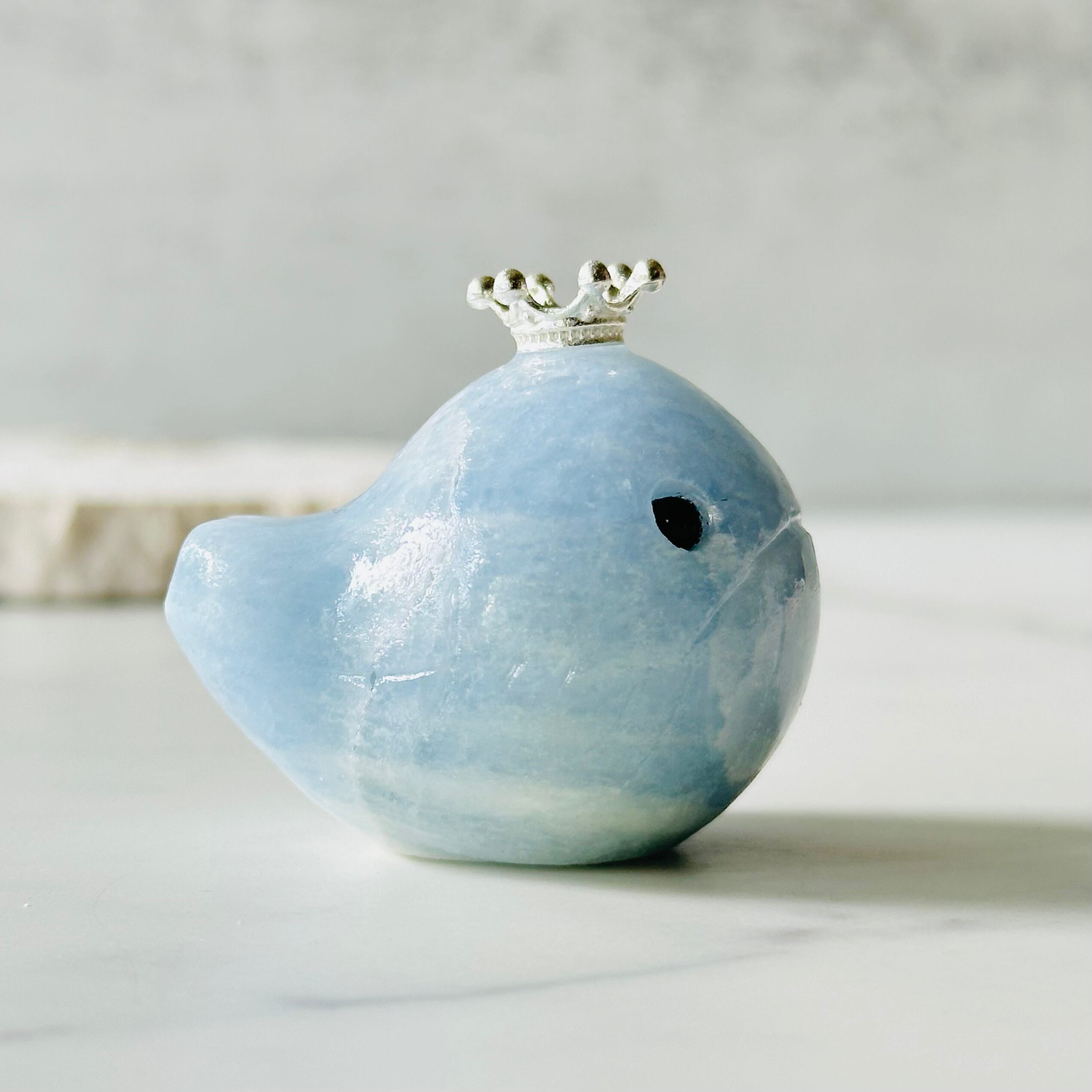 セレスタイトは青い空や澄んだ海を思わせる美しいブルーが特徴です。比較的柔らかい石なので、通常は原石のまま流通しています。このように生き物の形に加工されることは珍しいです。ベッドサイドにぜひ置いてほしいアイテムです。