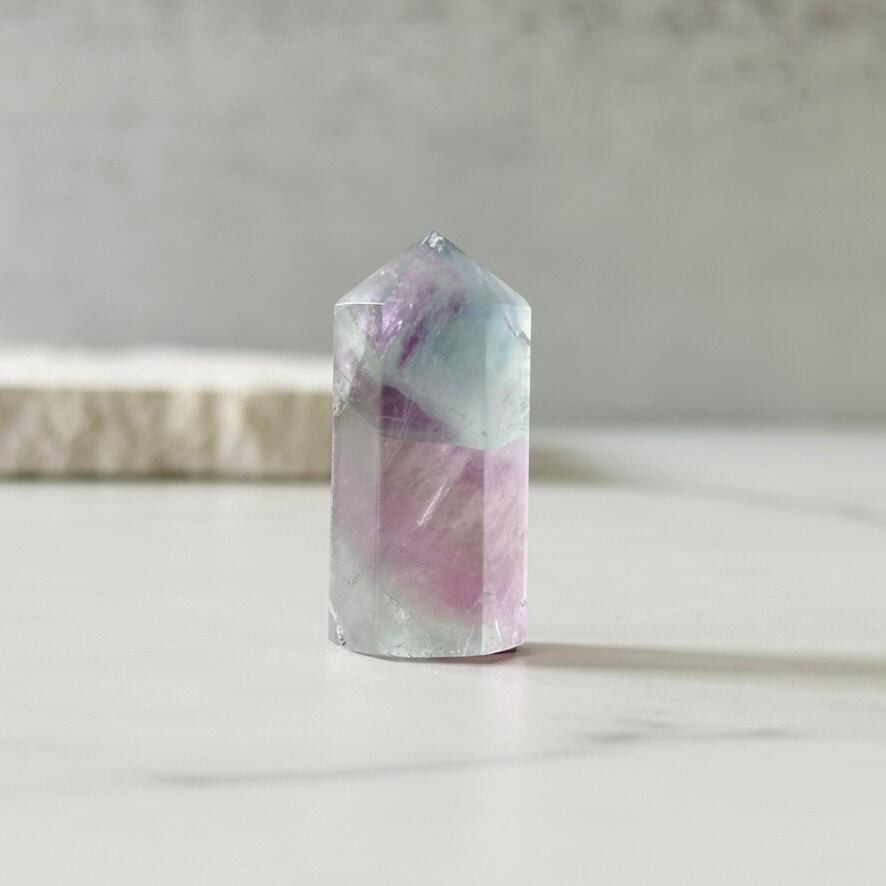 透明感の高いフローライトのミニポイントです。パープルとグリーンのバイカラーで神秘的な印象のアイテムです。綺麗な虹も見られます。