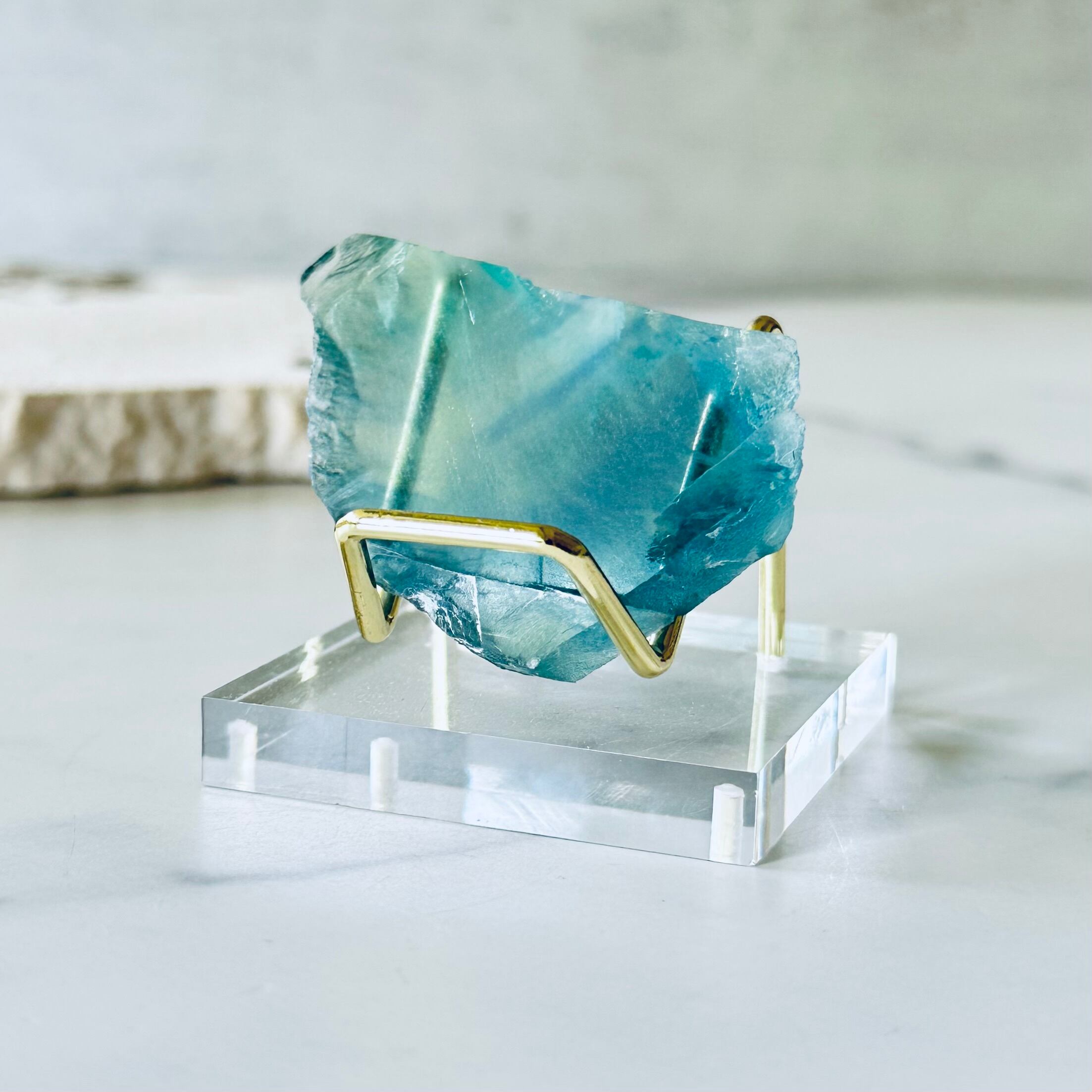 珍しいブルーフローライトのスラブ。南国の透き通った海のような美しいブルーグリーンが魅力です。表面はすべすべとしていて、傾けると虹が浮かび上がります。太陽の光をたっぷりと入れて楽しんでください。