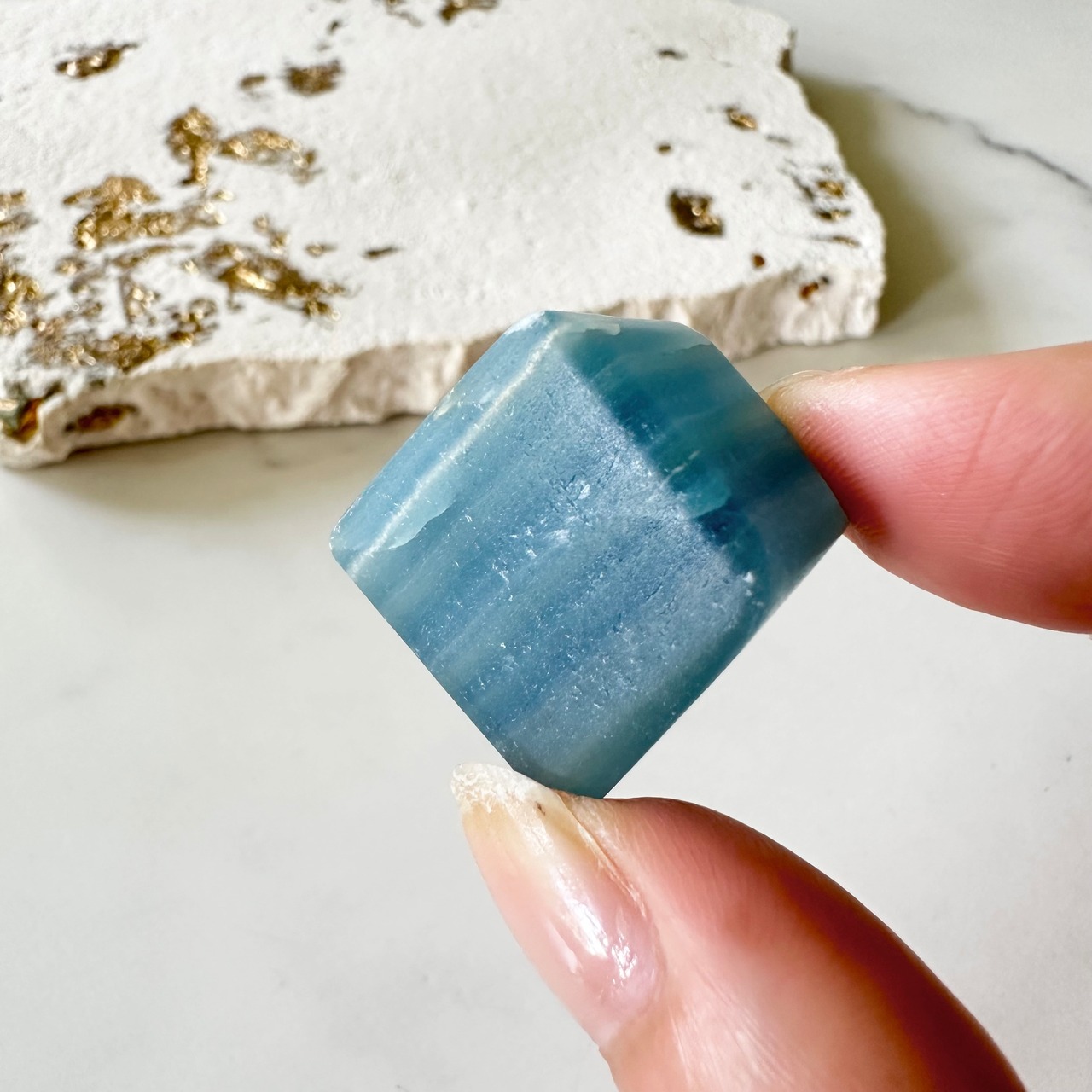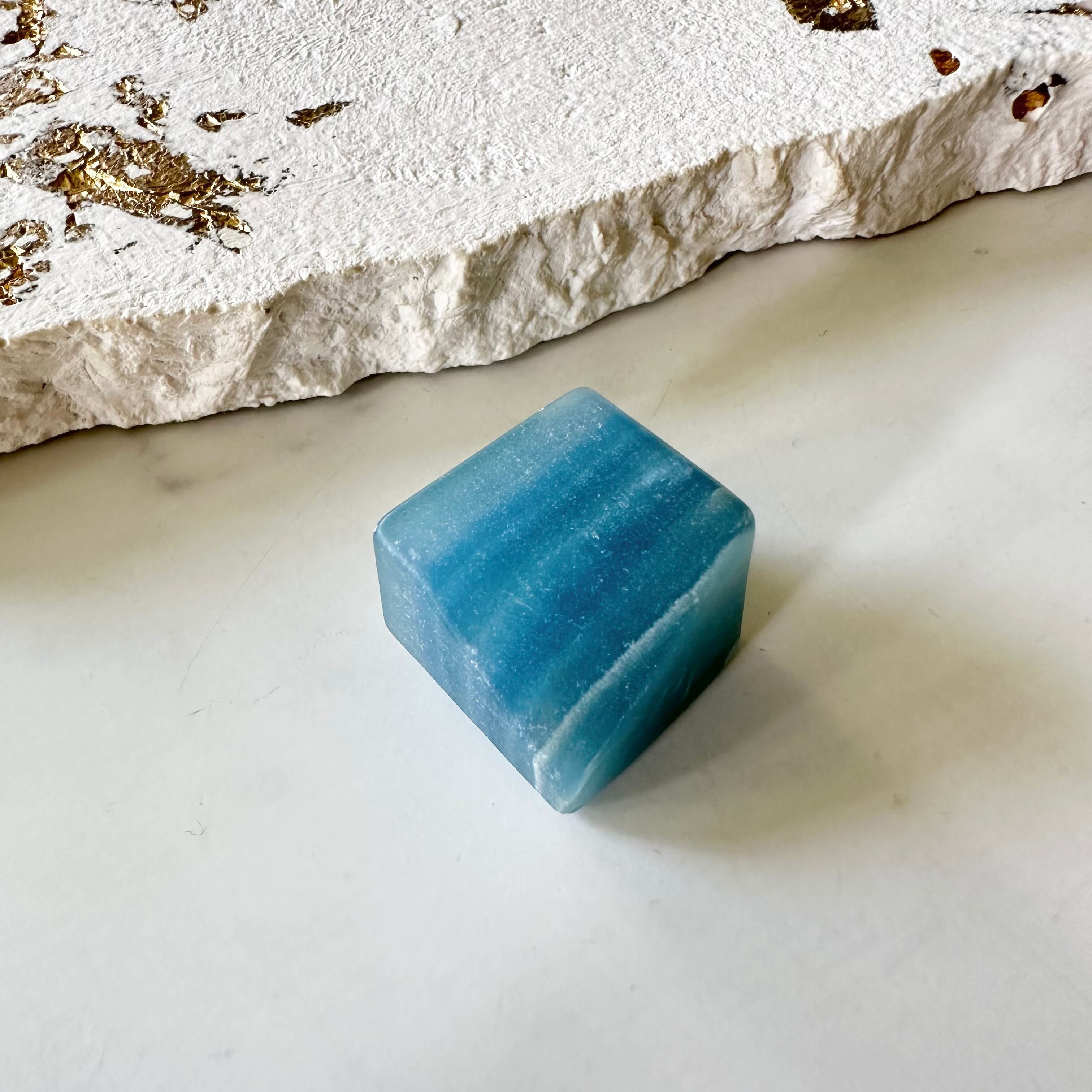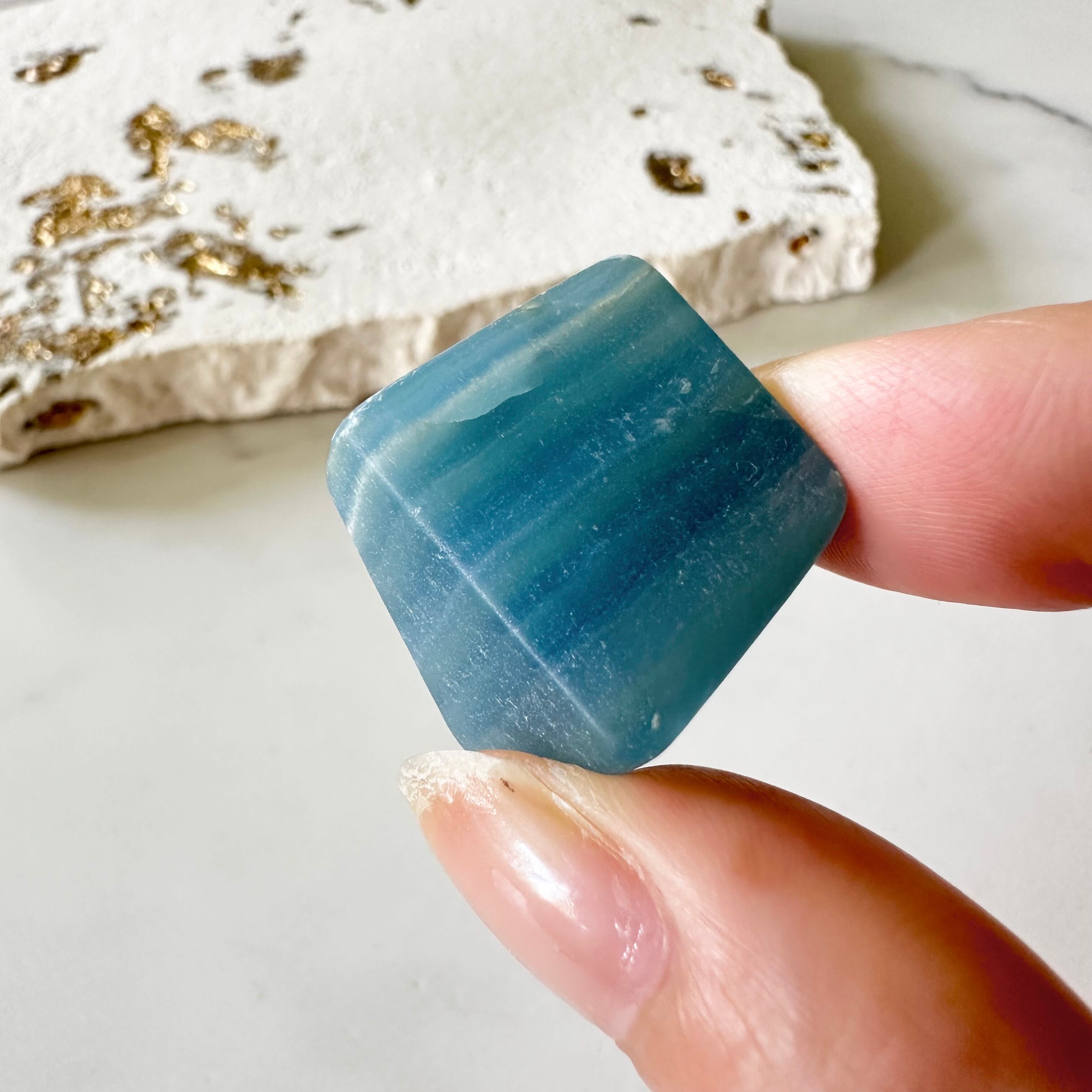 透け感のあるブルーが美しいブルーオニキス。断面から重なり合った層の縞模様をみることができます。さらさらした石の表面をなぞると不思議と心が落ち着きます。