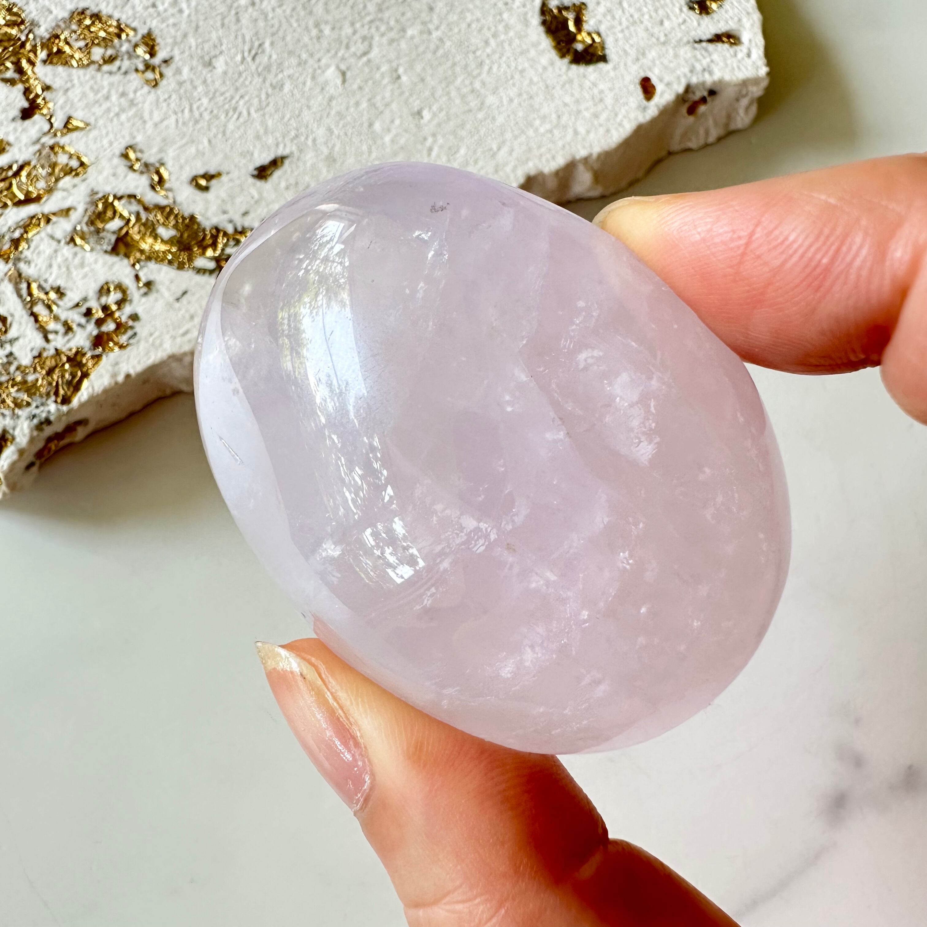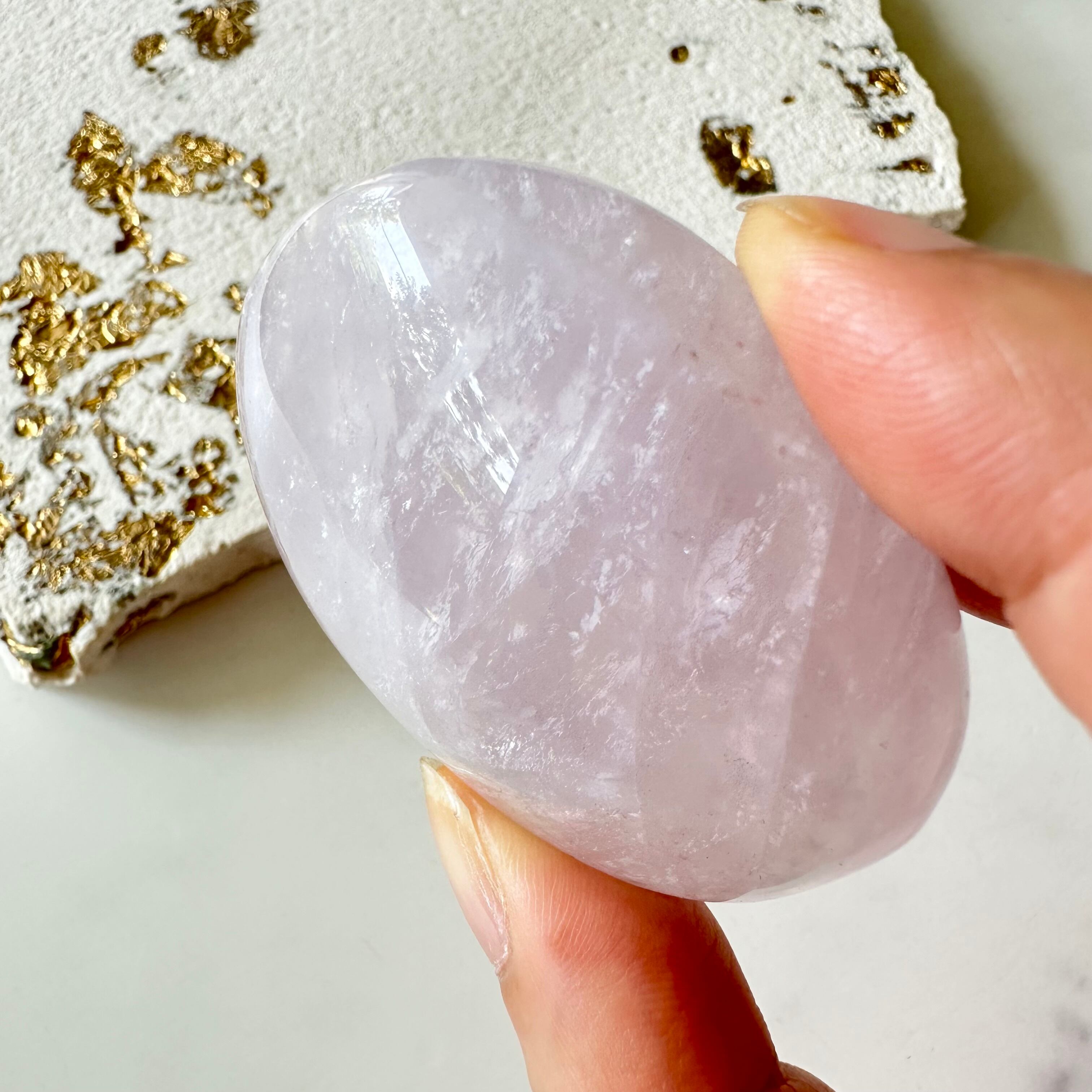 淡いラベンダーピンクのペリウィンクルローズクォーツのパームストーンです。
