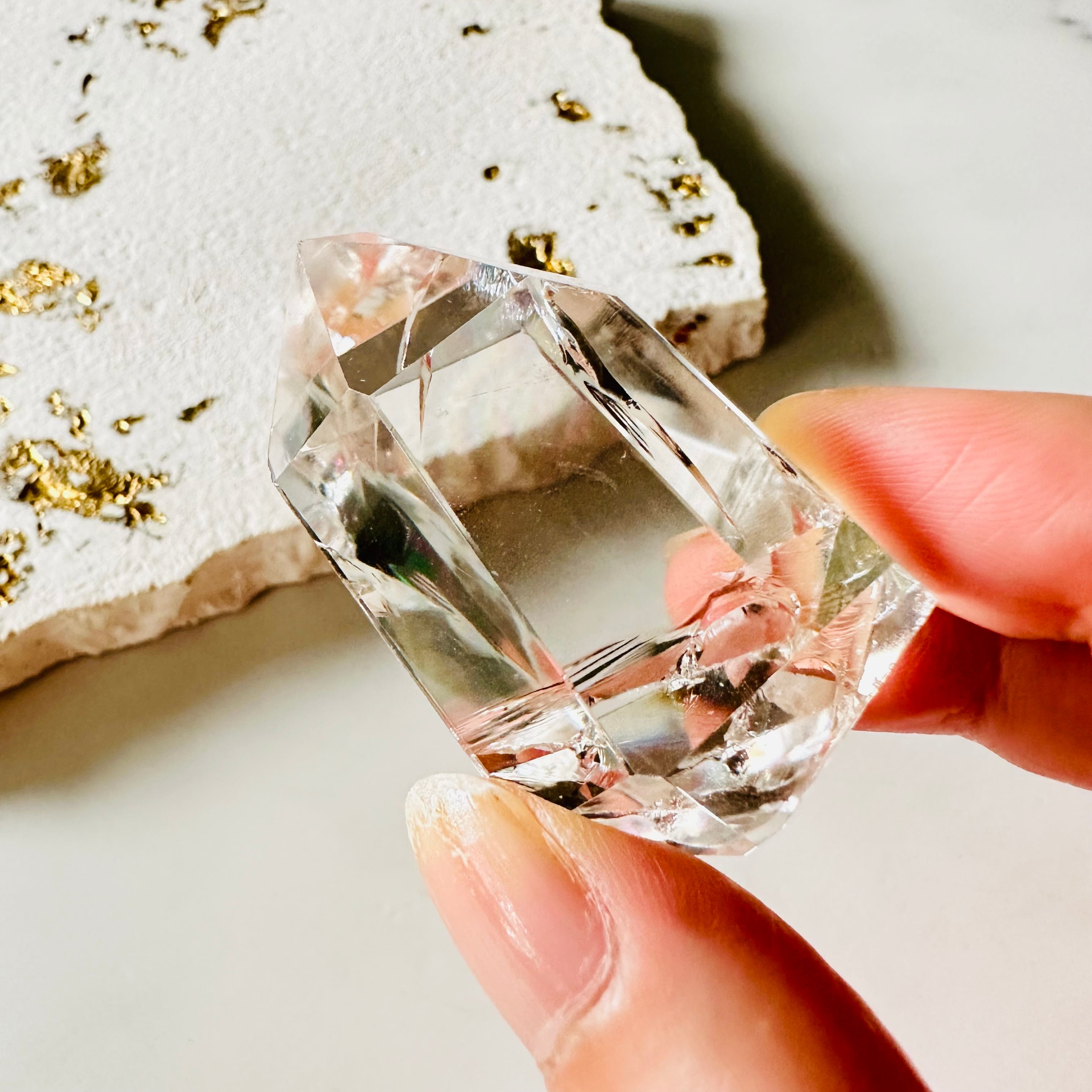 クリアなクォーツに宝石のようなカット、クラックから放たれるクッキリとした虹が魅力的です。カラーレスの水晶は飽きることなく、季節を問わず、他のどんな石とも相性が良く、長く愛し楽しめるアイテムです。