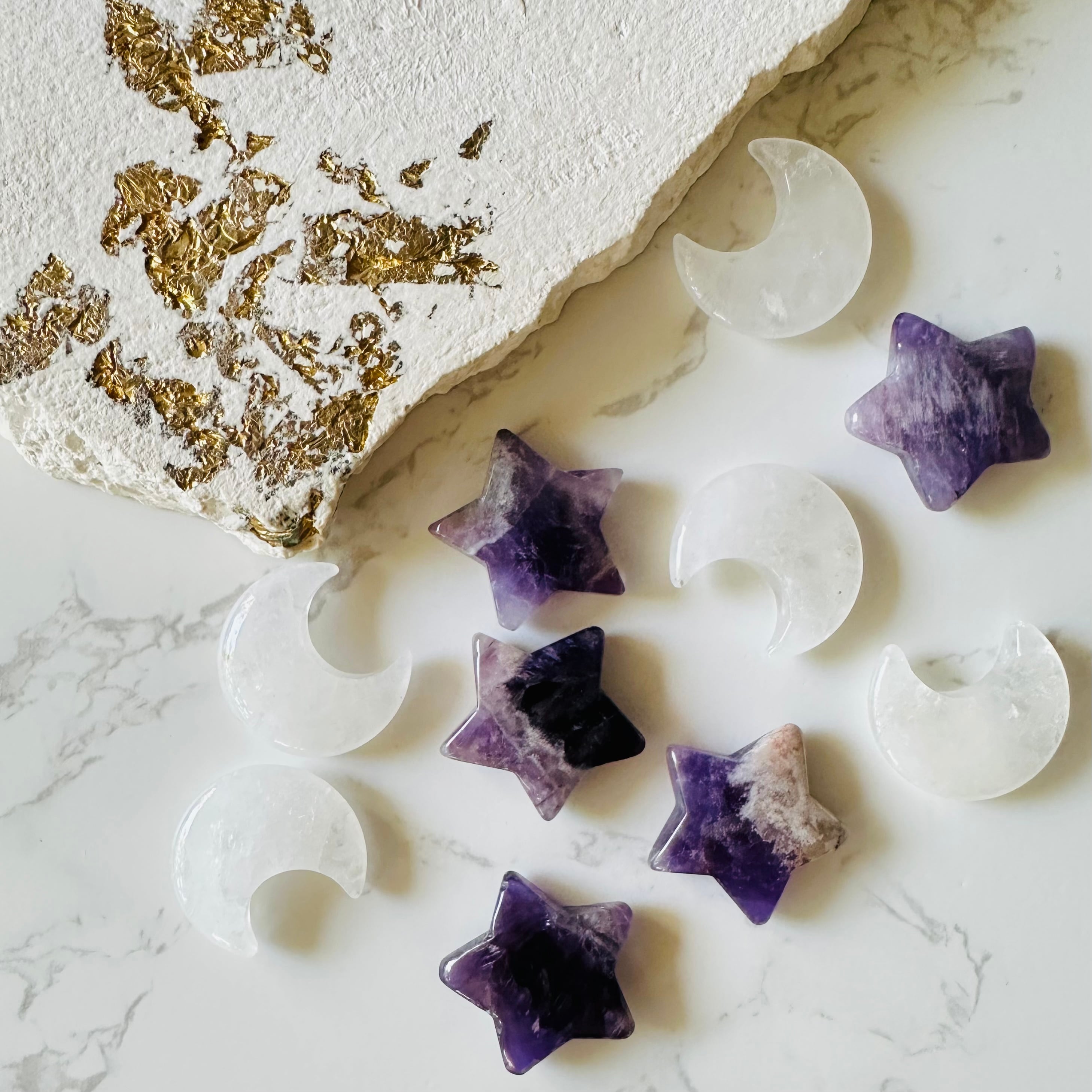 アメジストとクリアクォーツの月と星をセットにしたミニストーンセットです。